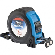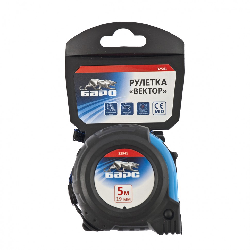 Рулетка Барс Вектор 32541 с утолщенным полотном 5 м х 19 мм и магнитным зацепом, в обрезиненном корпусе, используется при проведении линейных измерений. Незаменима в хозяйстве и на строительной площадке для вычисления размеров заготовок, конструкций и т.д.ПреимуществаКорпус выполнен из ABS-пластика и имеет резиновый чехол, что обеспечивает защиту от ударного воздействия.Долговечность механизма рулетки гарантирует рабочая пружина из стали 60 Mn.Высокий ресурс полотна достигается за счет его утолщения и ширины 19 мм.Магнитный зацеп на полотне обеспечивает возможность фиксации с металлическими поверхностями.Полотно покрыто белой краской и имеет крупную шкалу, благодаря чему результаты измерений легко считываются.Рулетка оснащена нейлоновым ремешком и клипсой для удобства работы и транспортировки.