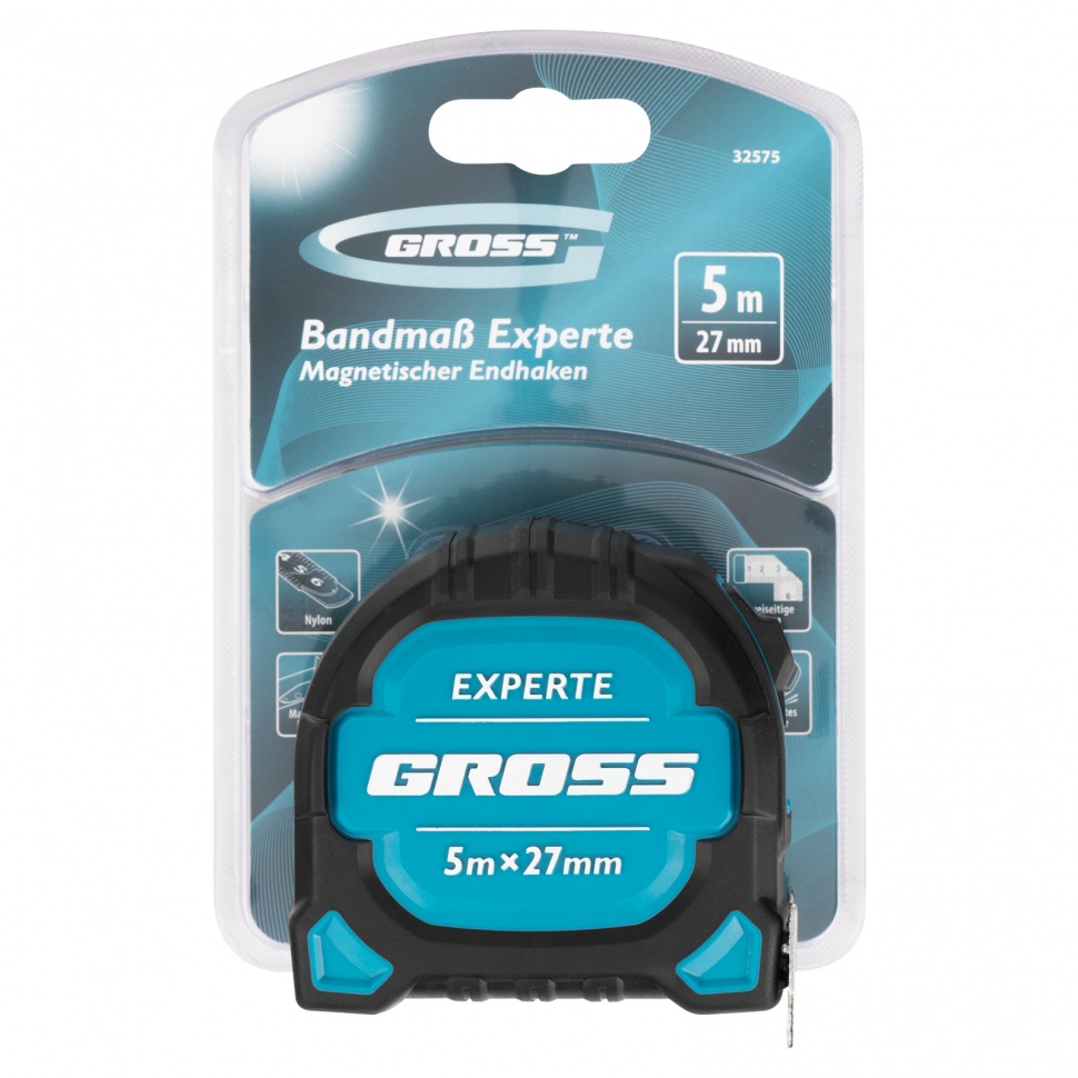 Рулетка Gross «Experte» 32575 с полотном 5 м х 27 мм, в двухкомпонентном корпусе, с двухсторонней разметкой и нейлоновым покрытием ленты, пригодится во время проведения ремонтных и строительных работ. С ее помощью можно измерять заготовки, материалы, конструкции и т.д. Благодаря магнитному зацепу рулетка оптимальна для работы с металлическими поверхностями, а широкое упругое полотно удобно для выполнения измерений в труднодоступных местах.ПреимуществаВысокая точность измерений — за счет подвижного зацепа отметка «0» всегда совпадает с краем измеряемой детали.Долговечность — нейлоновое покрытие увеличивает износостойкость ленты.Удобная эксплуатация — двойной зацеп и двухсторонняя шкала упрощают работу.Прочность и эргономичность — двухкомпонентный корпус с обрезиненным покрытием устойчив к ударному воздействию, а также удобно лежит в руке и не выскальзывает из ладони.