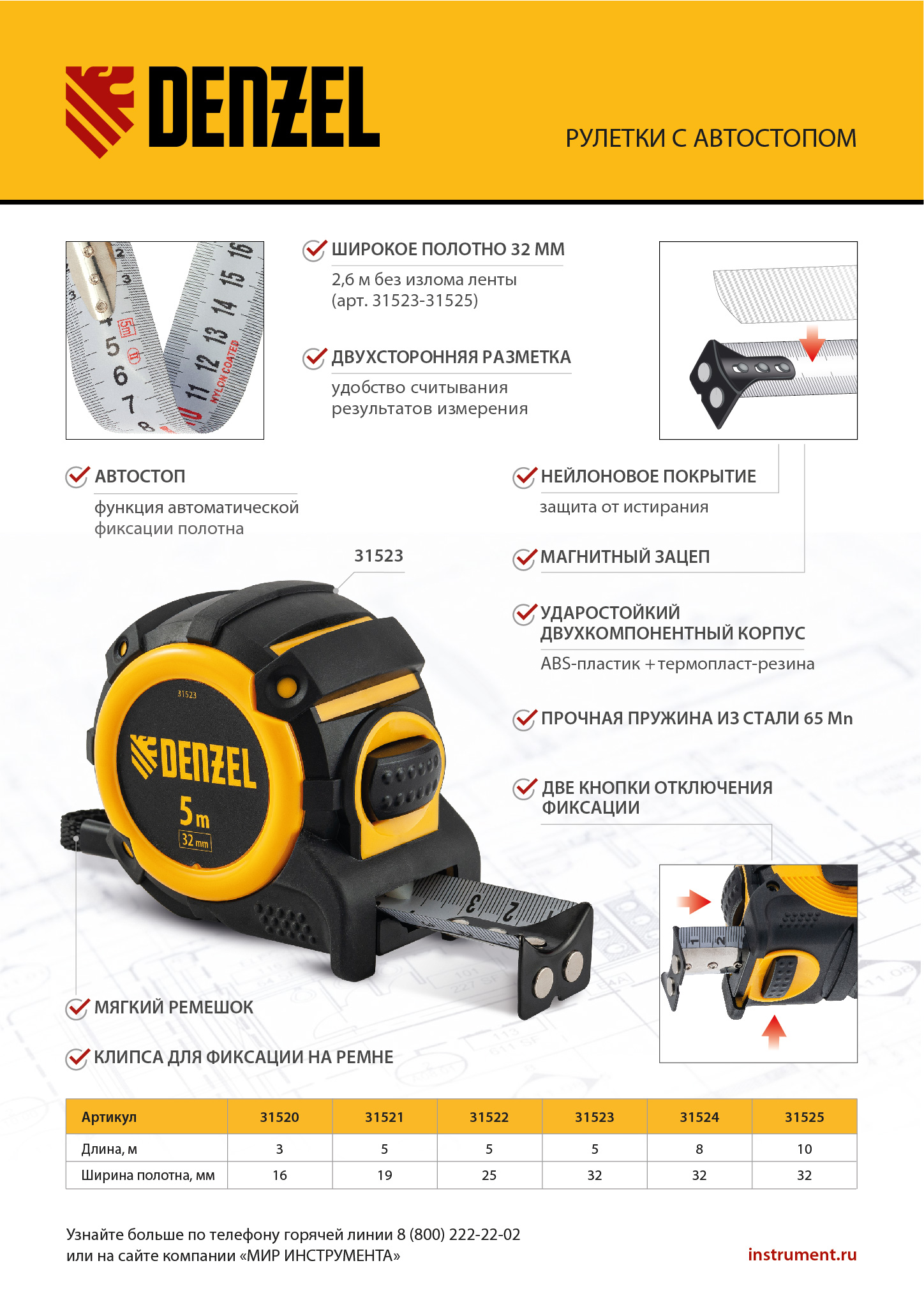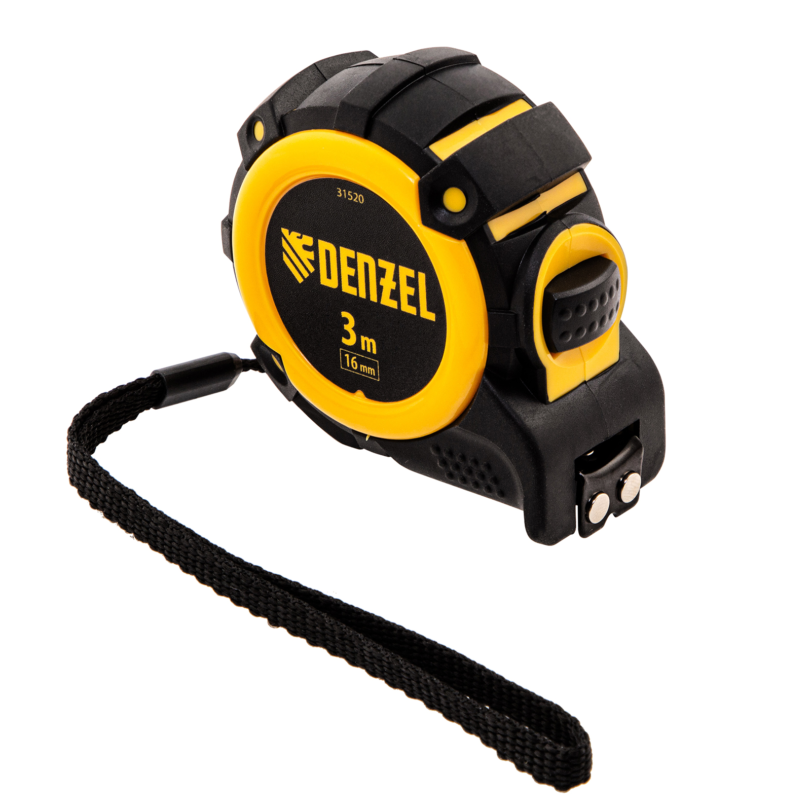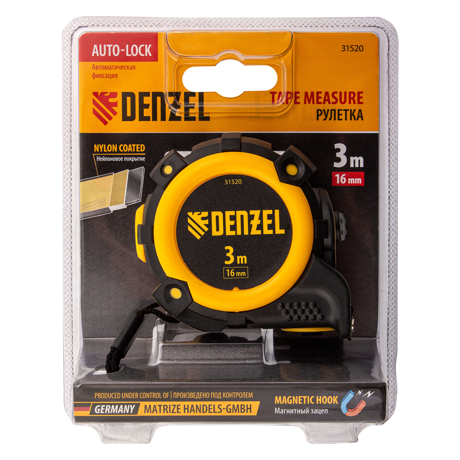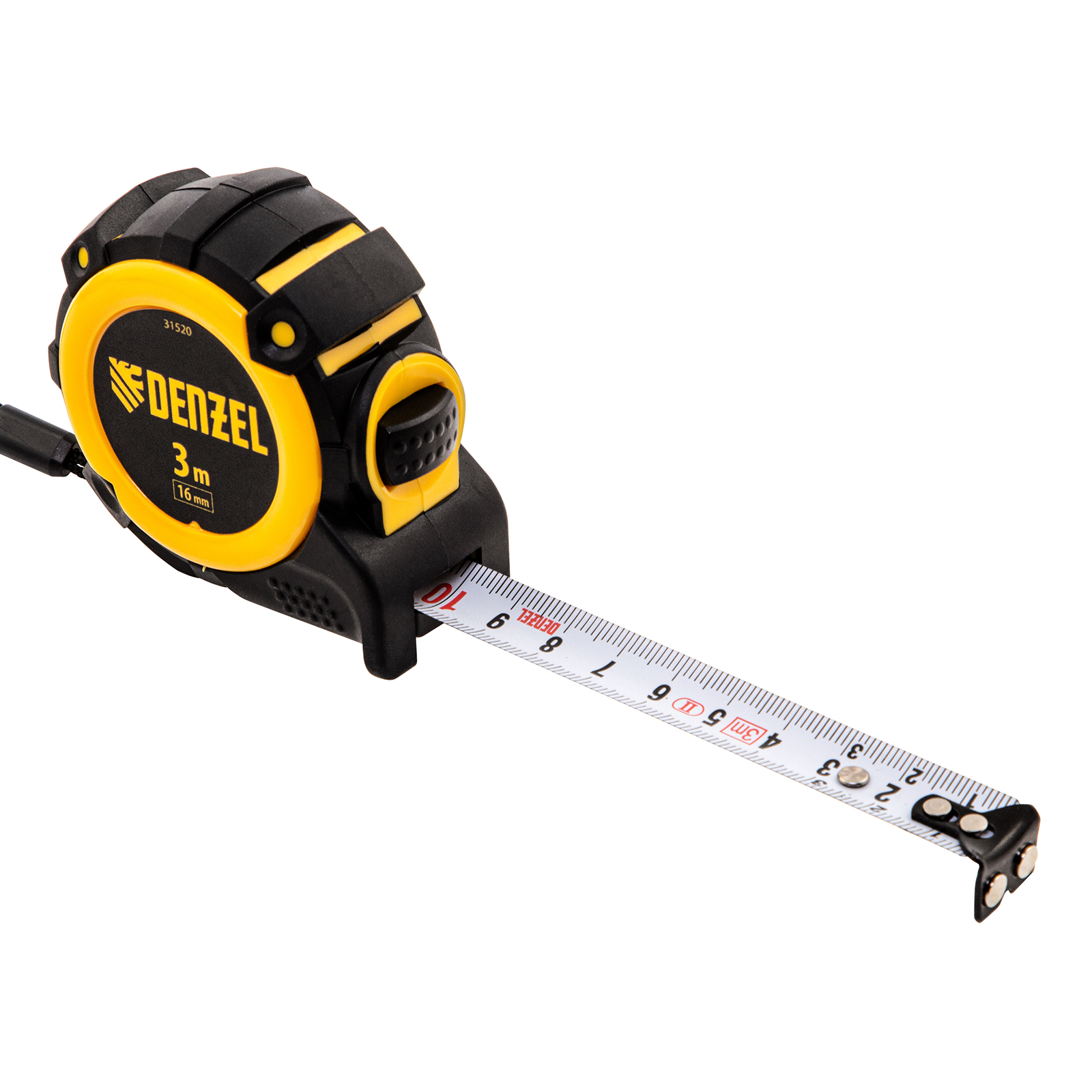 Рулетка Denzel 31520 с автоматической фиксацией полотна размером 3 м х 16 мм, с нейлоновым покрытием, магнитным зацепом и двухсторонней разметкой, предназначена для измерения расстояний и определения габаритов различных предметов. Лента автоматически фиксируется в вытянутом положении, что упрощает работу. Рулетка будет полезна во время строительных и ремонтных работ.Преимущества Прочность — двухкомпонентный корпус изготовлен из ABS-пластика и термопластичной резины, что снижает риск его поломки в результате случайного падения или удара. Четкая шкала — измерительное полотно с нейлоновым покрытием устойчиво к истиранию. Функциональность — магнитный зацеп надежно фиксируется на металлических поверхностях. Проведение измерений в разных плоскостях — на ленту нанесена двухсторонняя разметка (вертикальная и горизонтальная шкала). Эргономичность — у рулетки имеется 2 кнопки возврата измерительной ленты, что ускоряет работу.