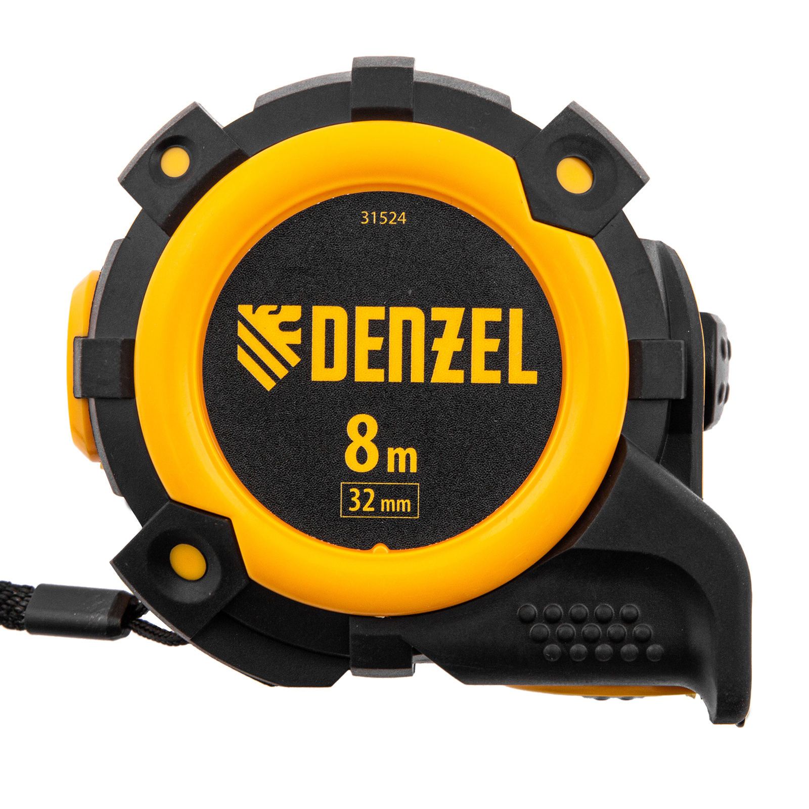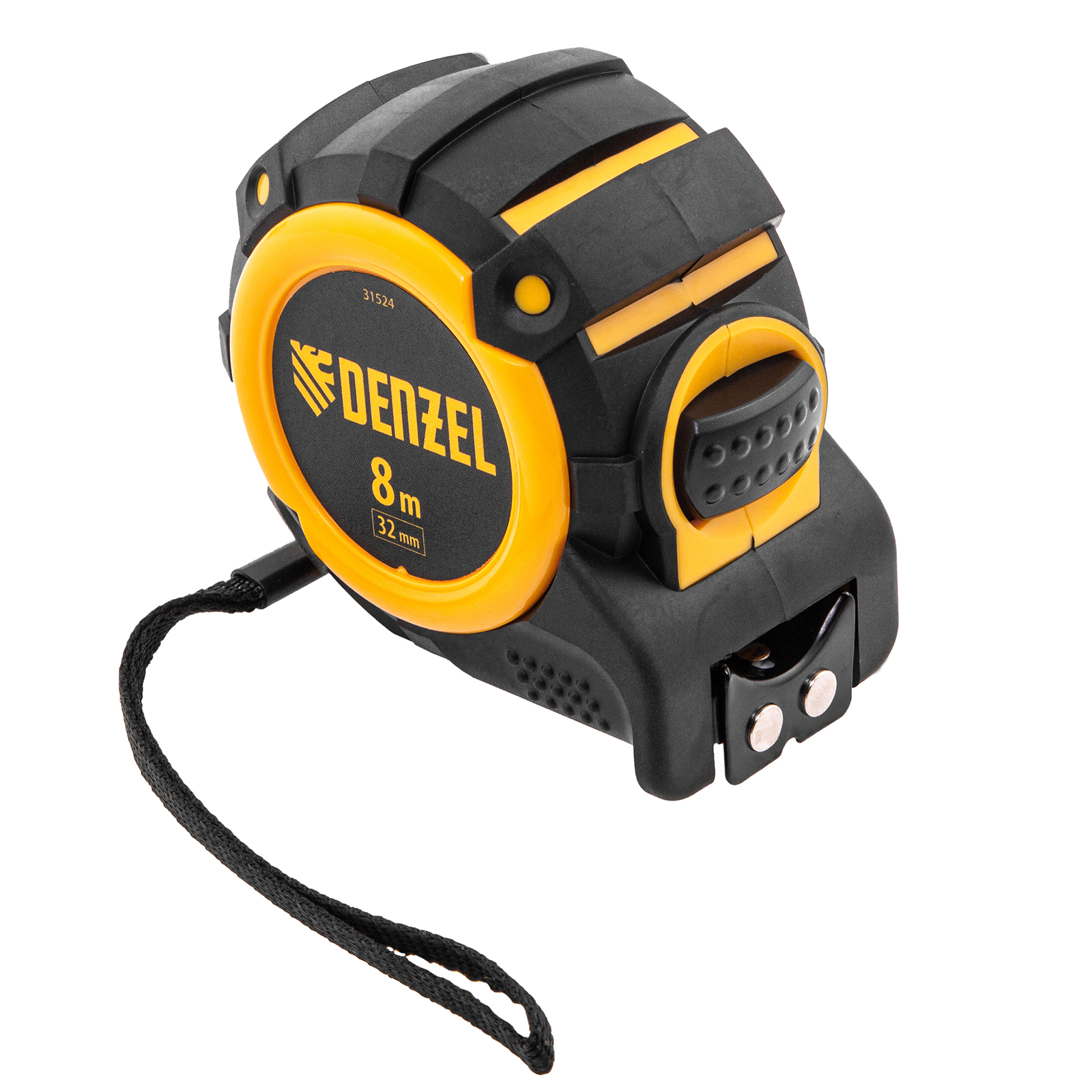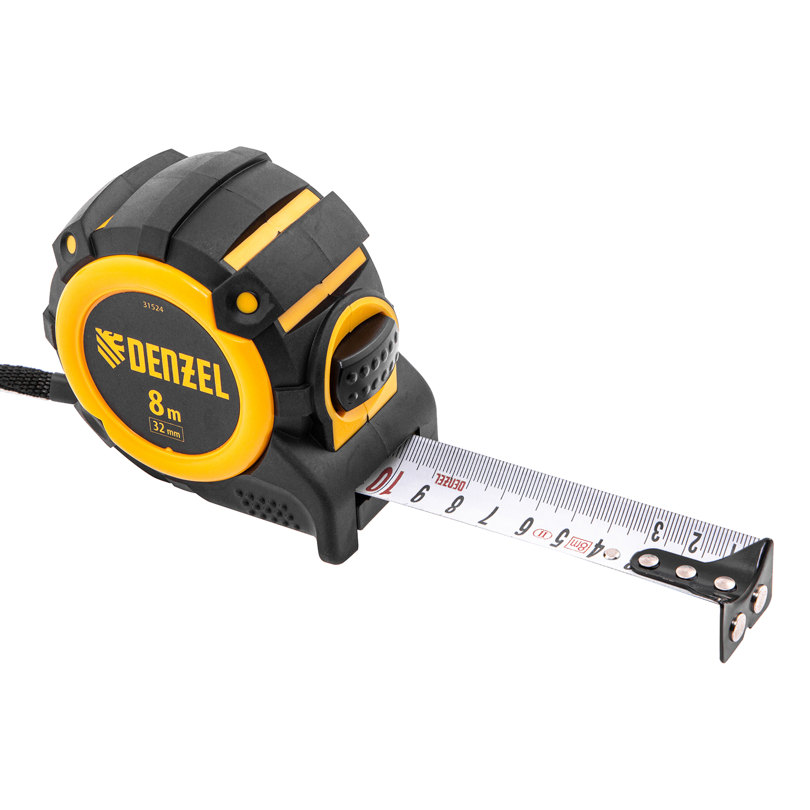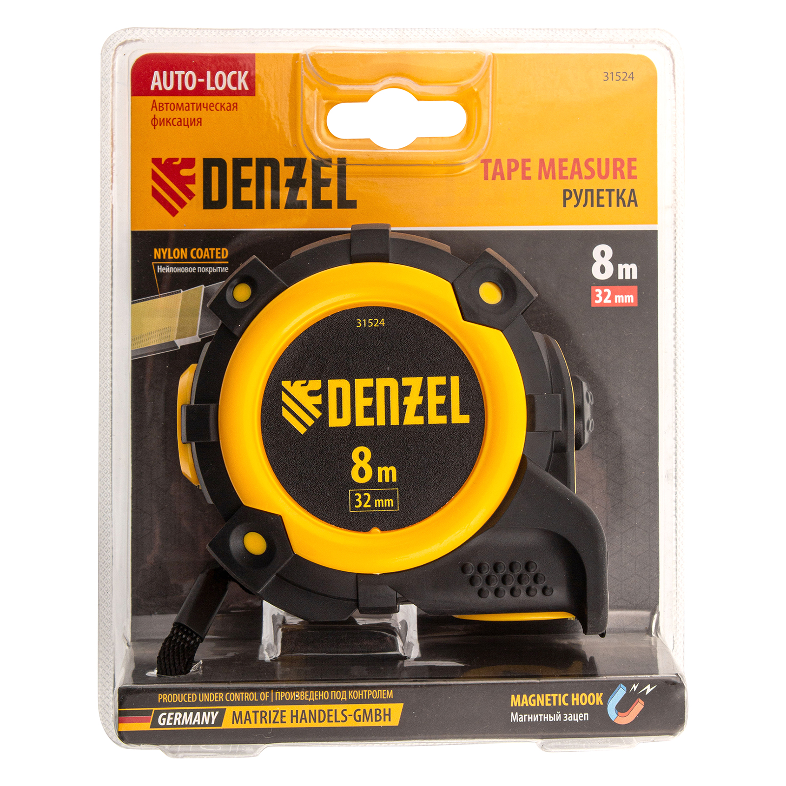 Рулетка Denzel 31524 с автоматической фиксацией полотна размером 8 м х 32 мм, с нейлоновым покрытием, магнитным зацепом и двухсторонней разметкой, предназначена для измерения расстояний и определения габаритов различных предметов. Лента автоматически фиксируется в вытянутом положении, что упрощает работу. Рулетка удобна для работы в труднодоступных местах, будет полезна во время строительных и ремонтных работ.Преимущества Прочность — двухкомпонентный корпус изготовлен из ABS-пластика и термопластичной резины, что снижает риск его поломки в результате случайного падения или удара. Четкая шкала — измерительное полотно с нейлоновым покрытием устойчиво к истиранию. Функциональность — магнитный зацеп надежно фиксируется на металлических поверхностях. Проведение измерений в разных плоскостях — на ленту нанесена двухсторонняя разметка (вертикальная и горизонтальная шкала). Эргономичность — у рулетки имеется 2 кнопки возврата измерительной ленты, что ускоряет работу.