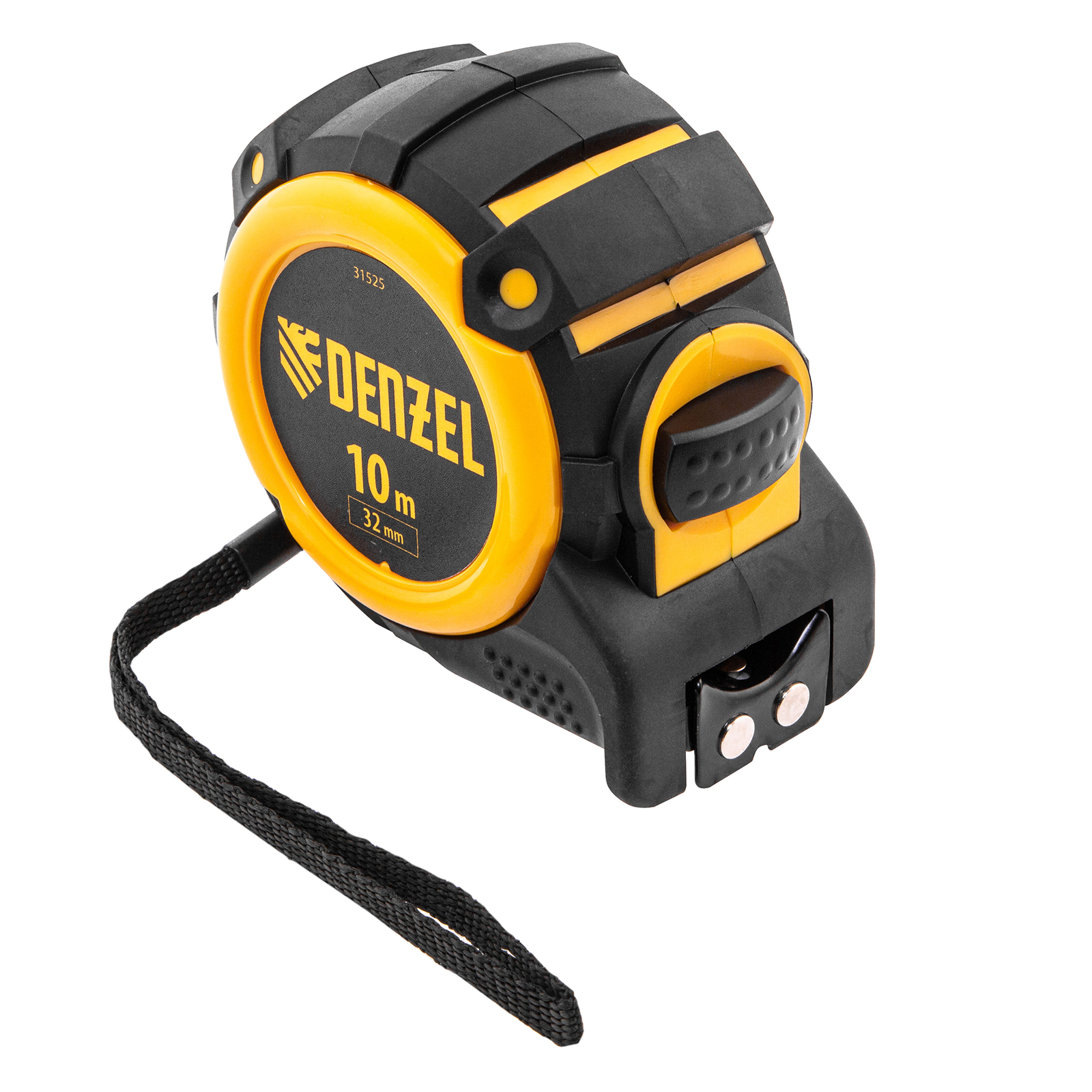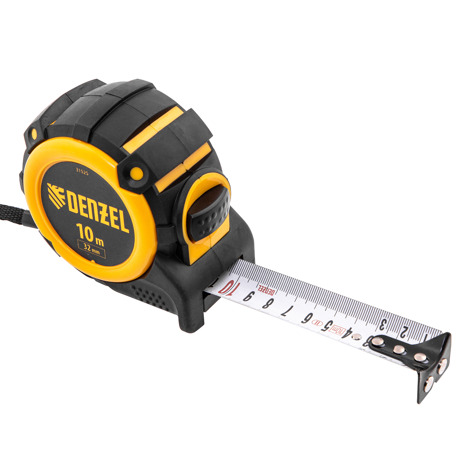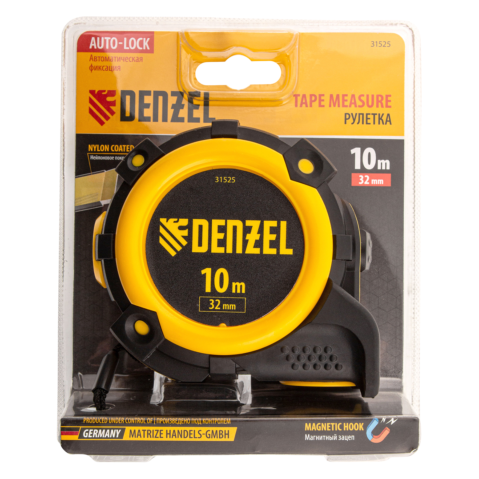 Рулетка Denzel 31525 с автоматической фиксацией полотна размером 10 м х 32 мм, с нейлоновым покрытием, магнитным зацепом и двухсторонней разметкой, предназначена для измерения расстояний и определения габаритов различных предметов. Лента автоматически фиксируется в вытянутом положении, что упрощает работу. Рулетка удобна для работы в труднодоступных местах, будет полезна во время строительных и ремонтных работ.Преимущества Прочность — двухкомпонентный корпус изготовлен из ABS-пластика и термопластичной резины, что снижает риск его поломки в результате случайного падения или удара. Четкая шкала — измерительное полотно с нейлоновым покрытием устойчиво к истиранию. Функциональность — магнитный зацеп надежно фиксируется на металлических поверхностях. Проведение измерений в разных плоскостях — на ленту нанесена двухсторонняя разметка (вертикальная и горизонтальная шкала). Эргономичность — у рулетки имеется 2 кнопки возврата измерительной ленты, что ускоряет работу.