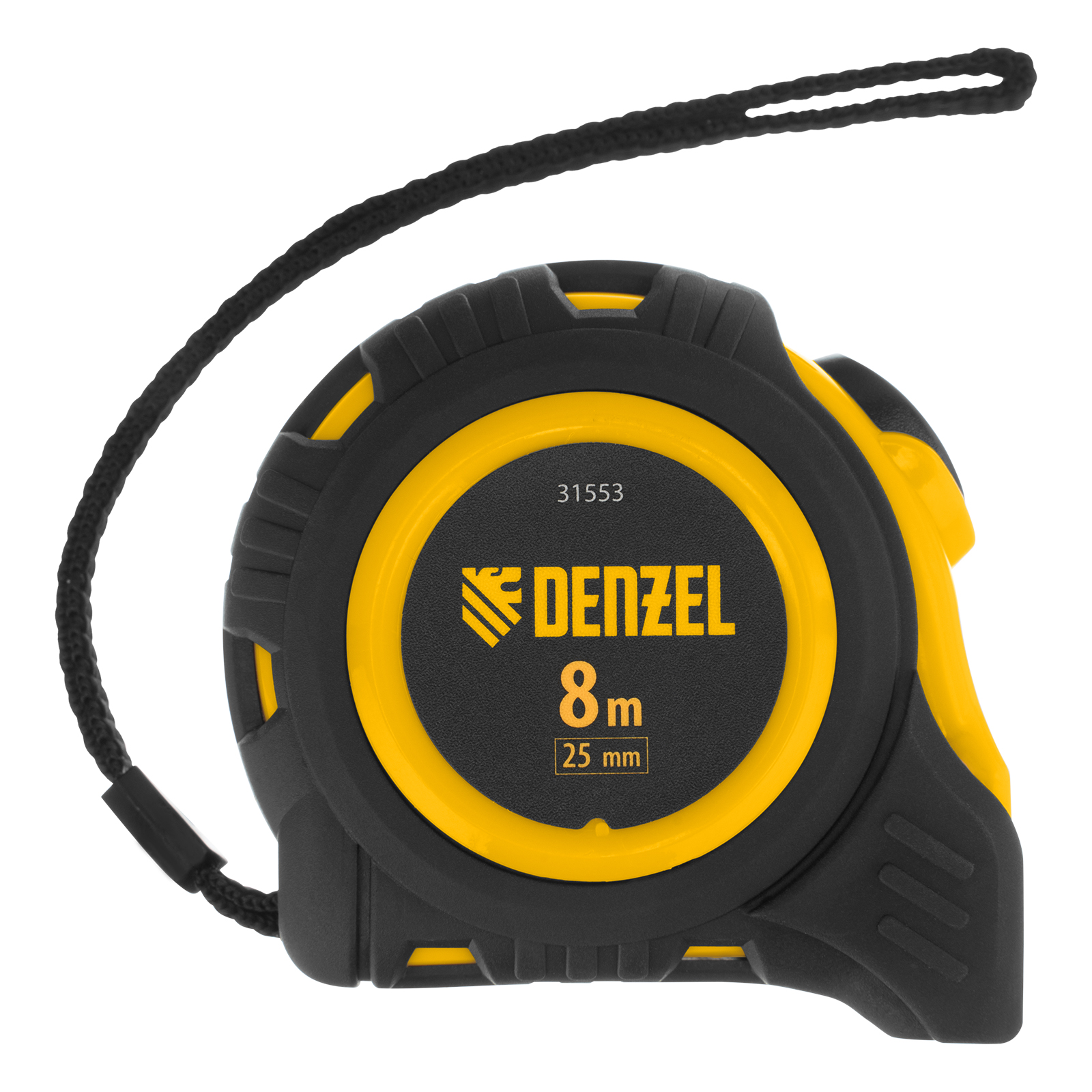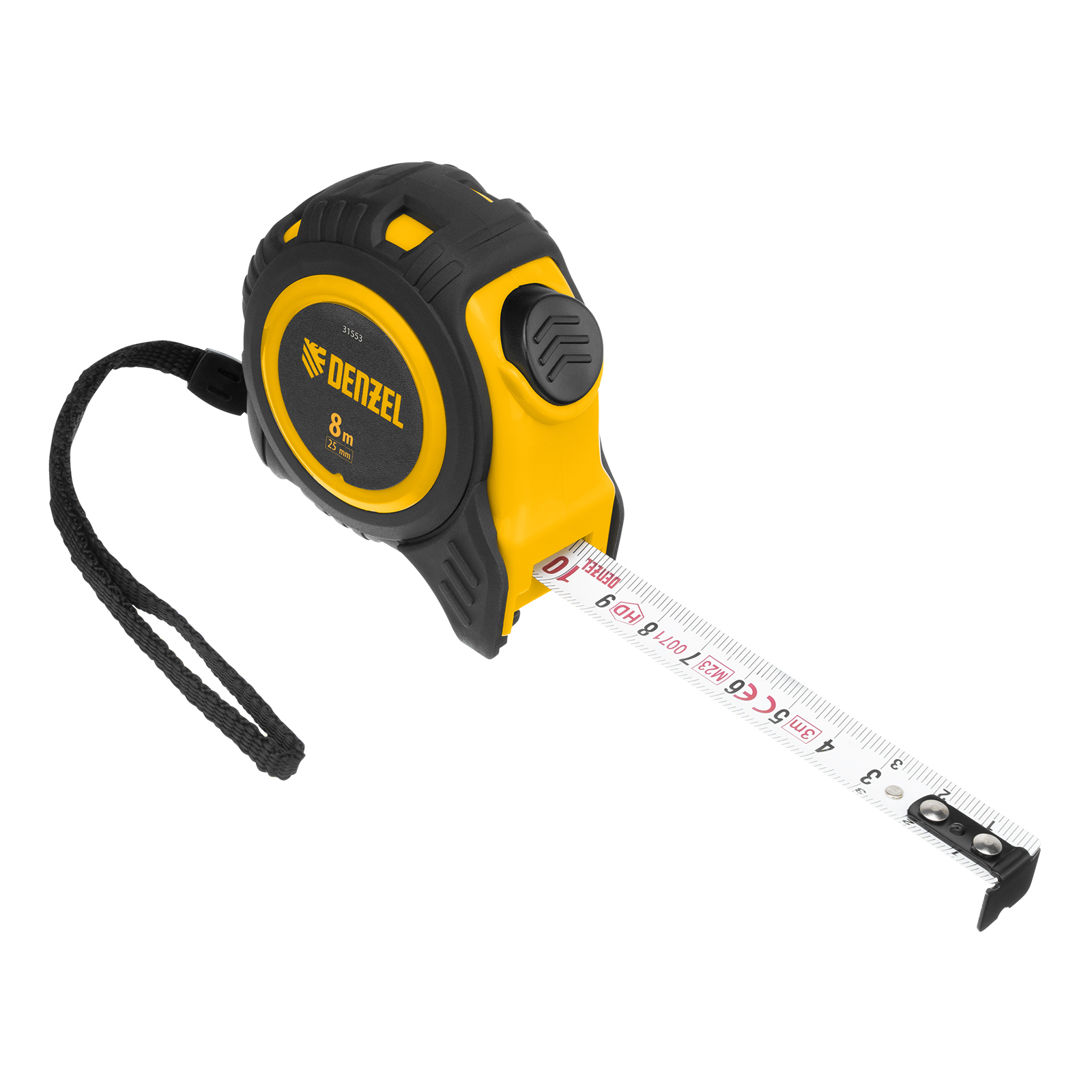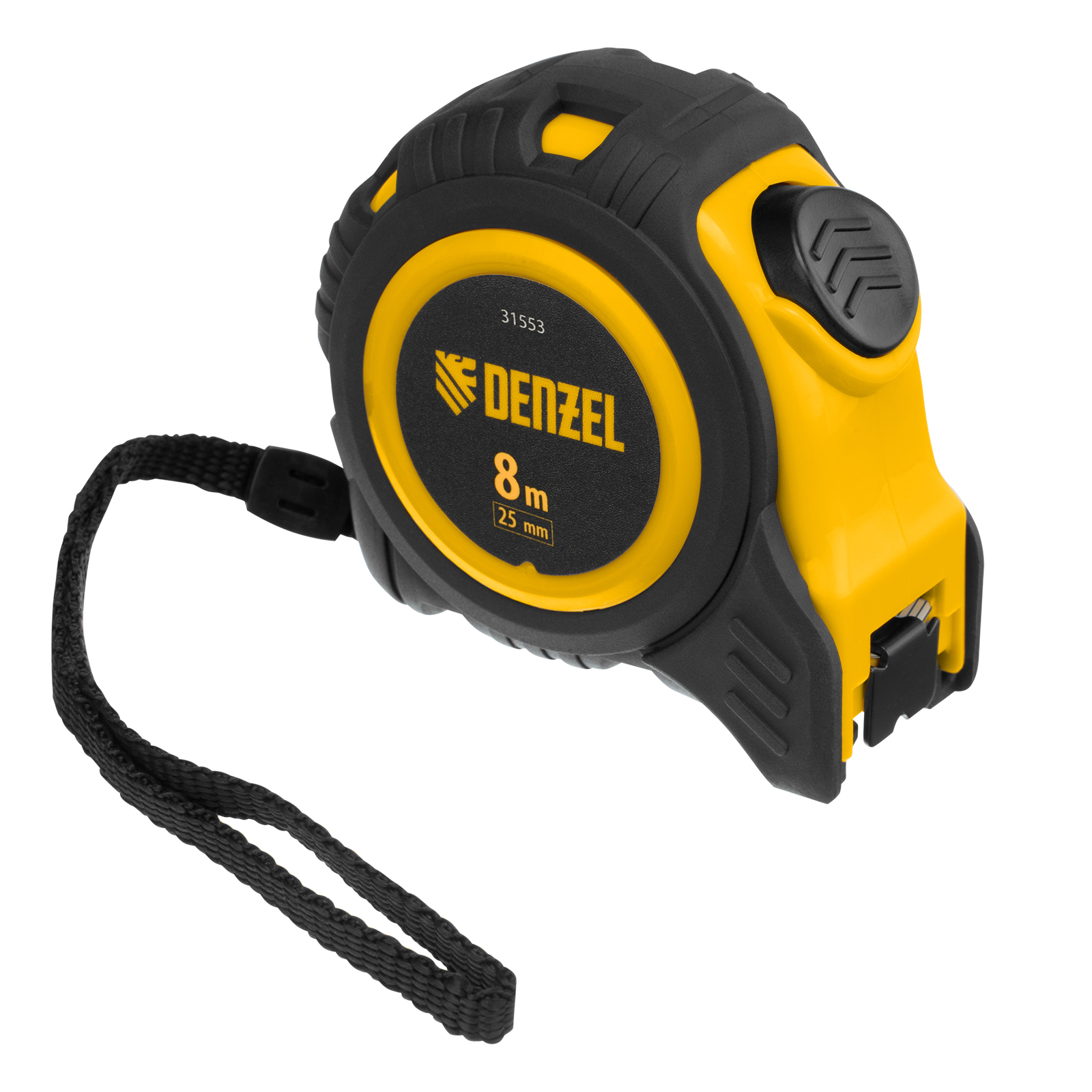 Рулетка Denzel 31553 в обрезиненном корпусе, с автоматической фиксацией, с полотном шириной 25 мм и длиной 8 м, используется для измерения расстояний и размеров предметов. Стальная лента с эмалевым покрытием и защитной пластиной в месте крепления зацепа рассчитана на долгий срок службы. Рулетка будет полезна во время строительства и ремонта, а также пригодится в быту.ПреимуществаУдаропрочность — обрезиненный корпус устойчив к механическим повреждениям, возвратная пружина выполнена из стали 65 Mn.Удобная эксплуатация — автоматический фиксация ленты облегчает проведение измерений.Долговечная конструкция — на измерительном полотне предусмотрен роликовый механизм фиксации, снижающий его трение о поверхность.Эргономичность — рулетка снабжена прочным ремешком для подвешивания на запястье.Дополнительные возможности — поясной зажим позволяет закрепить рулетку на ремне, чтобы освободить руки во время работы.Продуманная упаковка — открытый блистер позволяет осмотреть инструмент перед покупкой.Подтвержденное качество — инструменту присвоен II класс точности (сертификация CE (LNE)).