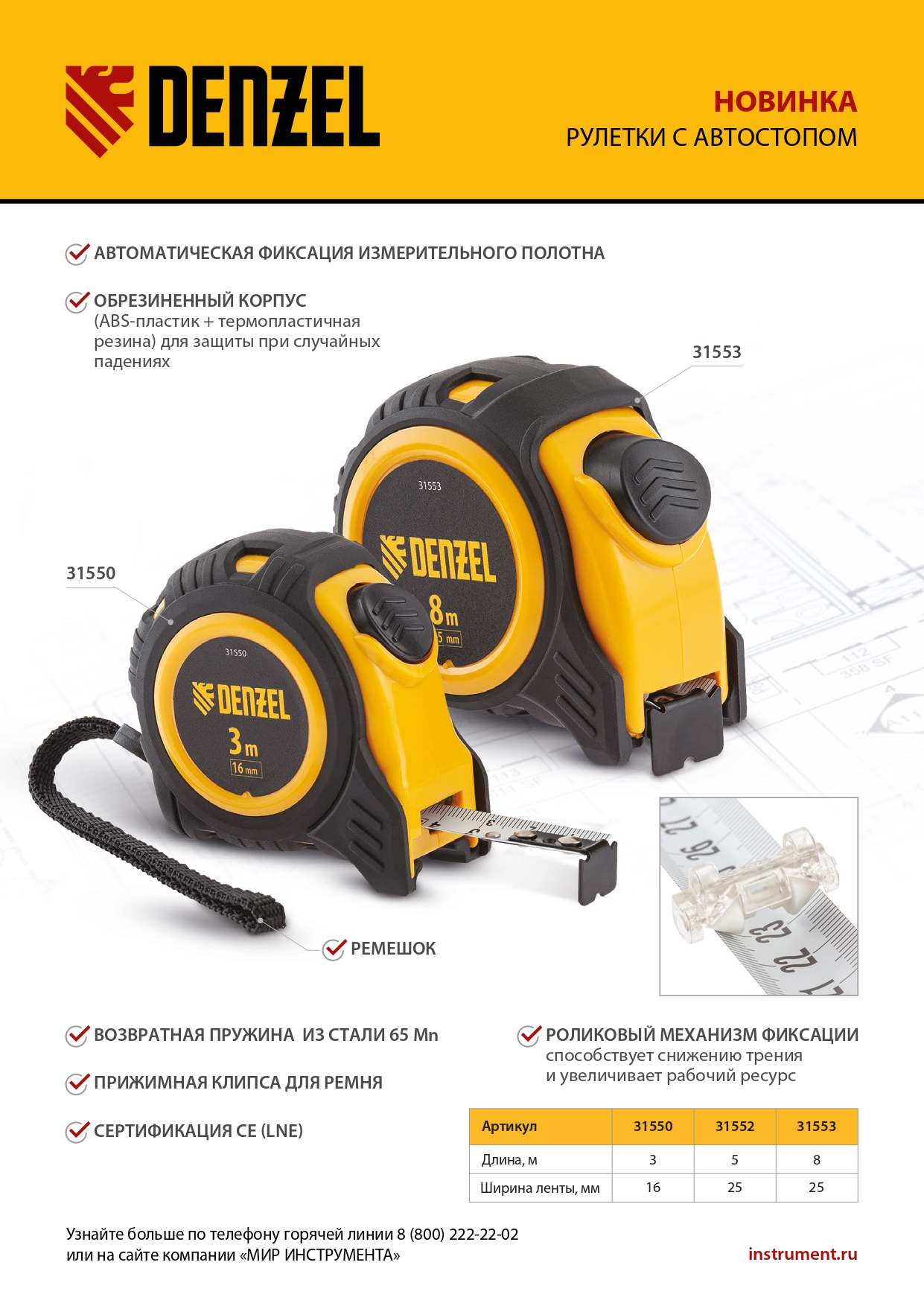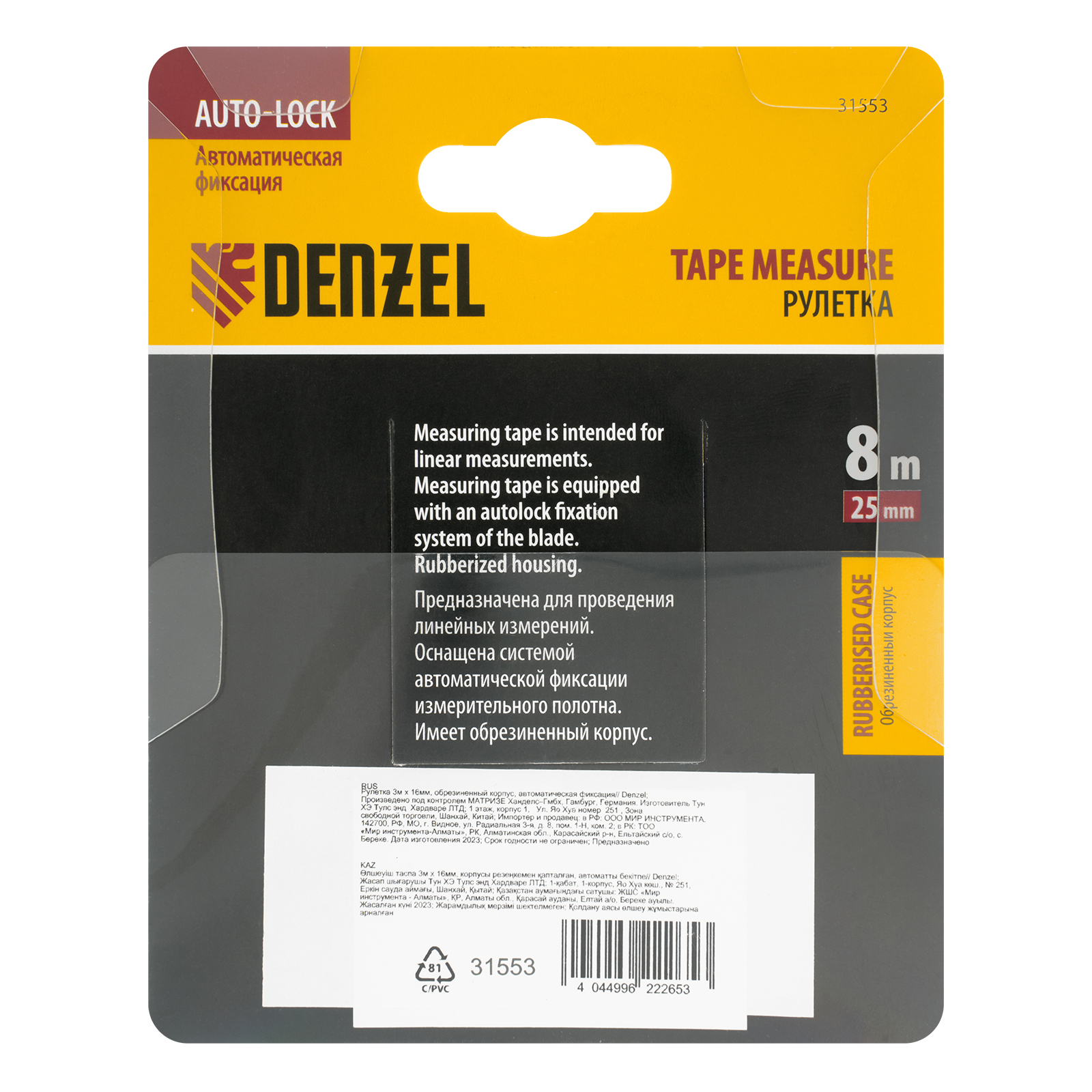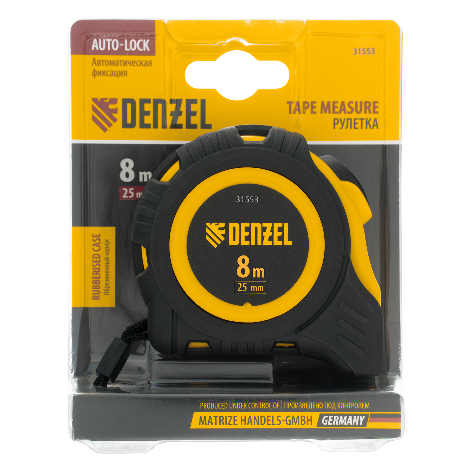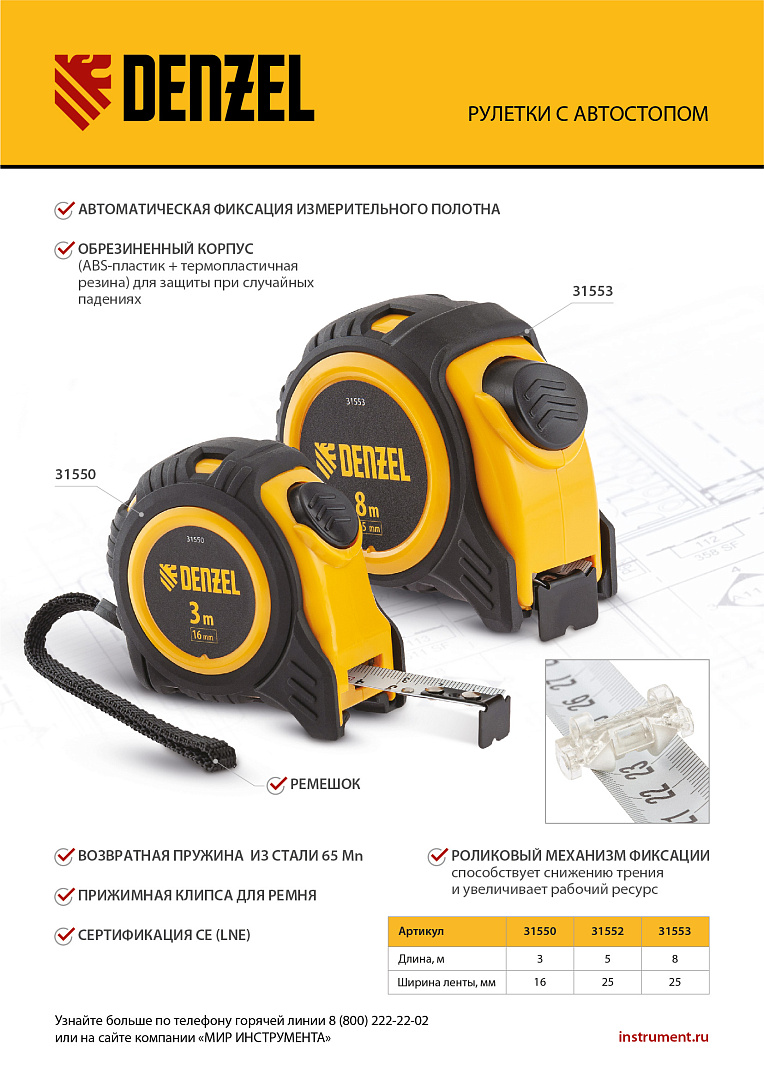 Рулетка Denzel 31553 в обрезиненном корпусе, с автоматической фиксацией, с полотном шириной 25 мм и длиной 8 м, используется для измерения расстояний и размеров предметов. Стальная лента с эмалевым покрытием и защитной пластиной в месте крепления зацепа рассчитана на долгий срок службы. Рулетка будет полезна во время строительства и ремонта, а также пригодится в быту.ПреимуществаУдаропрочность — обрезиненный корпус устойчив к механическим повреждениям, возвратная пружина выполнена из стали 65 Mn.Удобная эксплуатация — автоматический фиксация ленты облегчает проведение измерений.Долговечная конструкция — на измерительном полотне предусмотрен роликовый механизм фиксации, снижающий его трение о поверхность.Эргономичность — рулетка снабжена прочным ремешком для подвешивания на запястье.Дополнительные возможности — поясной зажим позволяет закрепить рулетку на ремне, чтобы освободить руки во время работы.Продуманная упаковка — открытый блистер позволяет осмотреть инструмент перед покупкой.Подтвержденное качество — инструменту присвоен II класс точности (сертификация CE (LNE)).