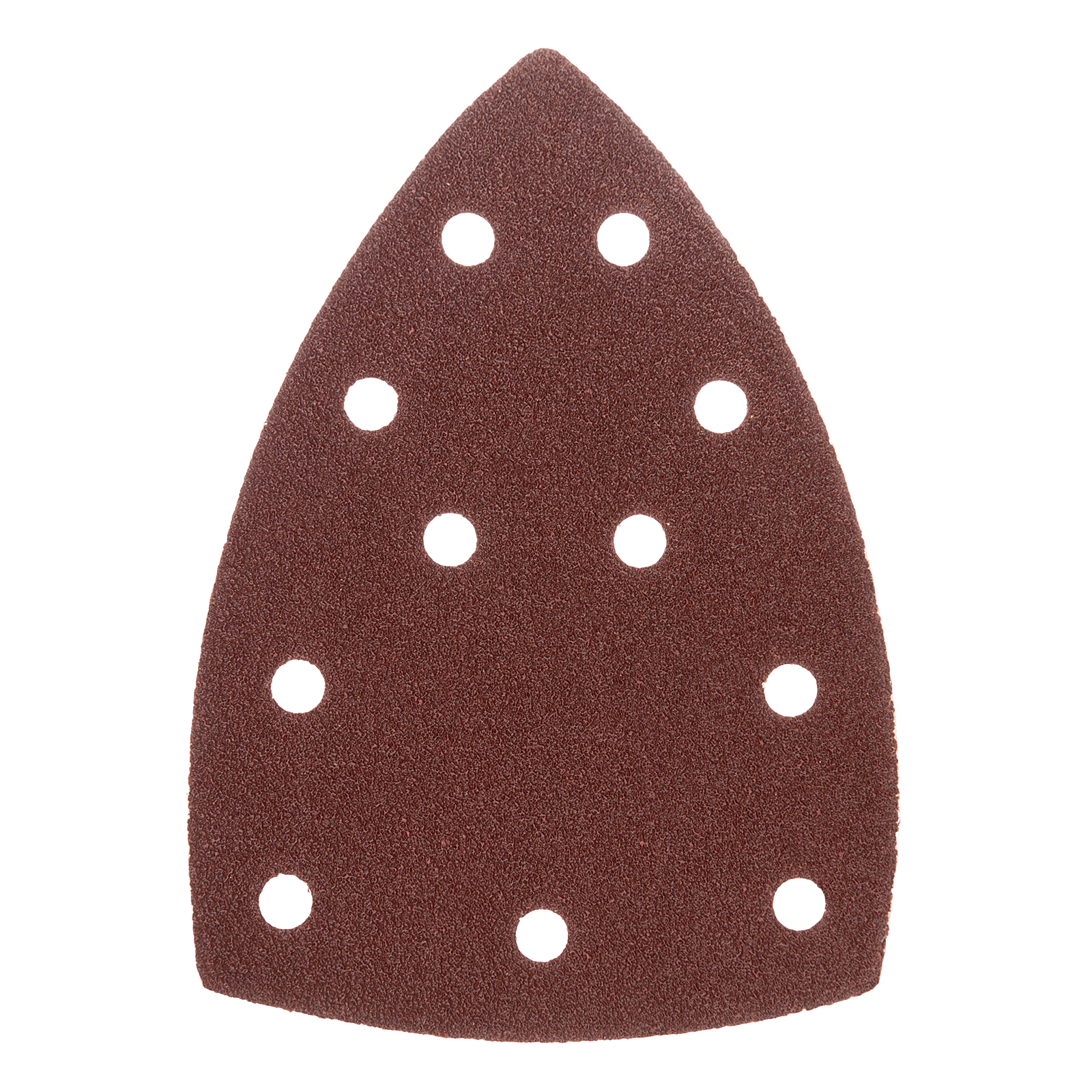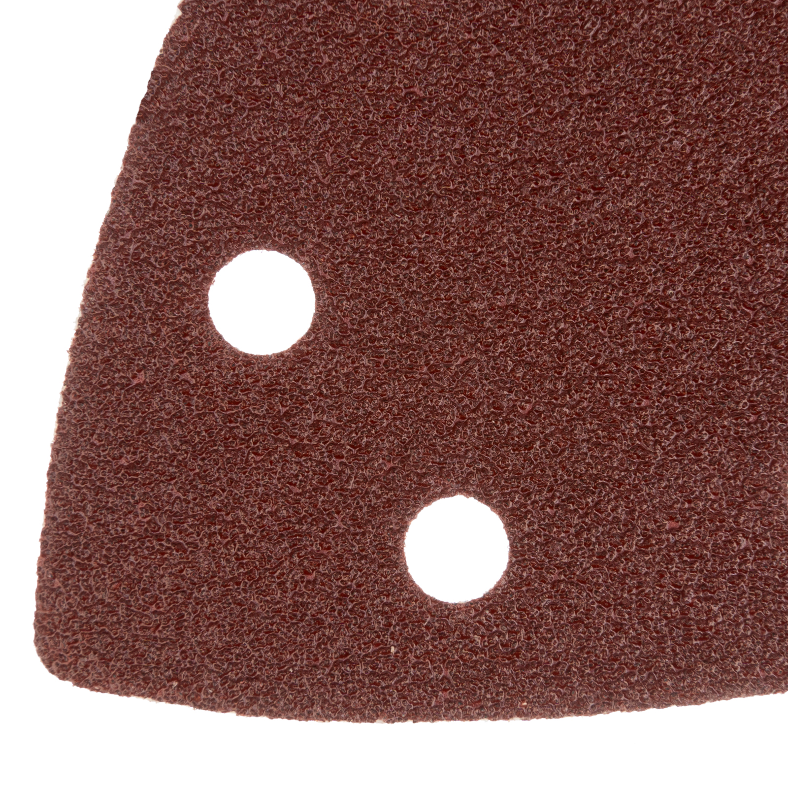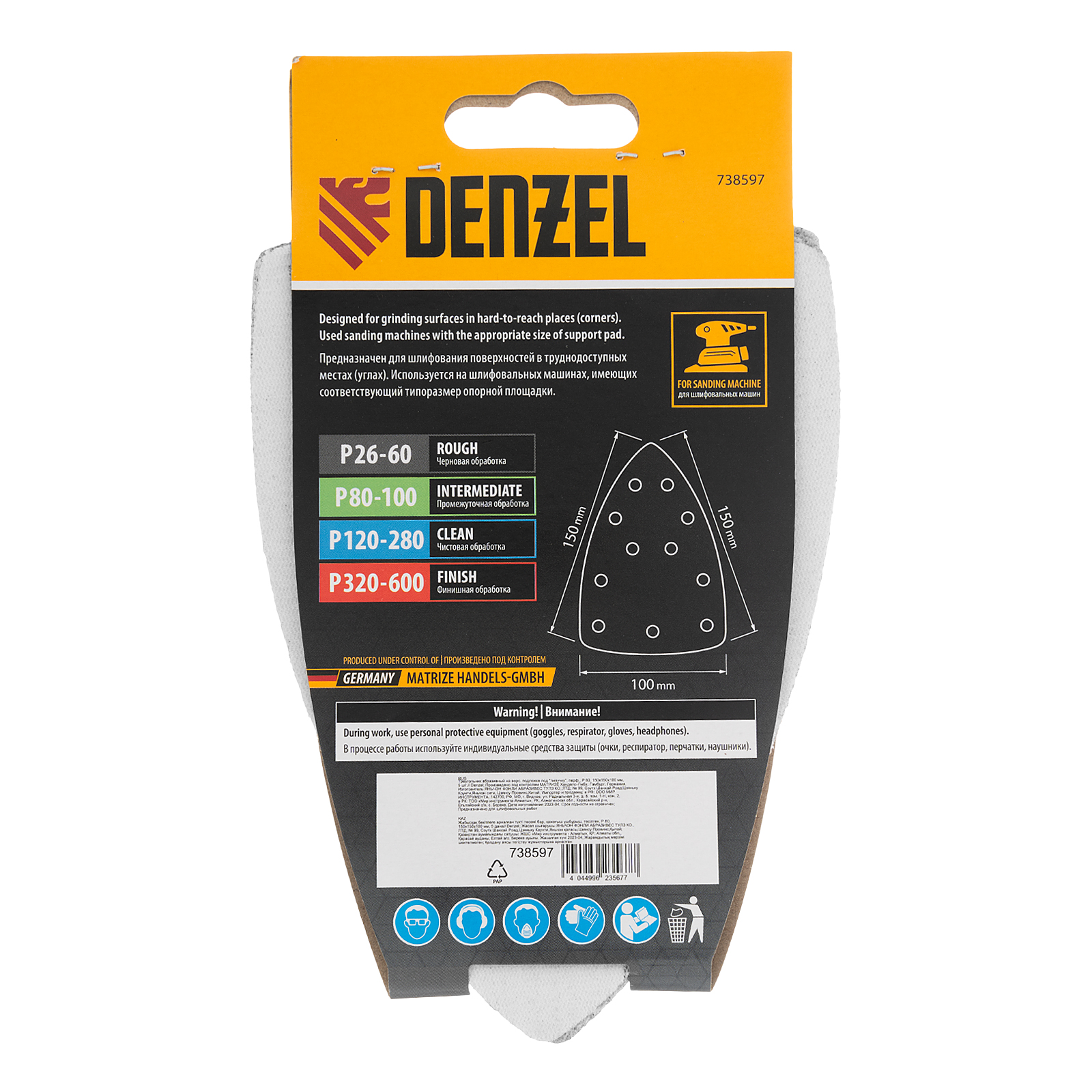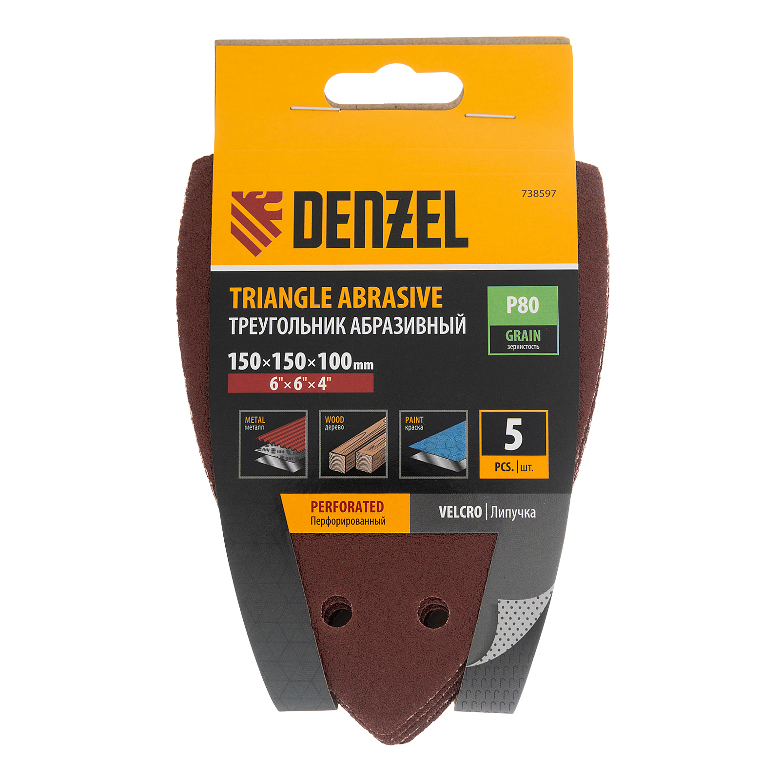 Абразивный перфорированный треугольник на ворсовой подложке «под липучку» Denzel 738597 размером 150 х 150 х 100 мм, 5 шт. в упаковке, имеет зернистость P 80 и предназначен для промежуточной обработки металлических, деревянных и других поверхностей. Позволяет удалять заусенцы, старые лакокрасочные покрытия и ржавчину, удобен для работы в углах и других труднодоступных местах. Треугольник совместим с плоскошлифовальной машиной Denzel 27614, также подходит для установки на другие шлифмашины с размером рабочей платформы 150 х 150 х 100 мм. Преимущества Высокая производительность — зерна абразива изготовлены из оксида алюминия 1 класса. Эффективность — перфорированная поверхность обеспечивает быстрый отвод пыли. Быстрая подготовка к работе — крепление «велкро» позволяет установить треугольник за несколько секунд. Удобная комплектация по 5 штук — набора хватит для выполнения большого объема работ.