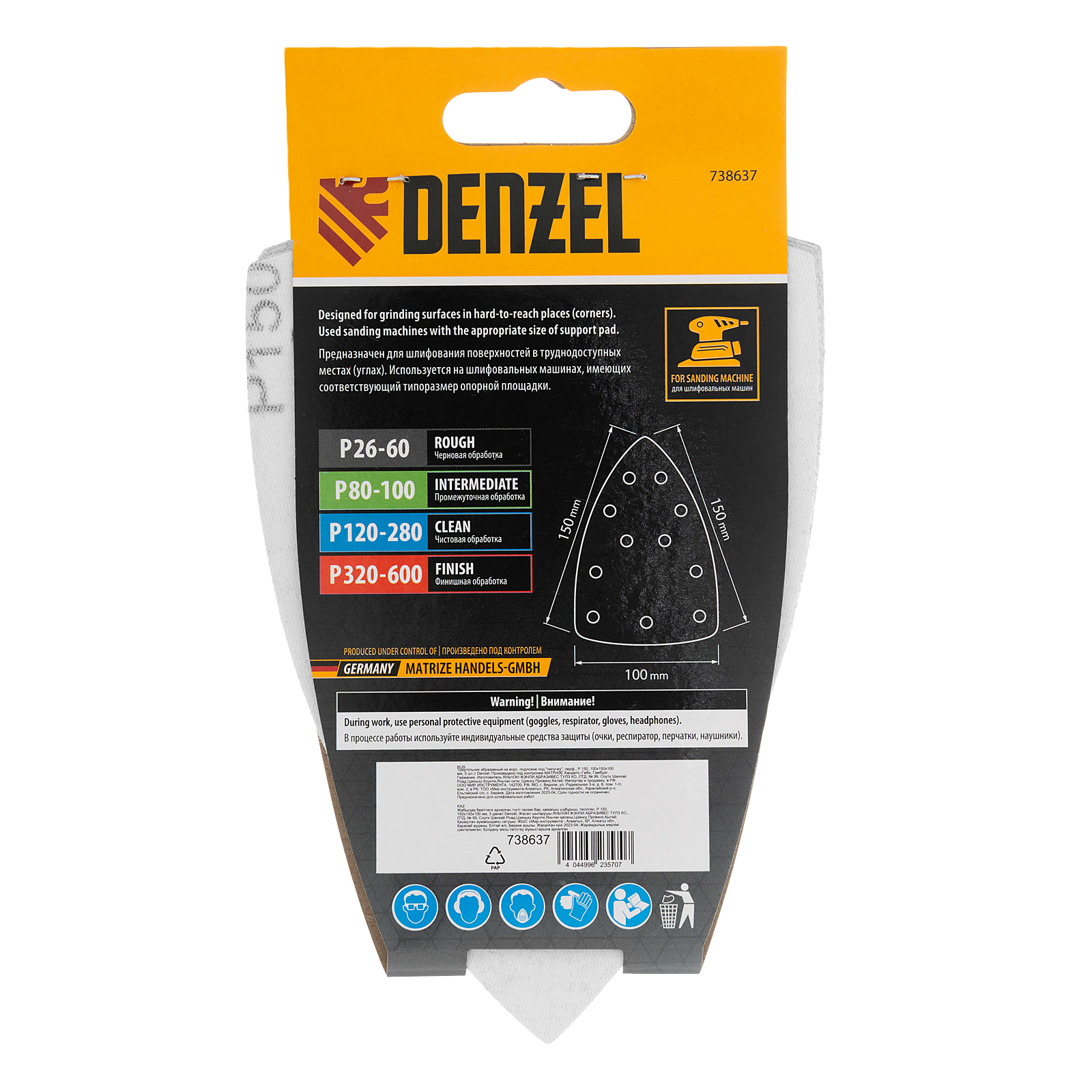 Абразивный перфорированный треугольник на ворсовой подложке «под липучку» Denzel 738637 размером 150 х 150 х 100 мм, 5 шт. в упаковке, имеет зернистость P 150 и предназначен для чистовой обработки металлических, деревянных и других деталей. Позволяет придать поверхности гладкость и подготовить ее к отделке, удобен для работы в углах и других труднодоступных местах. Треугольник совместим с плоскошлифовальной машиной Denzel 27614, также подходит для установки на другие шлифмашины с размером рабочей платформы 150 х 150 х 100 мм. Преимущества Высокая производительность — зерна абразива изготовлены из оксида алюминия 1 класса. Эффективность — перфорированная поверхность обеспечивает быстрый отвод пыли. Быстрая подготовка к работе — крепление «велкро» позволяет установить треугольник за несколько секунд. Удобная комплектация по 5 штук — набора хватит для выполнения большого объема работ.