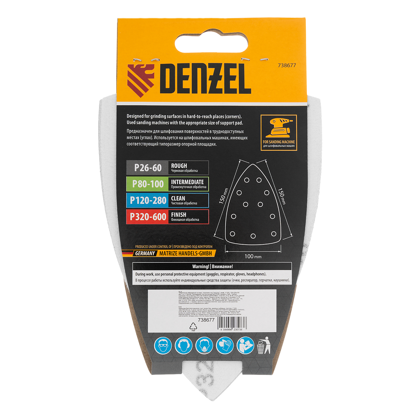 Абразивный перфорированный треугольник на ворсовой подложке «под липучку» Denzel 738677 размером 150 х 150 х 100 мм, 5 шт. в упаковке, имеет зернистость P 320 и предназначен для финишной обработки металлических, деревянных и других деталей. Позволяет устранять с поверхности мельчайшие шероховатости, удобен для работы в углах и других труднодоступных местах. Треугольник совместим с плоскошлифовальной машиной Denzel 27614, также подходит для установки на другие шлифмашины с размером рабочей платформы 150 х 150 х 100 мм. Преимущества Высокая производительность — зерна абразива изготовлены из оксида алюминия 1 класса. Эффективность — перфорированная поверхность обеспечивает быстрый отвод пыли. Быстрая подготовка к работе — крепление «велкро» позволяет установить треугольник за несколько секунд. Удобная комплектация по 5 штук — набора хватит для выполнения большого объема работ.