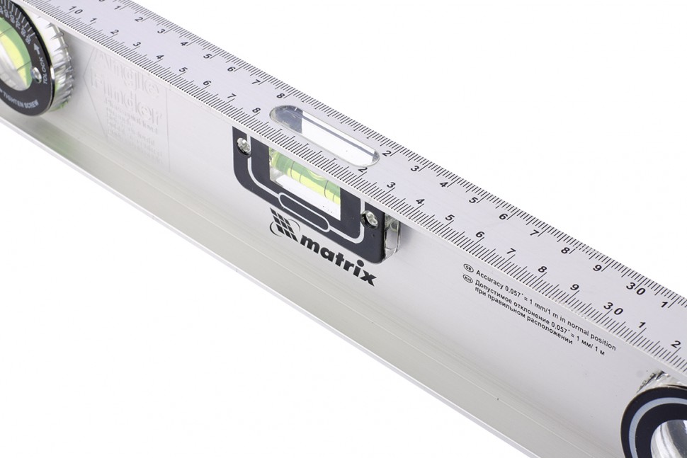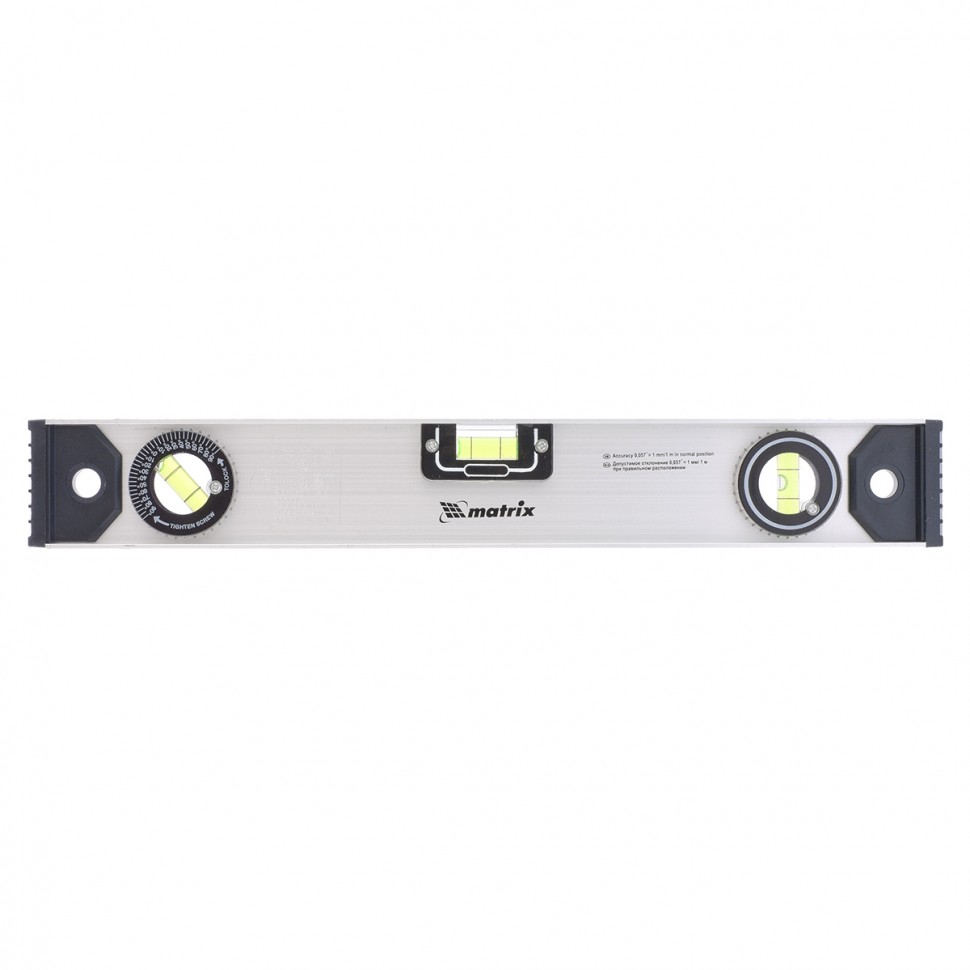 Алюминиевый уровень Matrix «Рельс» 34020 длиной 400 мм имеет 3 глазка: 2 для проверки отклонений от заданной вертикали и горизонтали и 1 поворотный для проверки наклонных поверхностей.Для определения отклонения вертикали 90 градусов необходимо использовать пузырьковую ампулу только в верхнем положении уровня. Только базовая поверхность является рабочей (противоположная ампуле 180 градусов).ПреимуществаПластиковые заглушки по бокам корпуса повышают его ударопрочность и предотвращают попадание мусора.Шкала на корпусе позволяет измерить длину или ширину предметов.Погрешность измерений составляет всего 1 мм на метр (0,057 градуса).