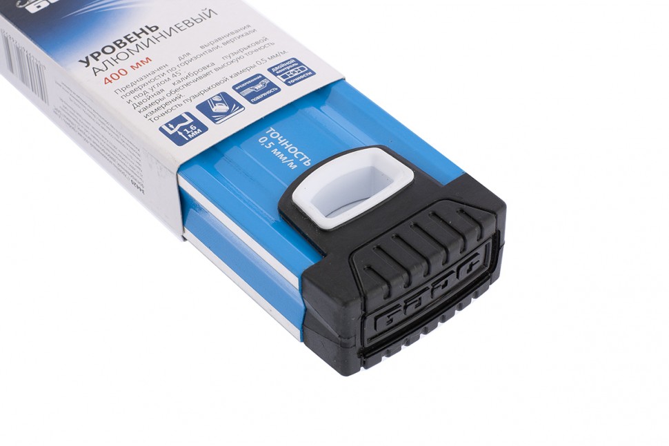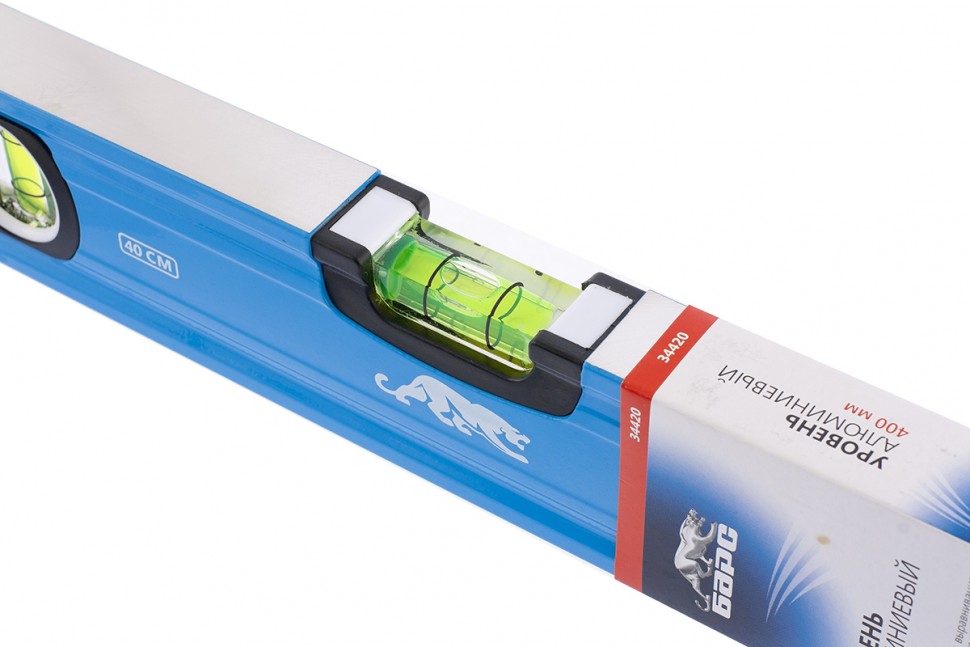 Фрезерованный алюминиевый уровень Барс 34420 длиной 400 мм, с профилем 1,6 мм и ударопрочными заглушками, оснащен 3 глазками, которые позволяют проверить вертикальные, горизонтальные поверхности и соответствие наклонных поверхностей углу 45 градусов. Инструмент повышает точность строительных и ремонтных работ.Для определения отклонения вертикали 90 градусов необходимо использовать пузырьковую ампулу только в верхнем положении уровня. Только базовая поверхность является рабочей (противоположная ампуле 180 градусов).ПреимуществаИнструмент изготовлен из легкого и прочного алюминиевого профиля (марка 6063).Высокая точность работы достигается за счет фрезерованной рабочей части и двойного контроля при установке ампул.V-образная форма подошвы обеспечивает возможность фиксации инструмента на трубах при проведении сантехнических работ.Уровень выдерживает падения с небольшой высоты за счет заглушек из износостойкой термопластичной резины (TPR).Строительный уровень удобно хранить на крючке, т.к. в боковых частях имеются отверстия.