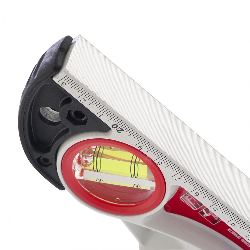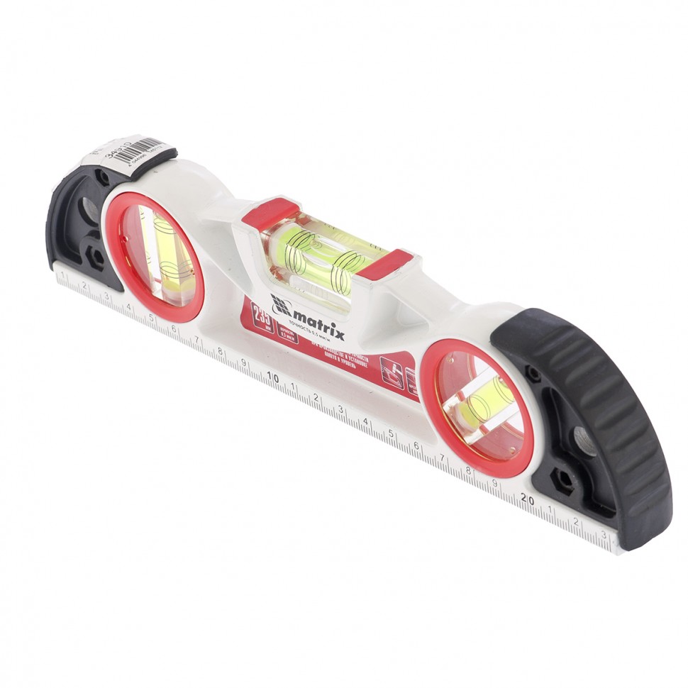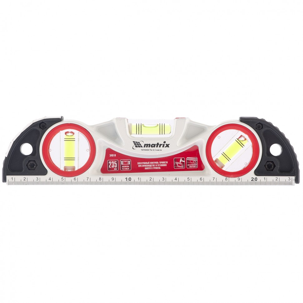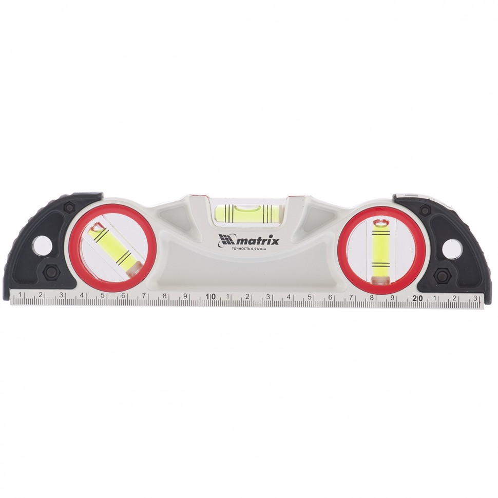 Уровень алюминиевый литой Matrix 34910 длиной 235 мм, с фрезерованной рабочей частью, 3 глазками и двумя ударными площадками, предназначен для проверки поверхностей на отклонение от горизонтали, вертикали и угла 45°. Инструмент значительно повышает точность проводимых работ, пригодится частному мастеру и профессионалу на строительной площадке, во время ремонта и для проведения монтажных работ.ПреимуществаПрочность и коррозионная стойкость — уровень изготовлен из алюминиевого профиля.Точные результаты — пузырьковые ампулы прошли электронную калибровку, нижняя грань фрезерована, что снизило погрешность до 0,5 мм/м.Возможность дополнительного выравнивания материалов — две ударные площадки позволяют наносить удары небольшой резиновой киянкой.Определение расстояний и размеров предметов — на корпусе имеется измерительная шкала.Длина 235 мм — инструментом удобно работать в труднодоступных местах.Для определения отклонения от вертикали 90° необходимо использовать пузырьковую ампулу только в верхнем положении уровня. Только базовая поверхность (противоположная ампуле 180°) является рабочей.