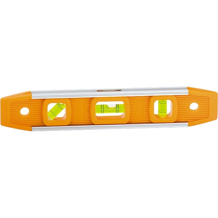 Усиленный магнитный уровень Sparta «Торпедо» (IV) 346115 длиной 230 мм, пластмассовый, с 3 глазками, — оптимальный вариант для бытового использования. 3 глазка служат для проверки горизонтальных и вертикальных поверхностей и соответствия углу 45 градусов. За счет небольшой длины инструментом удобно работать в труднодоступных местах и ограниченном пространстве.Для определения отклонения вертикали 90 градусов необходимо использовать пузырьковую ампулу только в верхнем положении уровня. Только базовая поверхность является рабочей (противоположная ампуле 180 градусов).ПреимуществаНадежность уровня обеспечивает прочная пластмасса, из которой он выполнен.Металлические пластины усиливают корпус, что увеличивает ресурс инструмента.За счет магнитов уровень можно зафиксировать на металлических поверхностях, что сделает более удобными сантехнические работы.В корпусе имеются отверстия для подвесного хранения инструмента.
