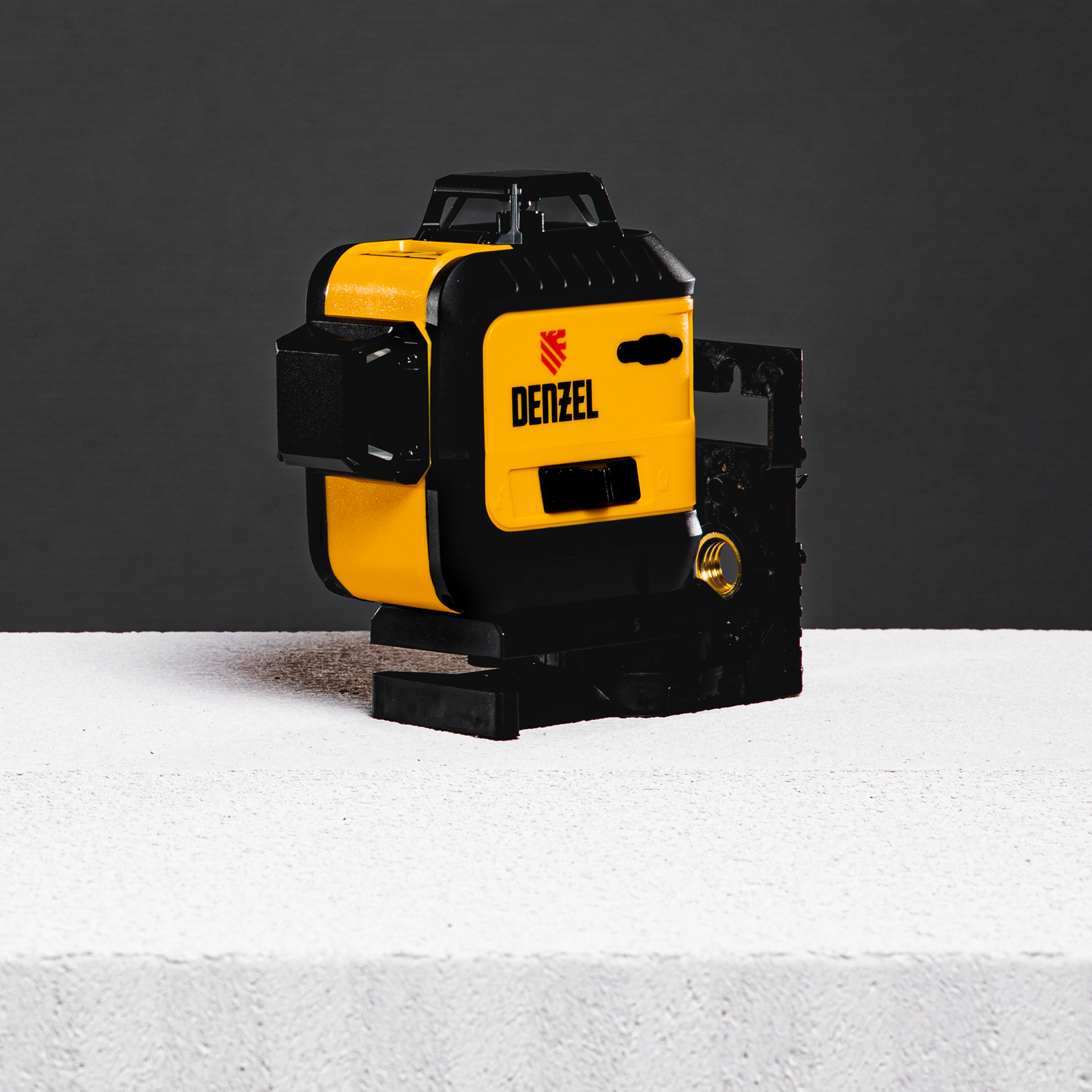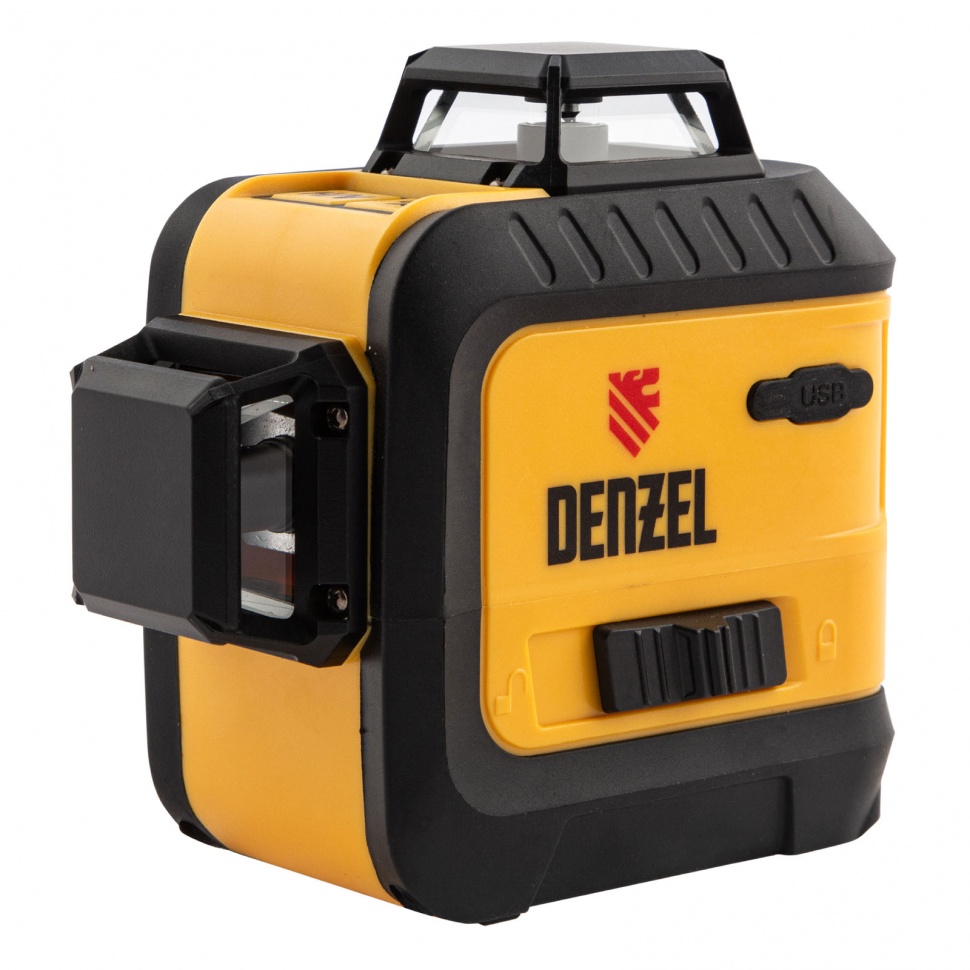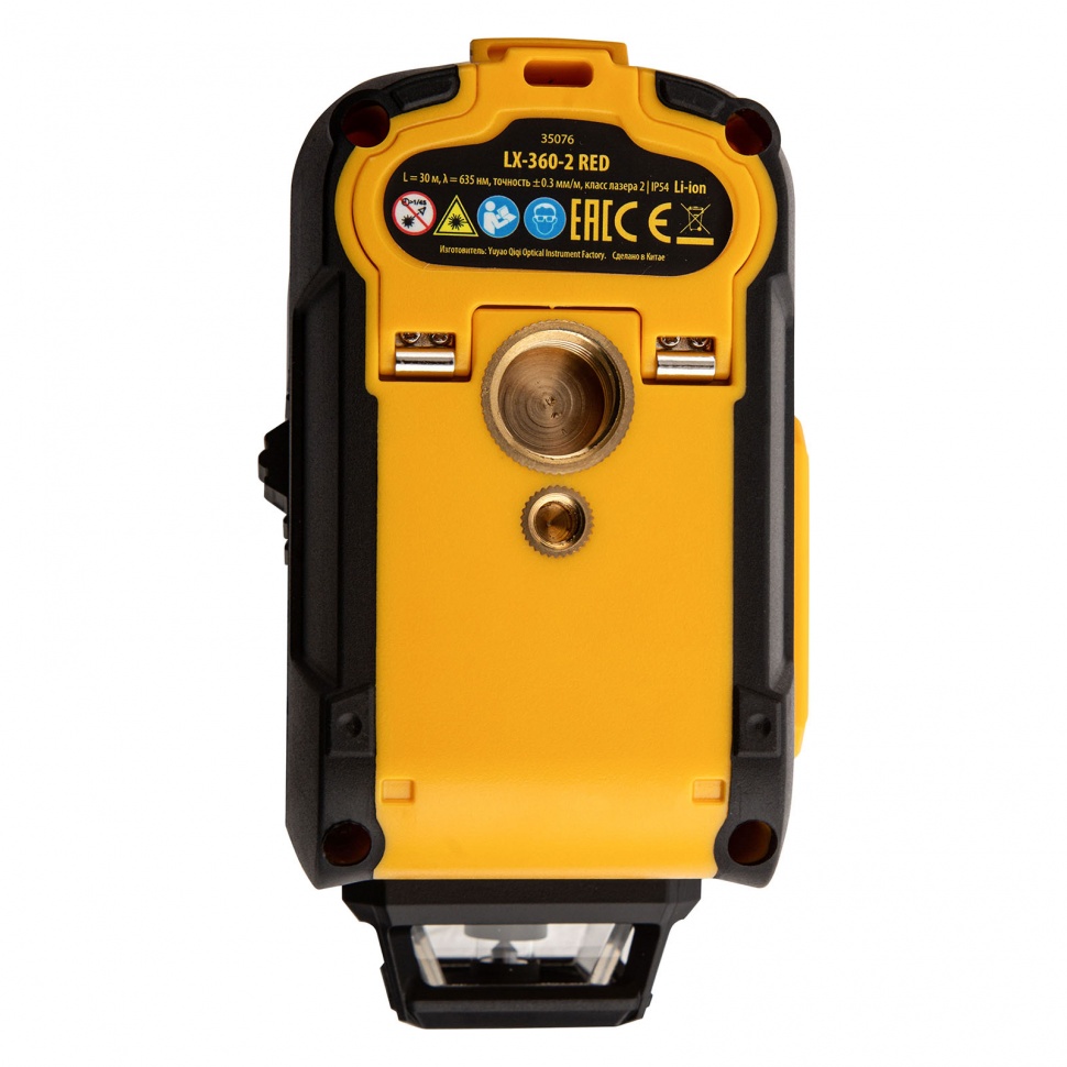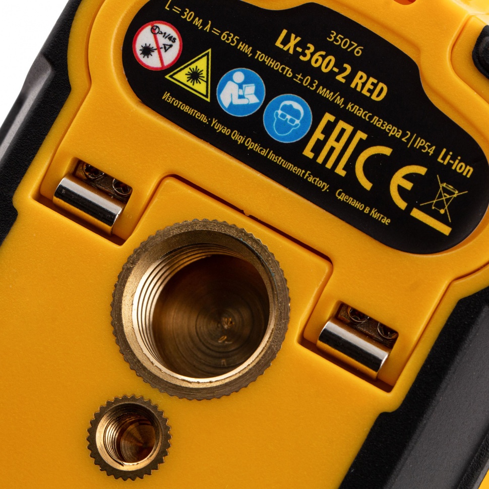 Мультипризменный лазерный уровень Denzel LX 360-2 Red 35076 с резьбой 5/8"" под штатив работает от аккумулятора Li-Ion 2800 мАч и проецирует горизонтальные и вертикальные линии с охватом 360° на расстояние до 30 м при помощи лазерных лучей длиной 635 нм. Используется для разметки поверхностей в ходе строительных и отделочных работ.ПреимуществаТочная разметка — уровень имеет опцию самовыравнивания с точностью до 4°.Простая эксплуатация — прибор оборудован интуитивно понятной панелью управления с сенсорными кнопками.Оповещение о превышении угла наклона — в случае отклонения уровня более чем на 4° по горизонтали лазерные лучи начинают мигать.Яркая проекция — в режиме «OUTDOOR» лучи видно даже при дневном освещении.Решение широкого спектра задач — опцию автоматического выравнивания можно отключить для построения наклонной проекции.Возможность установки на штатив — в нижней части корпуса предусмотрена резьба 1/4"" и 5/8"".Экономия заряда аккумулятора — неиспользуемые лучи можно отключать.Защита от повреждений — корпус изготовлен из ударопрочного пластика и дополнен резиновыми накладками, не пропускает пыль и капли воды.Безопасная транспортировка — блокировка маятника предотвращает выход его из строя.Пластиковый кейс — уровень удобен в хранении и транспортировке.Гарантия 3 года — надежность прибора подтверждена производителем.