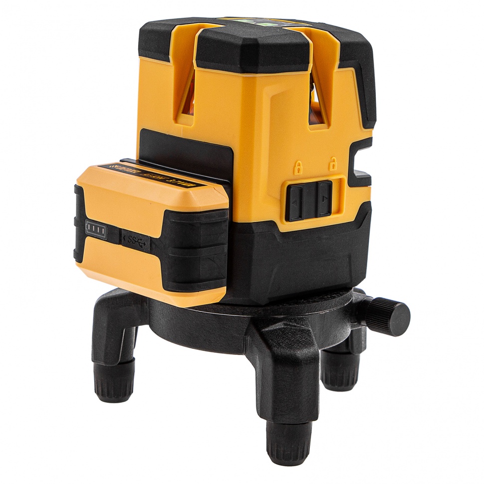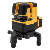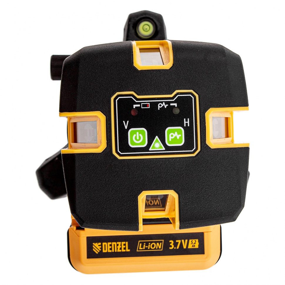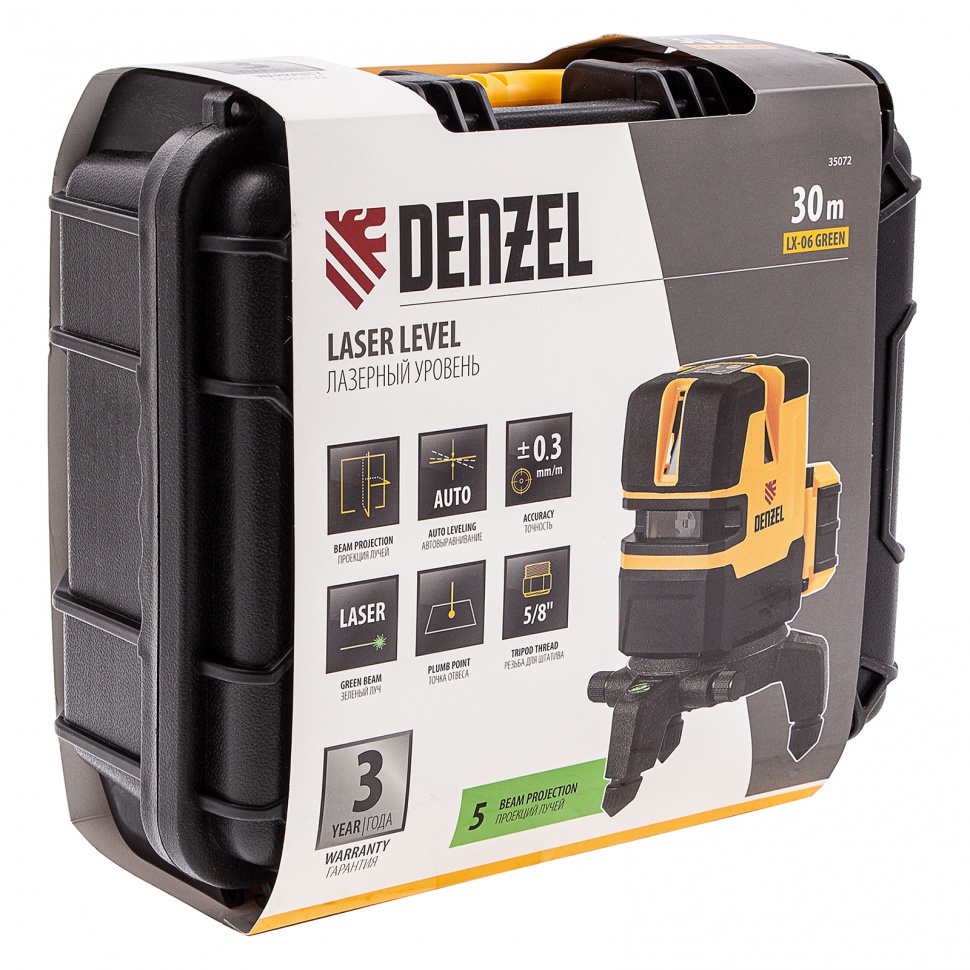 Лазерный уровень Denzel LX 06 Green 35072 предназначен для построения линий разметки на стенах, полу и потолке при проведении строительно-ремонтных работ. Благодаря длине волны лазера 520 Нм дальность проецирования уровня составляет 30 м. Уровень проецирует на поверхности точку отвеса, 4 вертикальных и 1 горизонтальную линию. Функция автоматического выравнивания имеет высокую точность ±0,3мм/м. Угол развертки прибора составляет 240 градусов.ПреимуществаВысокая точность работ — встроенный пузырьковый уровень позволяет выровнять прибор перед включением, а в случае превышения угла наклона срабатывает световое оповещение.Настройка луча — благодаря микрометрическому винту линии разметки можно корректировать вручную.Управление лазерами — есть возможность поочередного отключения лазеров, что обеспечивает экономию заряда, а неиспользуемые лучи не отвлекают в процессе работы.Легкое наведение луча — благодаря поворотному основанию удобно создавать лазерную плоскость.Безопасная транспортировка — маятник лазера можно зафиксировать, чтобы не повредить при перемещении.Резьба под штатив 5/8 дюйма — лазерный уровень удобно использовать при работах на разной высоте.Регулируемая тренога — устойчивое положение уровня обеспечено даже на неровной поверхности.Мобильность — легко переносить и транспортировать благодаря небольшому весу и пластиковому кейсу.Удобство хранения и транспортировки — инструмент поставляется в практичном кейсе.Готовность к работе — в комплект поставки входят аккумулятор Li-Ion 4000 mah, зарядное устройство и мишень.Гарантия 3 года — качество инструмента подтверждено производителем.
