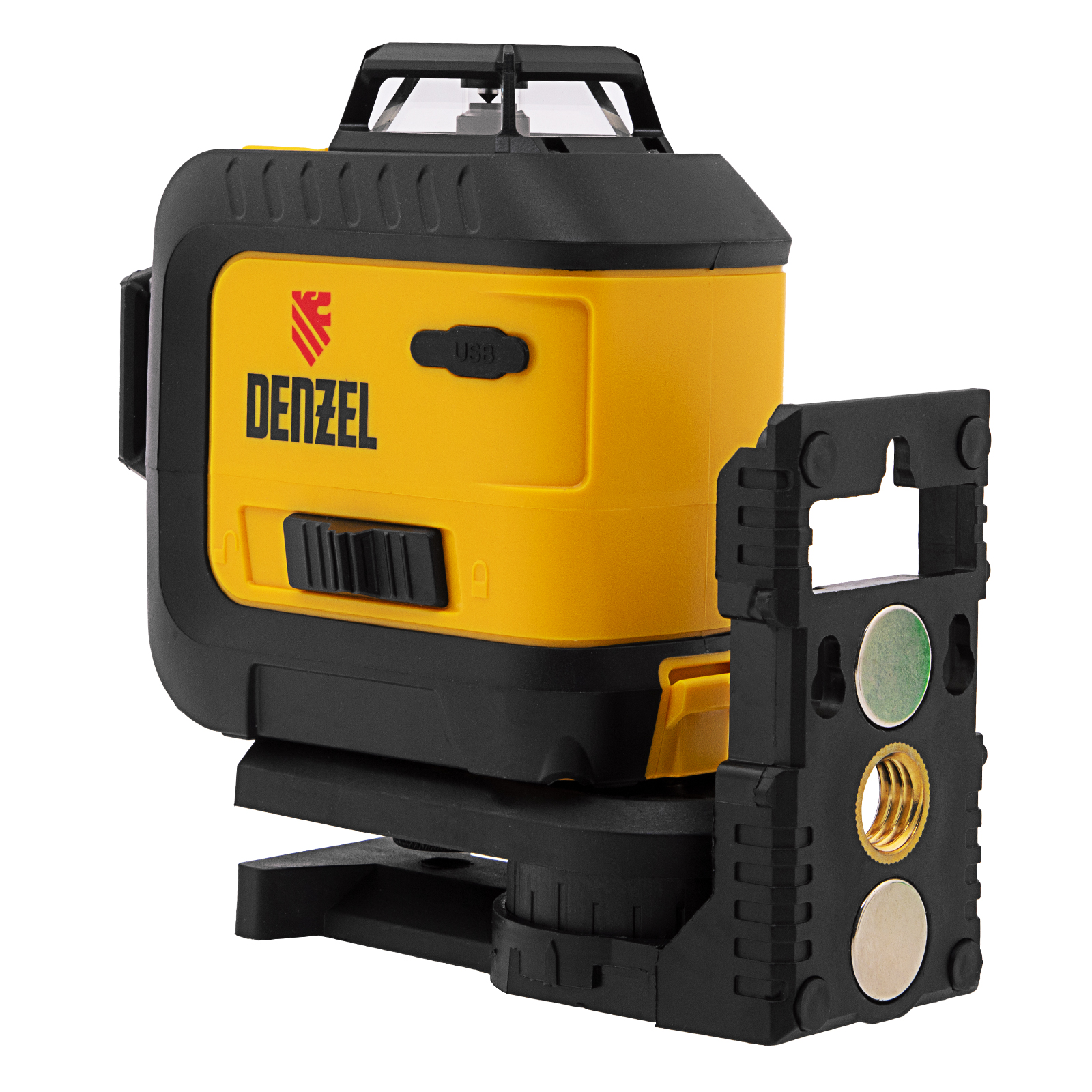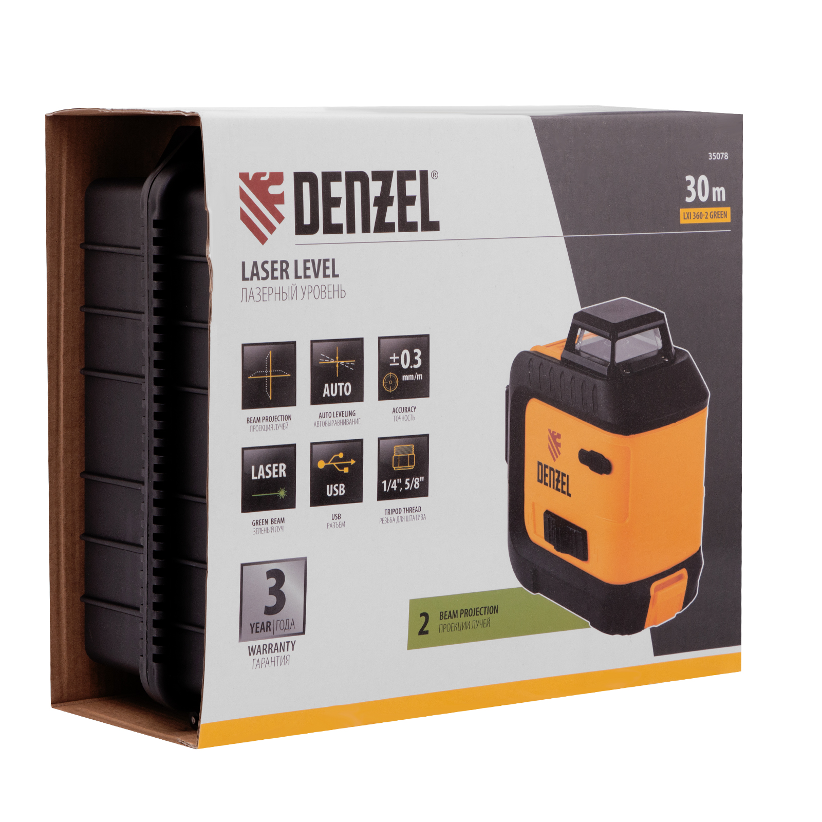 Мультипризменный лазерный уровень Denzel LXI 360-2 Green 35078 с резьбой под штатив 1/4"" проецирует 2 взаимно перпендикулярные линии с охватом в 360° на расстояние до 30 м при помощи зеленых лучей длиной 520 нм. Точность составляет ±0,3 мм/м. Уровень используется для построения разметки во время проведения отделочных и строительных работ. Подходит для площадки длиной до 60 м.ПреимуществаПростое управление — для работы с уровнем не требуются специальные знания и навыки.Возможность установки на штатив — в нижней части корпуса имеется резьба 1/4"".Точная разметка — уровень имеет функцию самовыравнивания, в случае отклонения по горизонтали более чем на 4° срабатывает световое оповещение.Построение разметки под углом — предусмотрена возможность отключения опции самовыравнивания.Яркие лучи — зеленые лазерные диоды Osram обеспечивают отличную видимость проекции даже при дневном освещении.Индикация уровня заряда — работа не прервется в неподходящий момент.Экономия заряда аккумулятора — неиспользуемые лучи можно отключать.Фиксация маятника — механизм самонивелирования защищен от повреждений во время транспортировки.Степень защиты IP54 — корпус из ударопрочного пластика не пропускает пыль и капли воды.Мобильность — прибор не зависит от наличия электророзетки, что позволяет брать его на выездные работы.Удобное хранение и транспортировка — компактный уровень упакован в надежный пластиковый кейс.Подтвержденное качество — гарантия на заводской брак действует 3 года.
