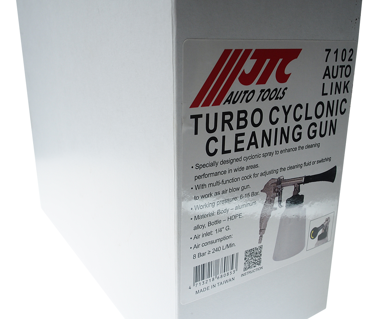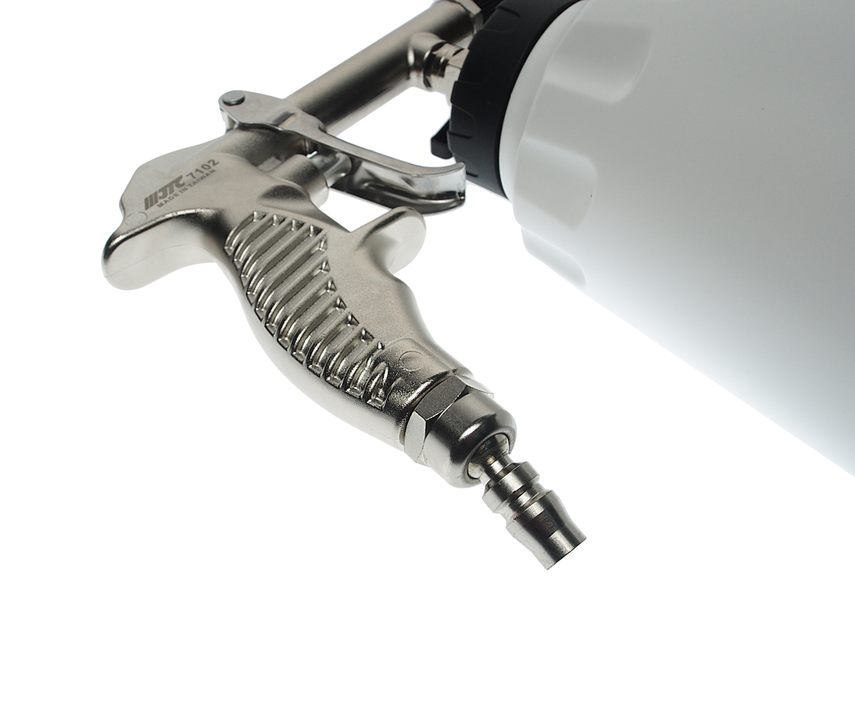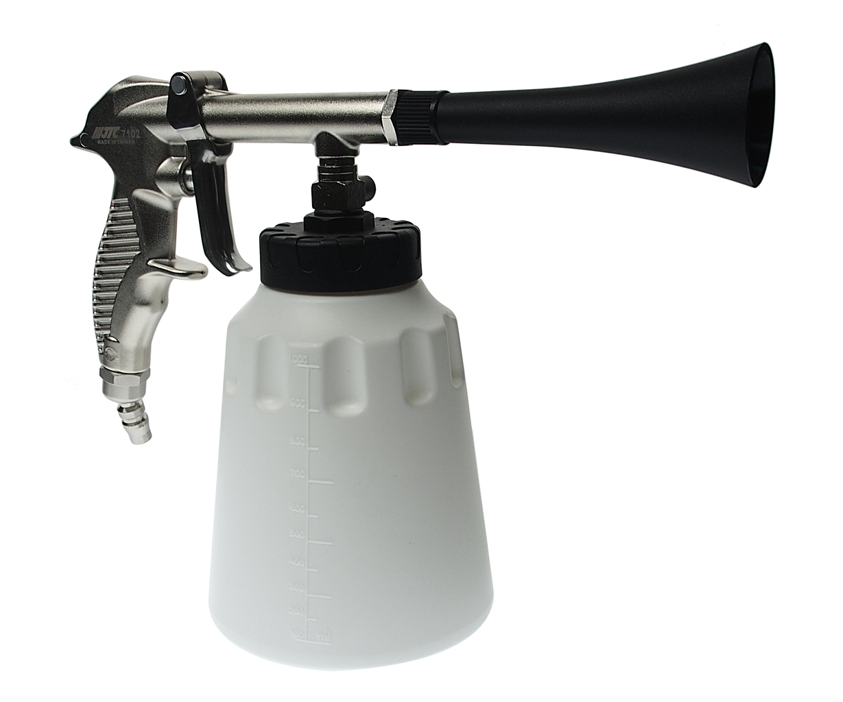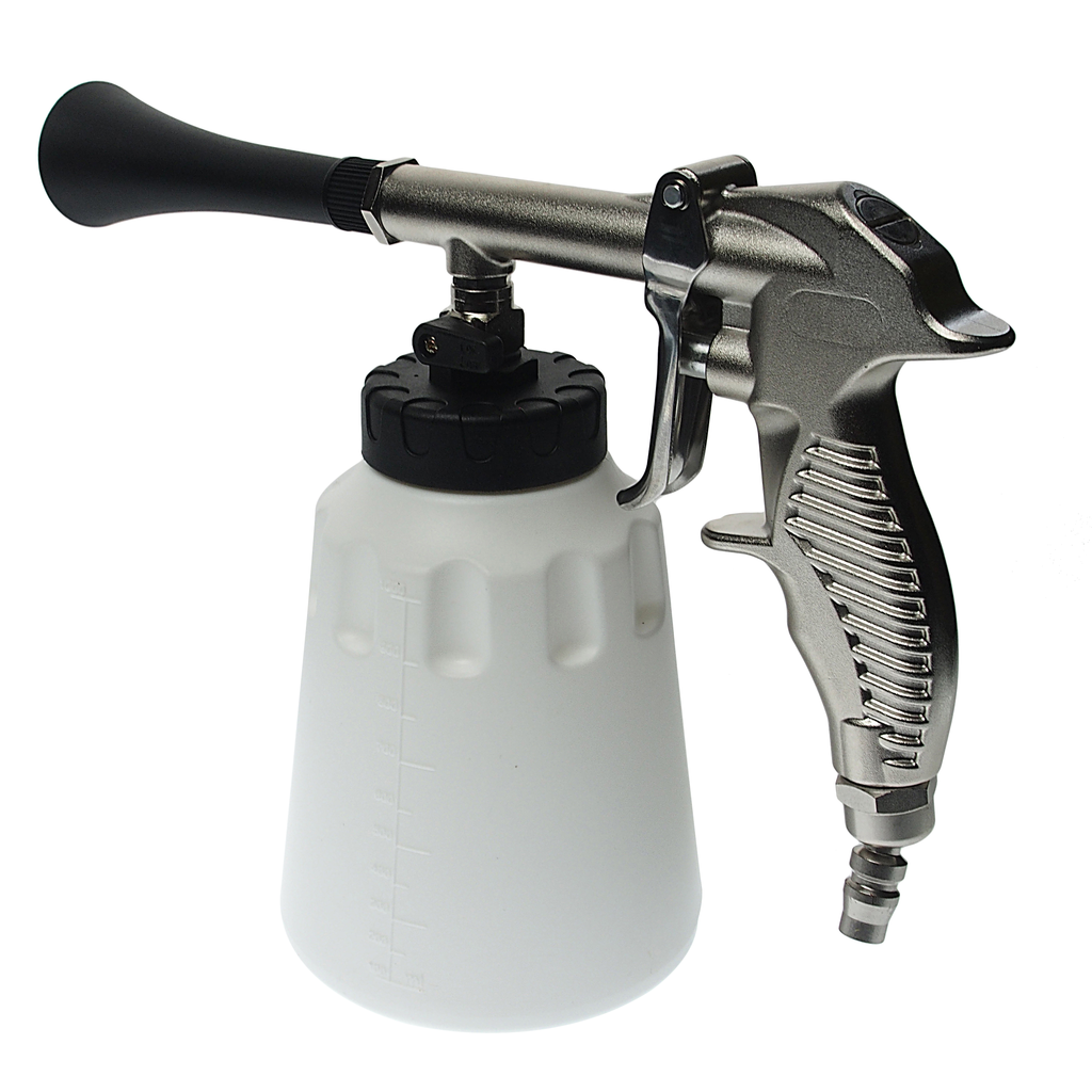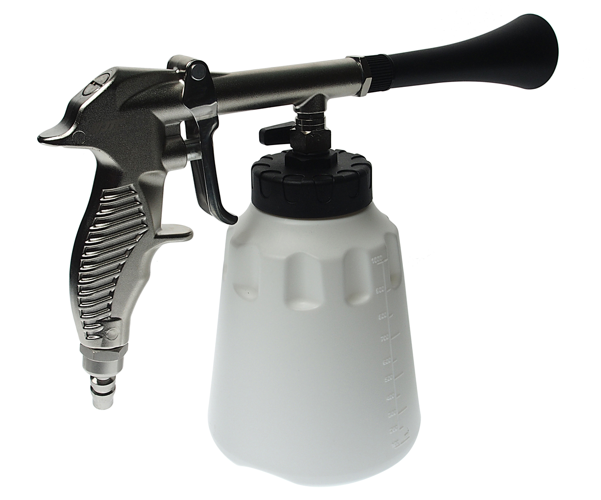 Применяется для очистки автомобильных сидений, обшивки, внутренних элементов салона и подкапотного пространства. Соединительный штуцер: 1/4" PT. Рабочее давление: 6-15 бар. Рукоятка из алюминиевого сплава, емкость — HDPE. Расход воздуха: 8 бар ≥240 л/мин.