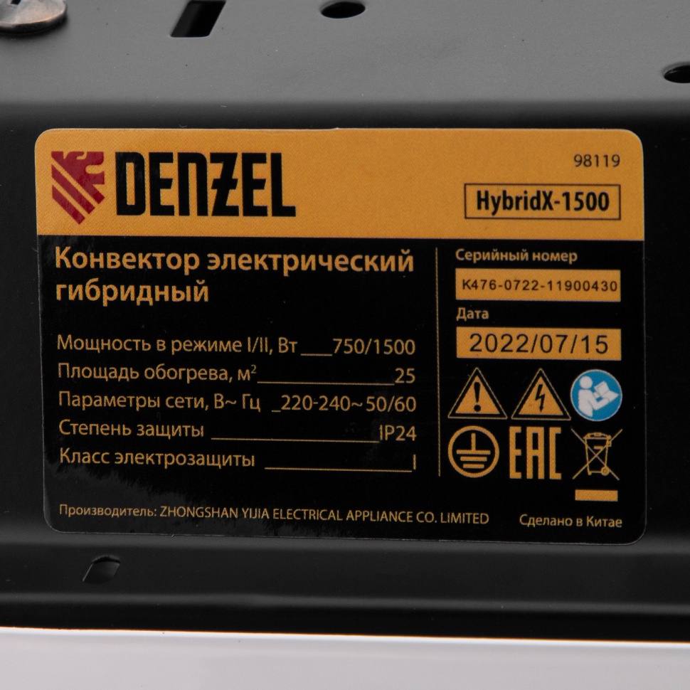 Гибридный электрический конвектор Denzel HybridX-1500 98119 с X-образным инфракрасным нагревательным элементом, LED-дисплеем и цифровым термостатом рассчитан на обогрев закрытых помещений площадью до 25 кв.м. Оптимален для использования в квартирах, на дачах, в офисах, а также в бытовых, общественных и производственных помещениях. Регулировка мощности 750/1500 Вт позволяет выставить желаемую скорость обогрева помещения. Устройство поддерживает механический и автоматический режимы, что позволяет максимально точно настроить его работу под свои потребности.ПреимуществаВысокая энергоэффективность — гибридный нагревательный элемент излучает инфракрасное тепло и одновременно обеспечивает конвекцию воздуха, что позволяет прогревать помещение заметно быстрее при тех же затратах энергии.Отсутствие неприятного запаха — конвектор не сушит воздух и не сжигает пыль.Двойная защита — специальные датчики отключают конвектор в случае перегрева и опрокидывания, что делает его применение максимально безопасным.Цифровой термостат — просто запрограммируйте необходимую температуру и она будет поддерживаться автоматически.Интуитивно понятная навигация — электронная панель управления с ярким информативным дисплеем отображает все необходимые параметры работы и позволяет быстро переключаться на нужный режим.24-часовой таймер — в механическом режиме можно установить желаемое время включения, что позволит приходить после работы в теплую квартиру и не замерзать ночью.Недельная программа таймера — в автоматическом режиме пользователь может выбрать день и время, когда конвектор включится (на каждый день предусмотрено по 4 таймера работы).Функция запоминания — после отключения в памяти устройства сохраняются последние выставленные таймеры и температура.Датчик открытого окна — конвектор автоматически отключается при поступлении холодного воздуха и понижении температуры в помещении, что позволяет избежать потери электроэнергии.Защита от детей — панель управления устройством можно заблокировать, тем самым обеспечив безопасную работу в квартире, где есть маленькие домочадцы.Долговечность — срок службы нагревательного элемента составляет 25 лет.Бесшумная работа — конвектор можно ставить в зонах отдыха и включать на время сна.Напольная/настенная установка — быстросъемные колесные опоры, кронштейн для крепления к стене и необходимый крепеж входят в комплект поставки.Возможность использования в ванных комнатах — нагревательный элемент надежно защищен от попадания влаги, что позволяет устанавливать устройство в санузлах.Гарантия 3 года — качество и надежность конвектора подтверждены производителем.