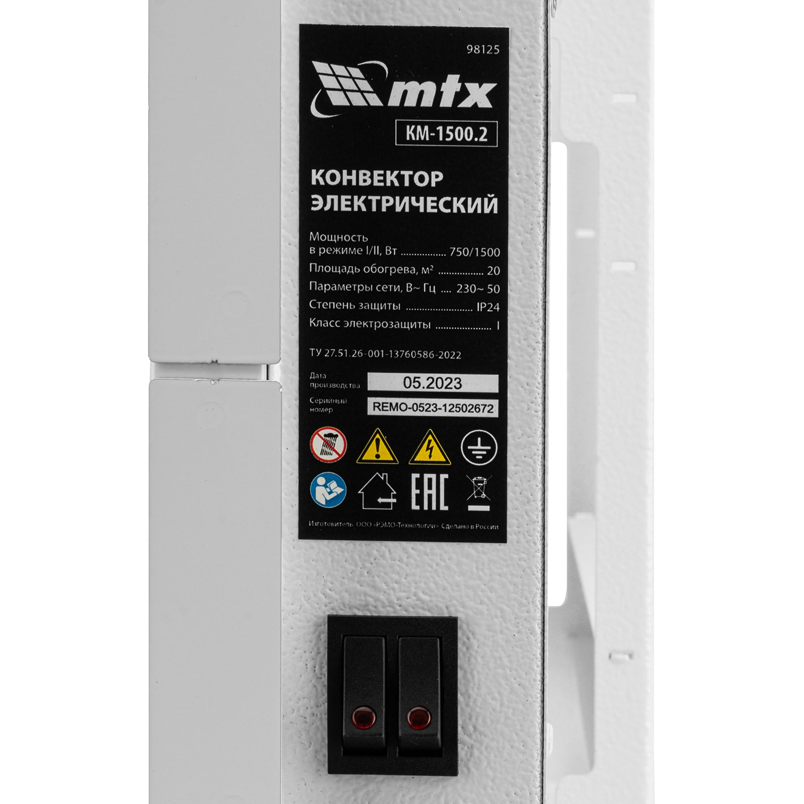 Конвектор электрический MTX KM-1500.2 98125 с X-образным нагревателем, колесами на металлической опоре и термостатом, мощностью 1500 Вт, предназначен для использования в закрытых помещениях: квартирах, офисах, загородных домах, на даче, на производстве и в общественных местах. Рекомендуемая площадь обогрева составляет 20 кв.м. Х-образный нагревательный элемент обеспечивает быстрый и равномерный прогрев помещения до необходимой температуры, при этом не сушит воздух.Преимущества2 режима работы (полный обогрев на мощности 1500 Вт и частичный на 750 Вт) — конвектор позволяет прогревать холодное помещение и поддерживать тепло в отапливаемом.Все выполнено из металла — корпус, крепежная рамка.Премиум дизайн — глянцевая лицевая панель конвектора хорошо вписывается в интерьер.Антивандальное покрытие «Белая шагрень» — имеет в 3 раза выше прочность относительно обычной краски.Оптимальная циркуляция воздушного потока — внутри конвектора установлен специальный отражающий экран, рассчитанный согласно законам термодинамики.Термозащита — конвектор отключается в случае перегрева, что делает его использование безопасным и предотвращает выход из строя.Удобная настройка и автоматическое поддержание заданных параметров — механический термостат позволяет задать и точно поддерживать температуру в помещении.Комфортная эксплуатация — конвектор не сушит воздух и не сжигает пыль, что исключает появление неприятного запаха в помещении.Надежность и долговечность — Х-образный нагревательный элемент отличается самым большим сроком службы в сравнении с другими нагревательными элементами и обеспечивает равномерную конвекцию без риска локальных перегревов.Возможность использования в ванной комнате — нагревательный элемент выдерживает эксплуатацию в условиях повышенной влажности.Мобильность — колеса облегчают перемещение обогревателя.Два варианта монтажа — конвектор можно расположить на полу или повесить на стену (колесные опоры и кронштейн входят в комплект поставки).Цельнометаллическая крепежная рамка — облегчает монтаж конвектора на стену и повышает жесткость конструкции.