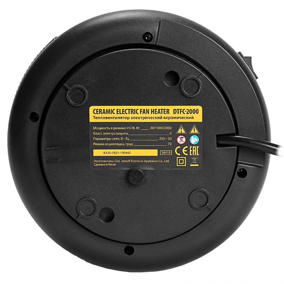 Электрический тепловентилятор Denzel DTFC-2000, 96419 с керамическим нагревательным элементом предназначен для обогрева и вентилирования бытовых помещений площадью до 20 м2. Он позволяет поддерживать комфортный климатический режим как в холодное, так и в теплое время года. Удобный и компактный тепловентилятор способен работать в 3 режимах: вентиляция, обогрев теплым и горячим воздухом. С помощью цифрового терморегулятора можно настроить необходимую температуру.ПреимуществаПростое управление — для удобства пользователя вверху расположена панель с LED дисплеем и световой индикацией, также в комплект поставки входит пульт дистанционного управления.Таймер — пользователь может установить время до окончания работы.Керамический нагревательный элемент — тепловентилятор не выделяет вредных веществ, не сушит воздух и не сжигает пыль.Безопасность — защита от перегрева исключает возникновение аварийных ситуаций.Защита при опрокидывании — в нижней части корпуса находится специальная кнопка, которая срабатывает при падении и выключает тепловентилятор.Режим осцилляции — данная функция позволяет менять угол направленности воздушного потока до 70 градусов для равномерного прогрева помещения.Мобильность — тепловентилятор оснащен ручкой для удобства перемещения.