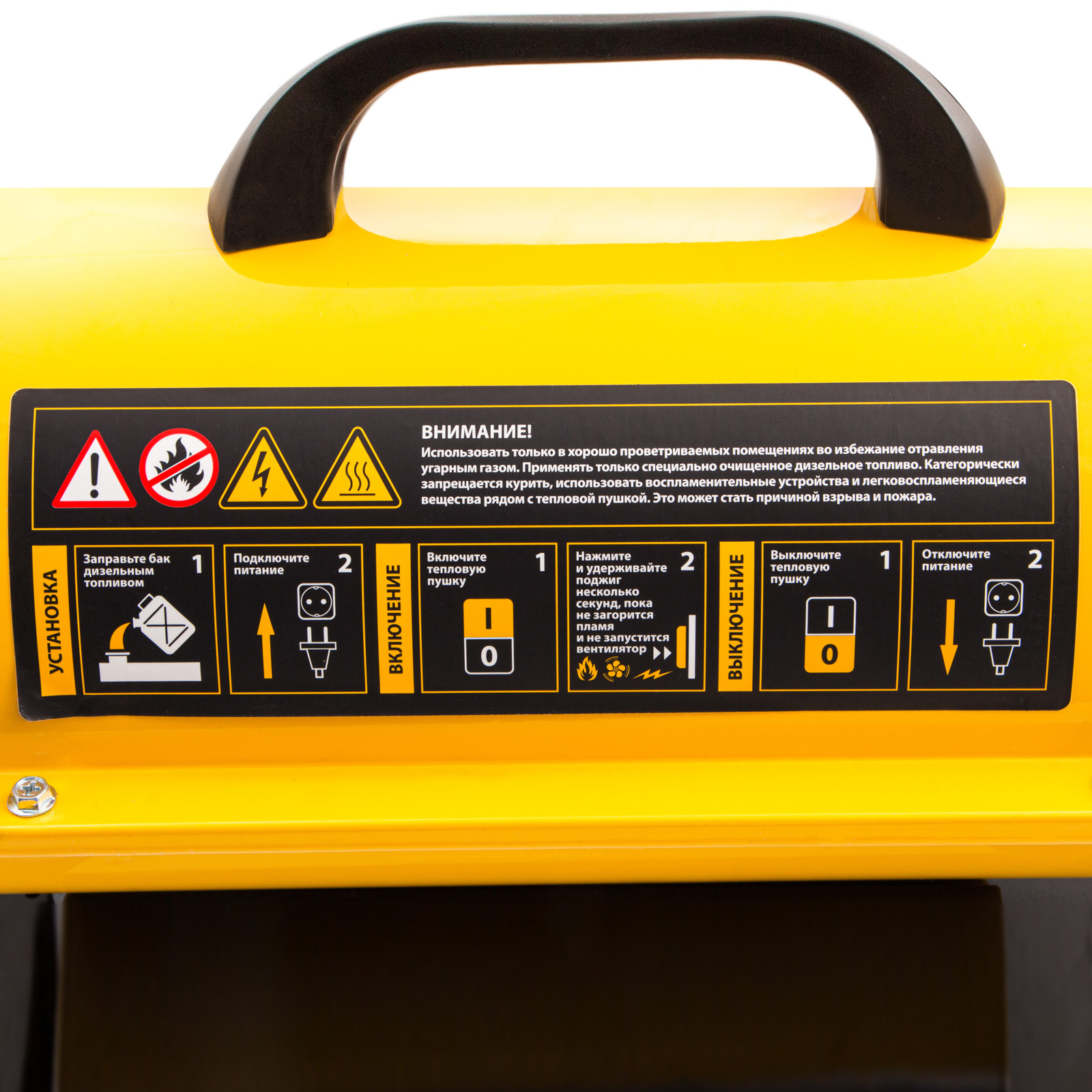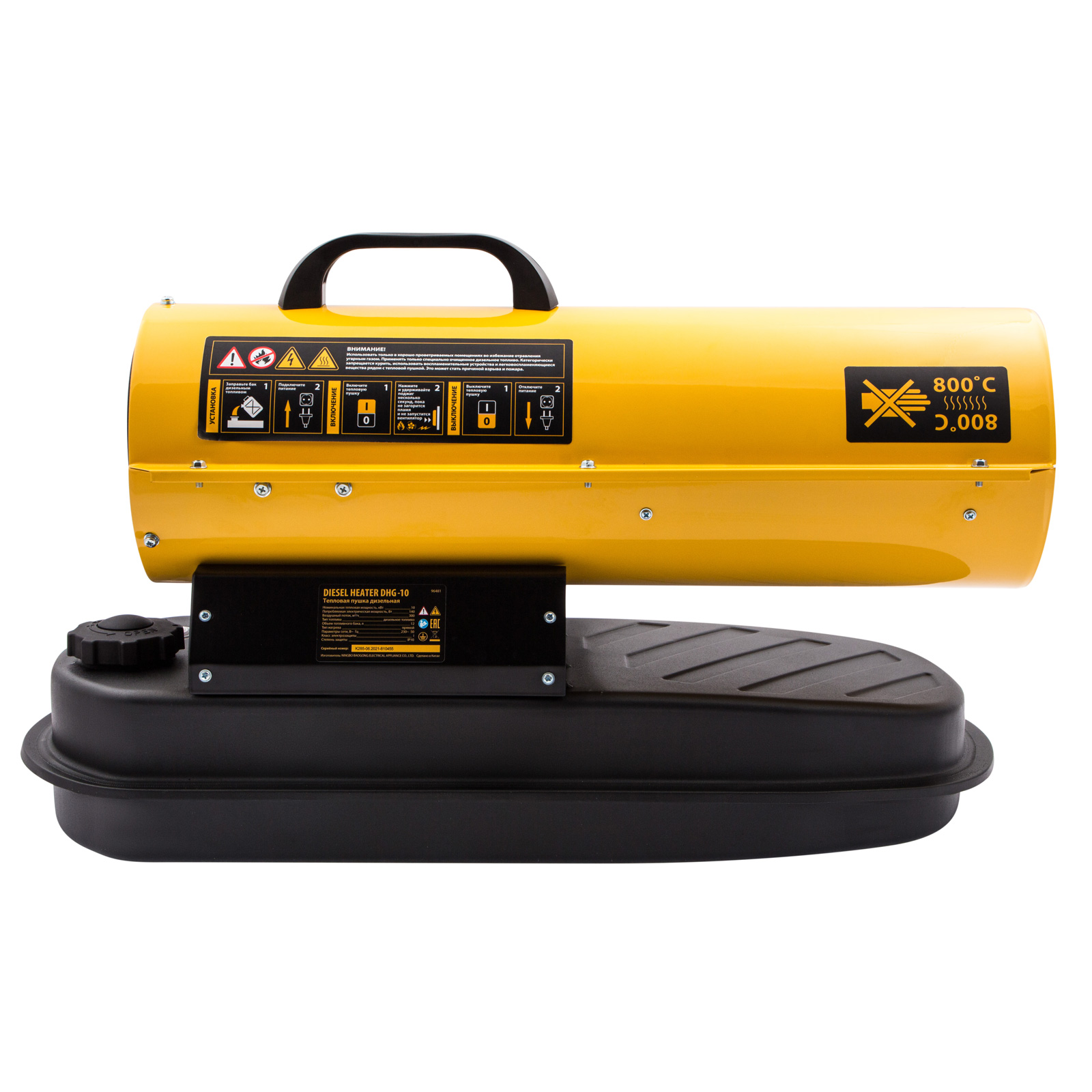 Дизельная тепловая пушка Denzel DHG-10 96481 мощностью 10 кВт и производительностью 300 куб. м/ч предназначена для прямого нагрева воздуха в цехах, ангарах, хранилищах и других нежилых помещениях с хорошей вентиляцией. Максимальная площадь обогрева составляет 100 кв. м. Пушка служит эффективным источником тепла в полярных экспедициях. Пригодится также на строительной площадке для прогрева бетона, просушки стен и разморозки траншей. Для заправки может использоваться любое дизельное топливо: летнее, зимнее и арктическое.ПреимуществаВстроенная система безопасности — подача топлива прекращается в случае затухания пламени, перегрева и отключения питания.Эффективность — благодаря системе прямого нагрева и теплоотражающему экрану воздух в помещении прогревается быстро и равномерно.Низкий расход топлива — продолжительность работы без дозаправки составляет 12 часов.Датчик уровня топлива — своевременная заправка бака позволяет избежать перерывы в работе.Защита от засорения — встроенный фильтр грубой очистки препятствует попаданию в топливную систему посторонних частиц.Подтвержденное качество — на устройство действует гарантия 3 года.