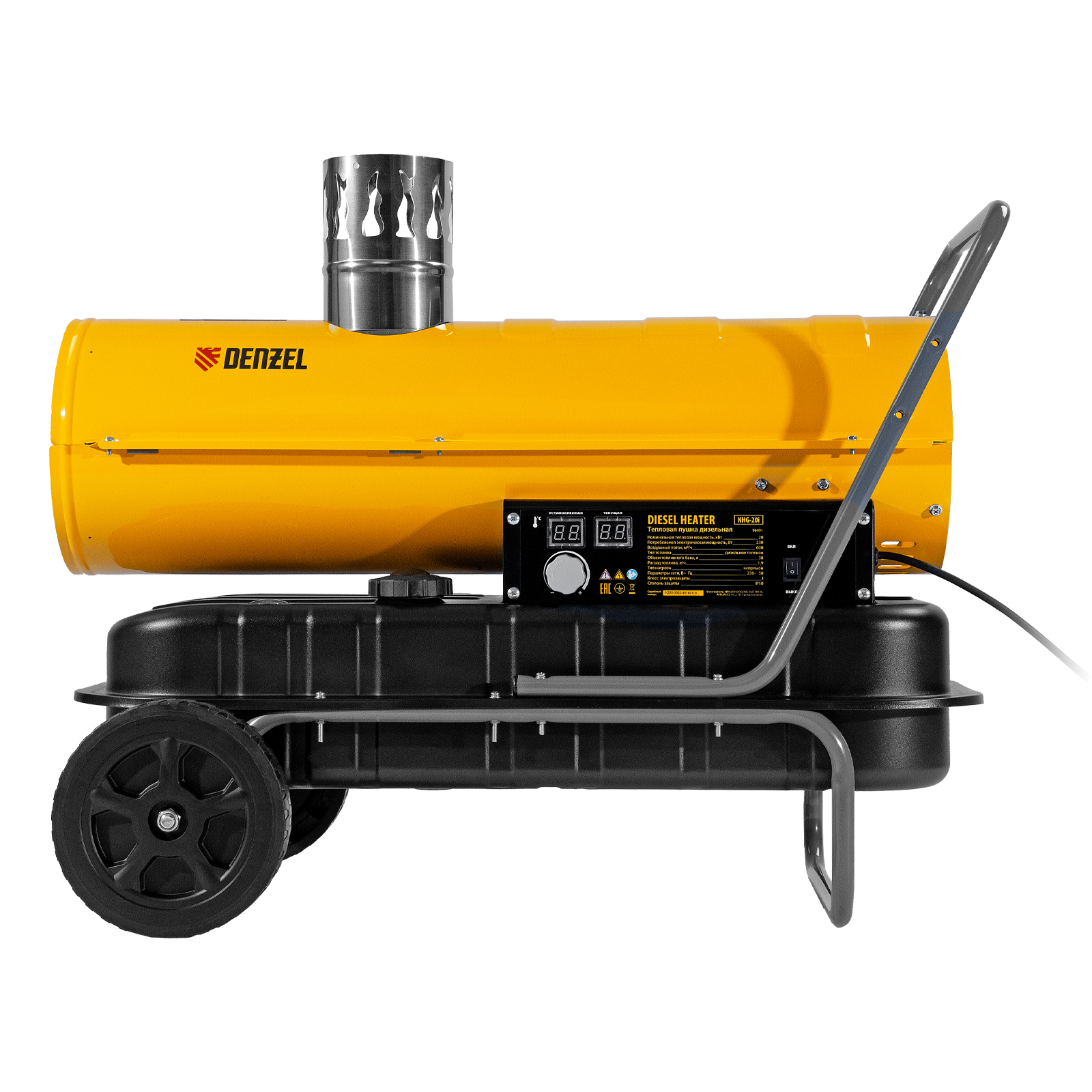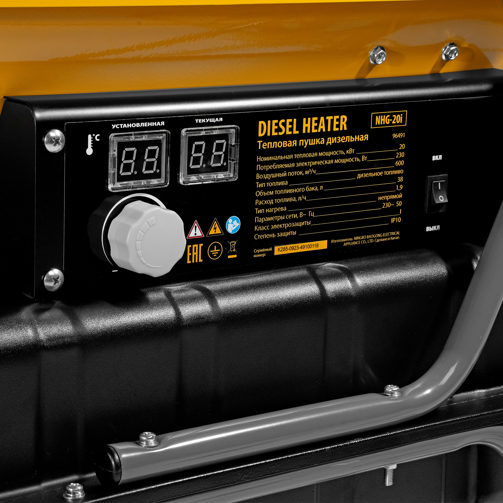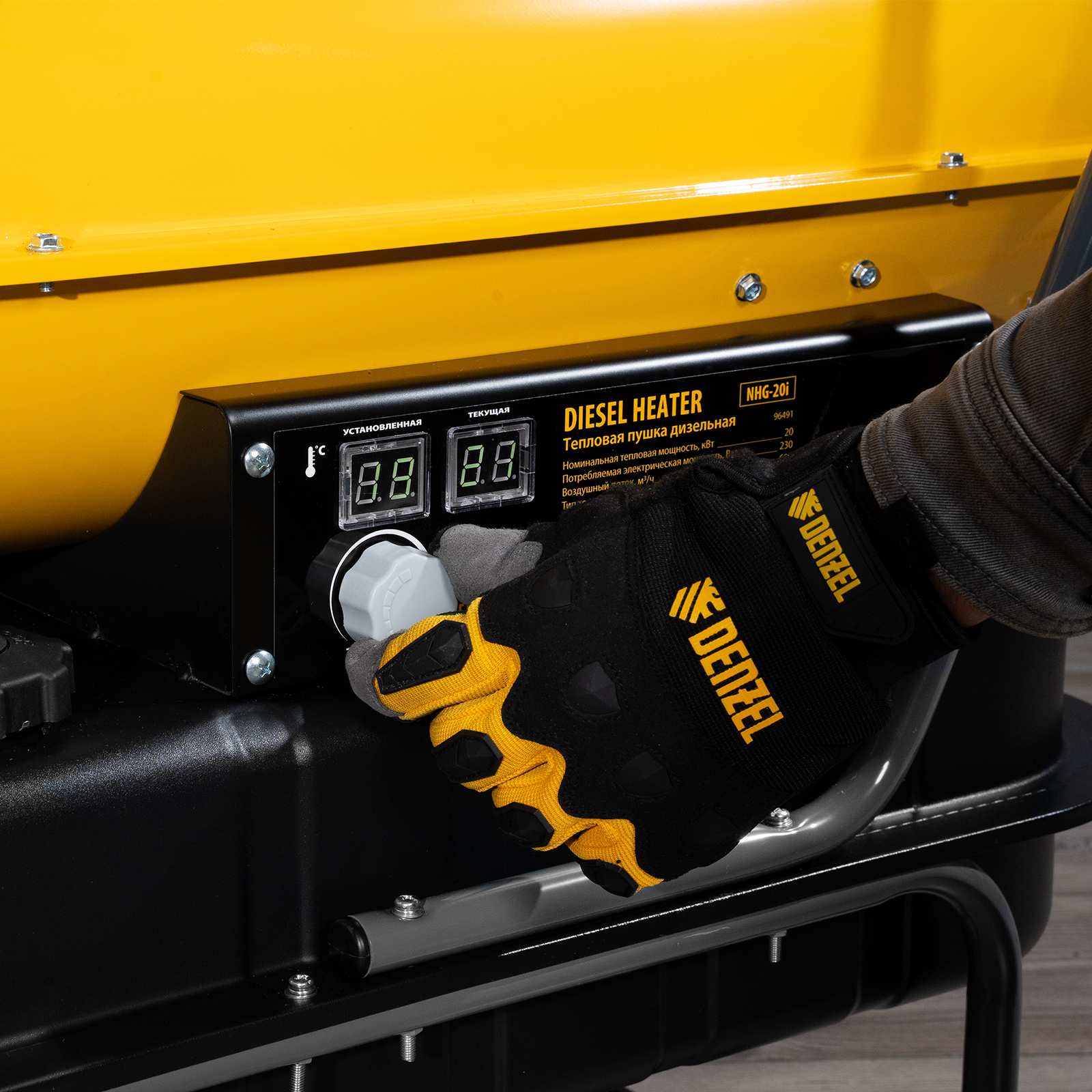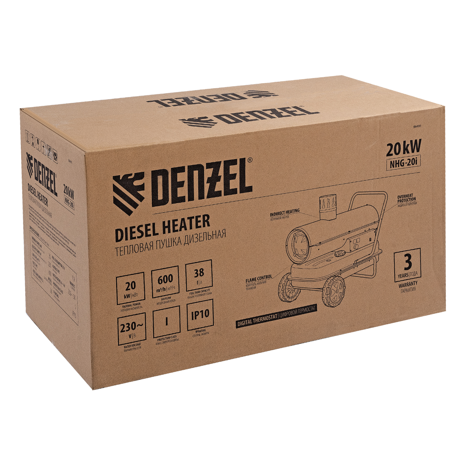 Дизельная тепловая пушка непрямого нагрева DENZEL NHG-20i 96491 с цифровым термостатом обладает тепловой мощностью 20 кВт и генерирует поток теплого воздуха 600 м3/ч. Предназначена для обогрева шатров, палаток, складов, а также технических помещений, ангаров, теплиц и строительных объектов. В работе пушки используется схема непрямого нагрева: при помощи отводного патрубка продукты горения можно полностью вывести за пределы помещения. Такое решение позволяет использовать устройство в присутствии людей. Преимущества Автономная работа — достаточно нажать на кнопку пуска, и автоматика включит подачу топлива и зажигание, по достижении заданной температуры пушка отключится. Контроль нагрева с точностью до 1 °C — цифровой термостат позволяет устанавливать требуемую температуру. Удобный контроль параметров работы — на дисплее можно увидеть значения заданной и текущей температуры воздуха в помещении. Термозащита — при перегреве срабатывает специальный датчик, и тепловая пушка отключается. Безопасная работа — встроенная система защиты прекращает подачу топлива в случае затухания пламени или отключения электропитания. Низкий расход топлива — полного бака хватит на 20 часов работы без дозаправки. Работа без непредвиденных остановок — топливный датчик подскажет, когда следует наполнить бак. Мобильность — благодаря колесам и удобной ручке вы можете легко и быстро перемещать пушку. Гарантия 3 года — высокое качество тепловой пушки подтверждено производителем.