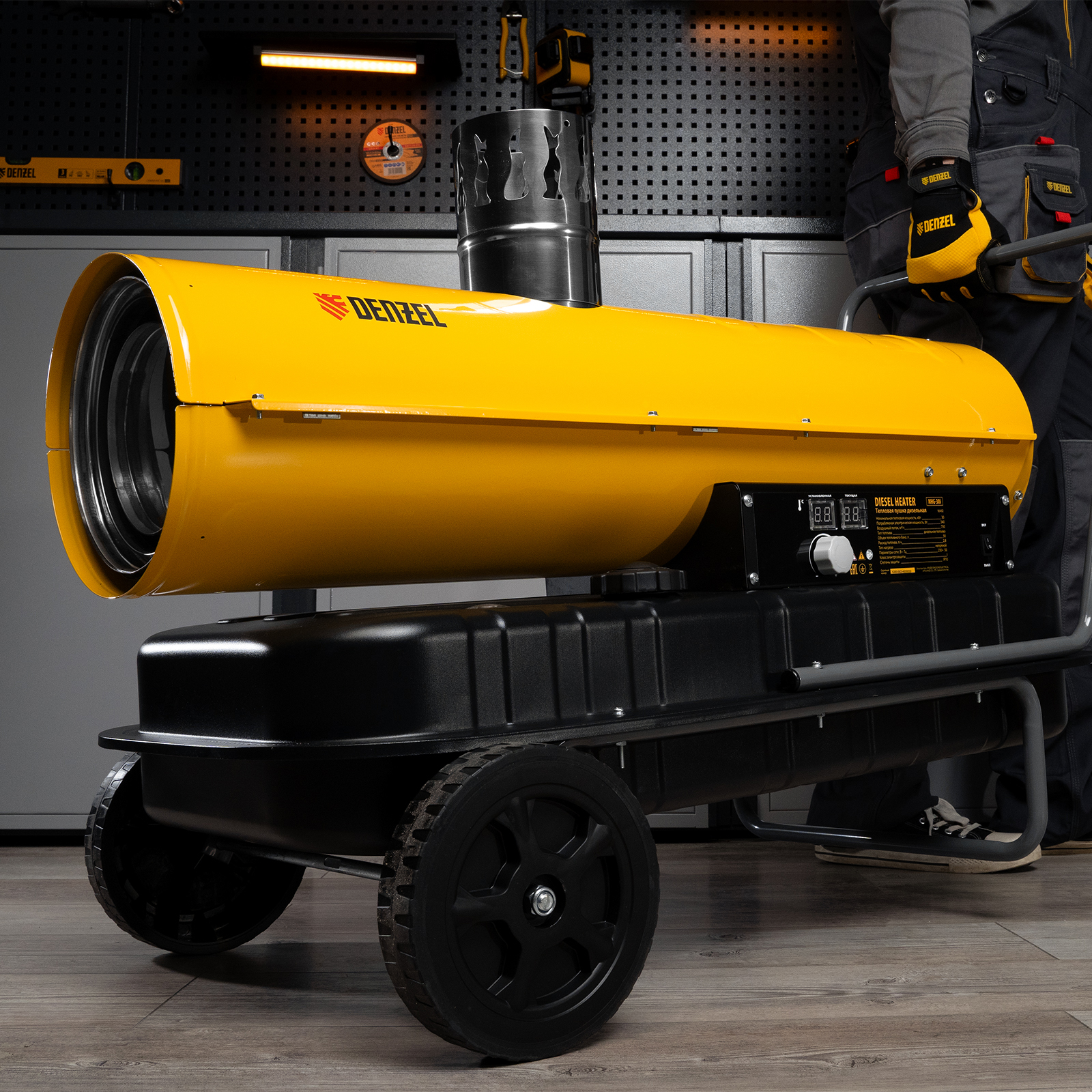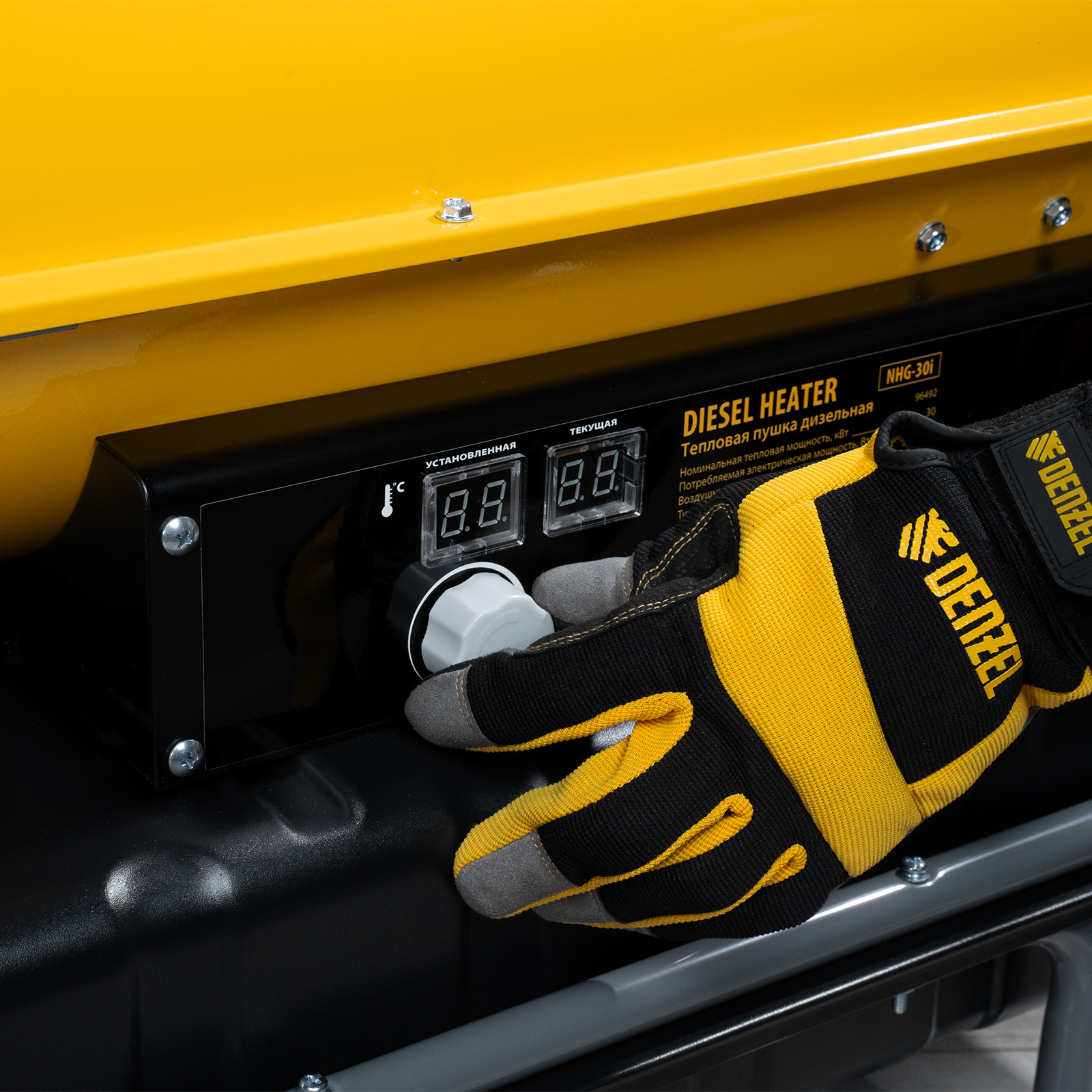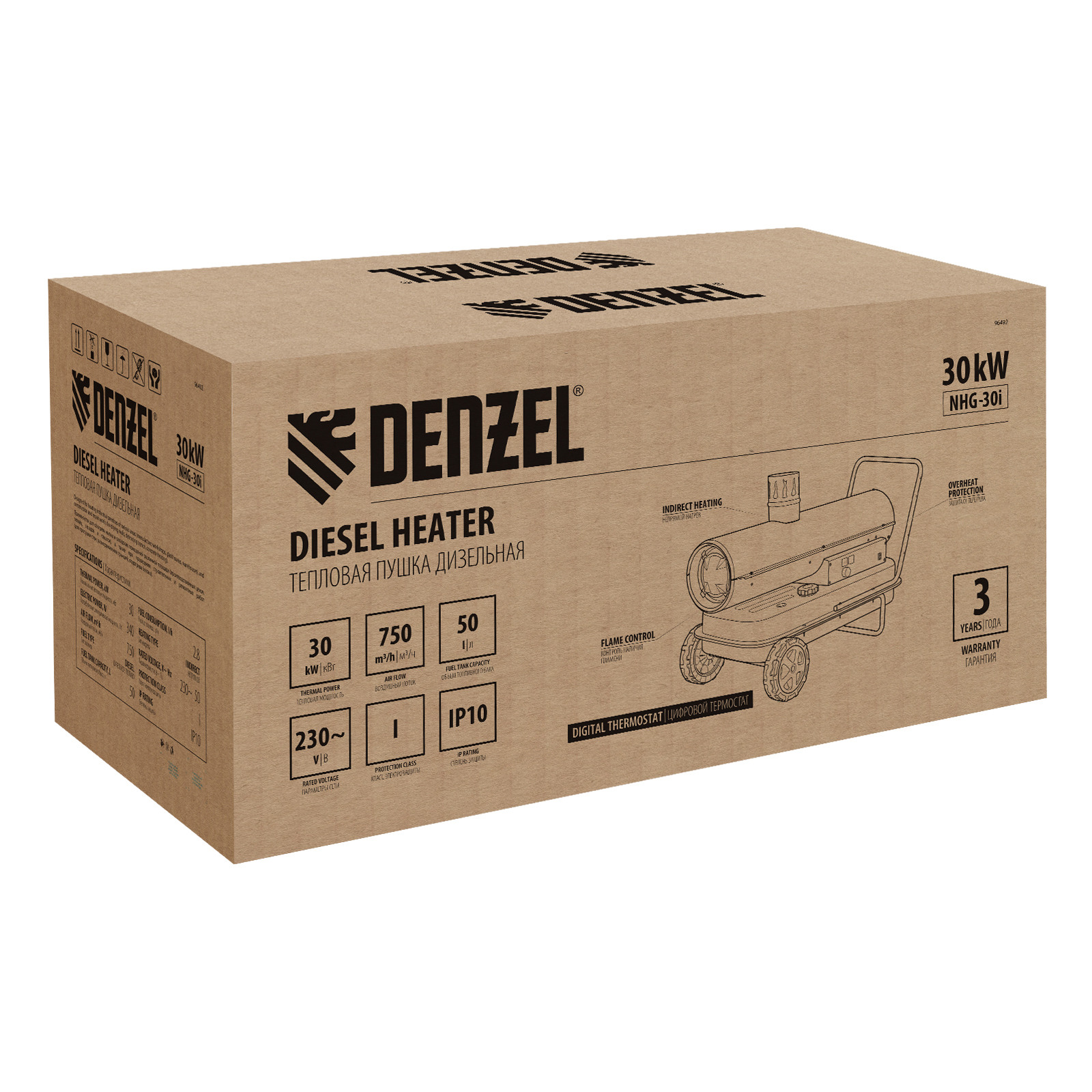Дизельная тепловая пушка непрямого нагрева DENZEL NHG-30i 96492 с цифровым термостатом обладает тепловой мощностью 30 кВт и генерирует поток теплого воздуха 750 м3/ч. Предназначена для обогрева шатров, палаток, складов, а также технических помещений, ангаров, теплиц и строительных объектов. В работе пушки используется схема непрямого нагрева: при помощи отводного патрубка продукты горения можно полностью вывести за пределы помещения. Такое решение позволяет использовать устройство в присутствии людей. Преимущества Автономная работа — достаточно нажать на кнопку пуска, и автоматика включит подачу топлива и зажигание, по достижении заданной температуры пушка отключится. Контроль нагрева с точностью до 1 °C — цифровой термостат позволяет устанавливать требуемую температуру. Удобный контроль параметров работы — на дисплее можно увидеть значения заданной и текущей температуры воздуха в помещении. Термозащита — при перегреве срабатывает специальный датчик, и тепловая пушка отключается. Безопасная работа — встроенная система защиты прекращает подачу топлива в случае затухания пламени или отключения электропитания. Низкий расход топлива — полного бака хватит на 18 часов работы без дозаправки. Работа без непредвиденных остановок — топливный датчик подскажет, когда следует наполнить бак. Мобильность — благодаря колесам и удобной ручке вы можете легко и быстро перемещать пушку. Гарантия 3 года — высокое качество тепловой пушки подтверждено производителем.