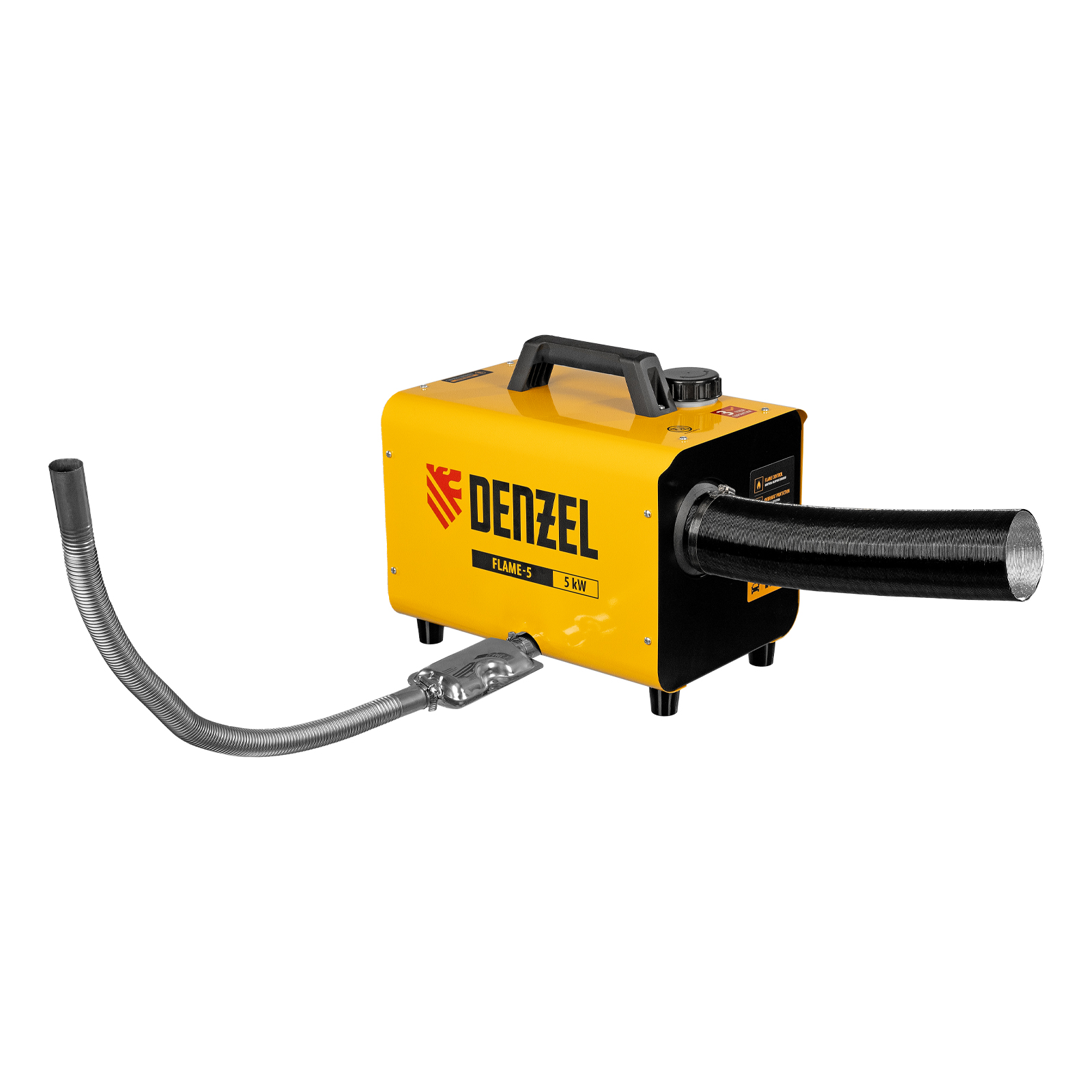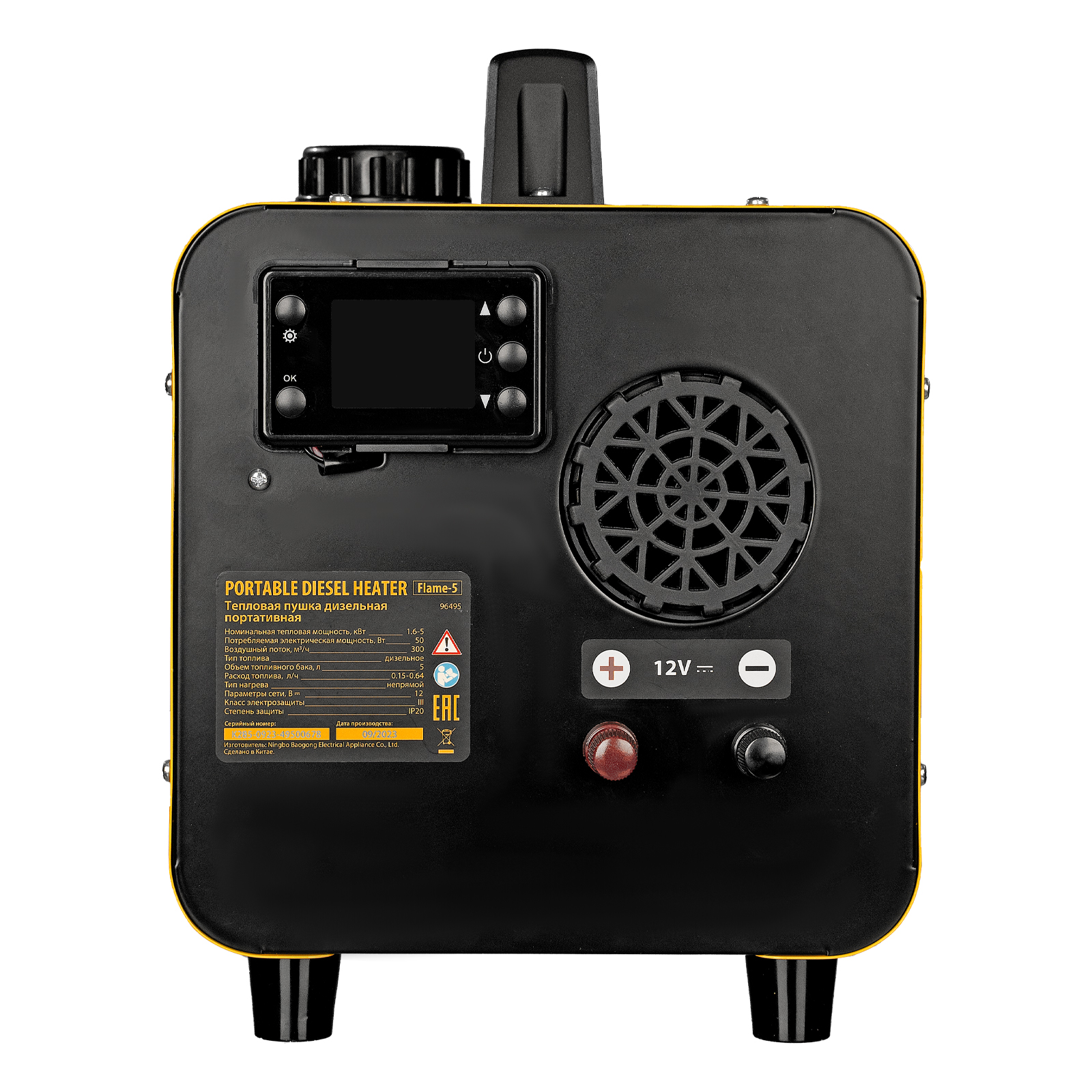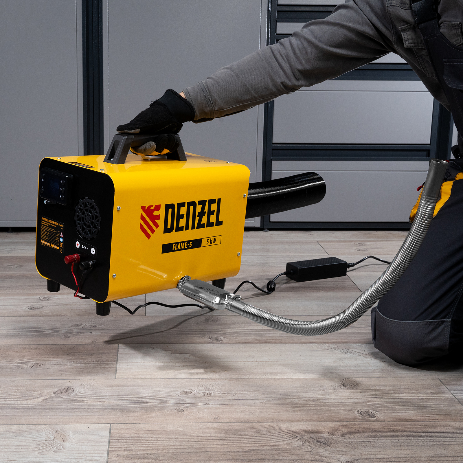 Дизельная тепловая портативная пушка Denzel Flame-5 96495 представляет собой автономный отопитель с максимальной мощностью 5 кВт, с цифровым термостатом. Работает по принципу непрямого нагрева, то есть выхлопные газы выводятся отдельно, не смешиваясь с потоком теплого воздуха. Предназначена для обогрева жилых, бытовых, подсобных и строительных помещений площадью до 50 м2. Портативную пушку размером 412 х 250 х 340 мм удобно перемещать и можно использовать в местах, удаленных от электричества, например, в поездке, походах, на рыбалке и для обогрева автомобиля.ПреимуществаКлимат-контроль — пушка поддерживает заданную температуру в автоматическом режиме.6 ступеней мощности — при необходимости задать мощность обогрева можно вручную.Быстрый старт — пушка оснащена трансформатором розжига, запуск осуществляется одним нажатием на кнопку.Цифровой термостат — можно задать желаемую температуру с точностью до 1 °C в диапазоне от 5 °C до 40 °C.Термозащита — в случае перегрева система безопасности прекращает подачу топлива для предотвращения поломки техники.Наличие таймера — можно задать отрезок времени, по истечении которого пушка включится или выключится.Длительная эксплуатация без перерывов — полностью заправленная пушка способна проработать на максимальной мощности больше 7 часов.Индикатор уровня топлива — пользователь вовремя сможет определить, когда следует заправить бак.Дистанционное управление — регулировать температуру нагрева, а также включать и выключать пушку можно на расстоянии при помощи пульта (входит в комплект поставки).Полная комплектация — к пушке прилагаются гофротруба и труба для отвода выхлопных газов, кабель питания от аккумулятора с клеммами 5 м, блок питания от сети 230 В (длина шнура 3 м), хомуты и глушитель.Гарантия 3 года — высокое качество дизельной пушки подтверждено производителем.