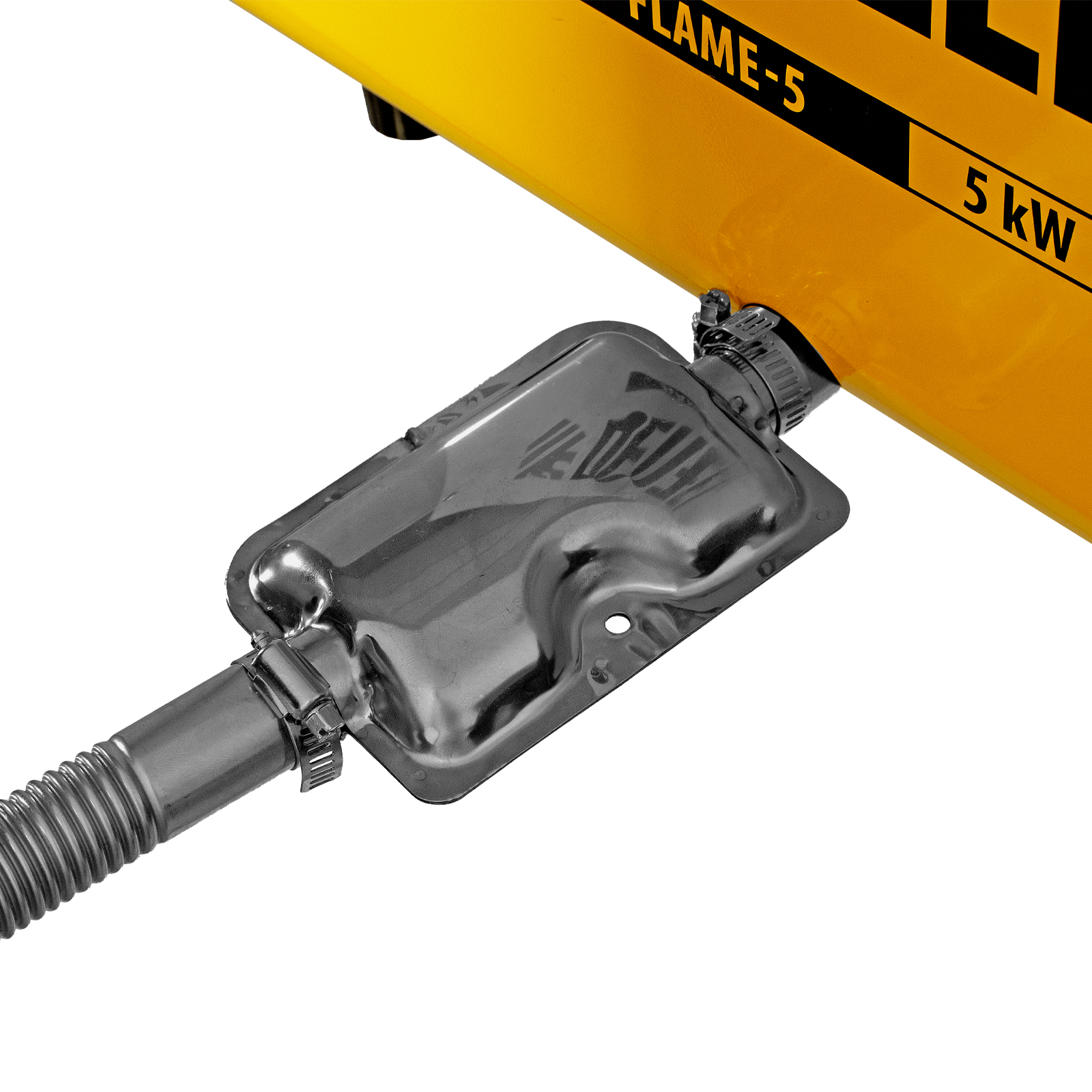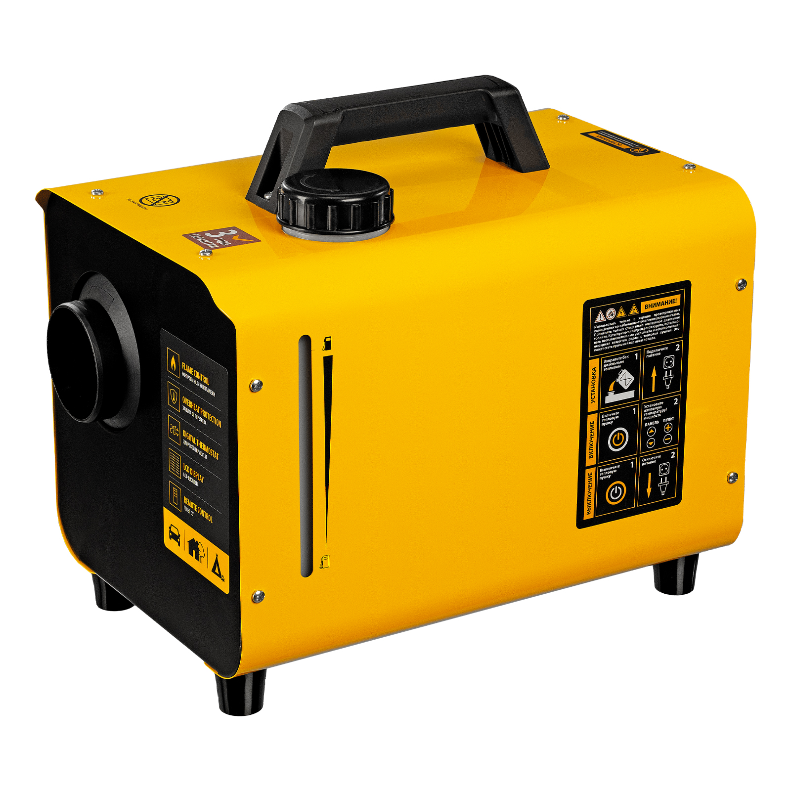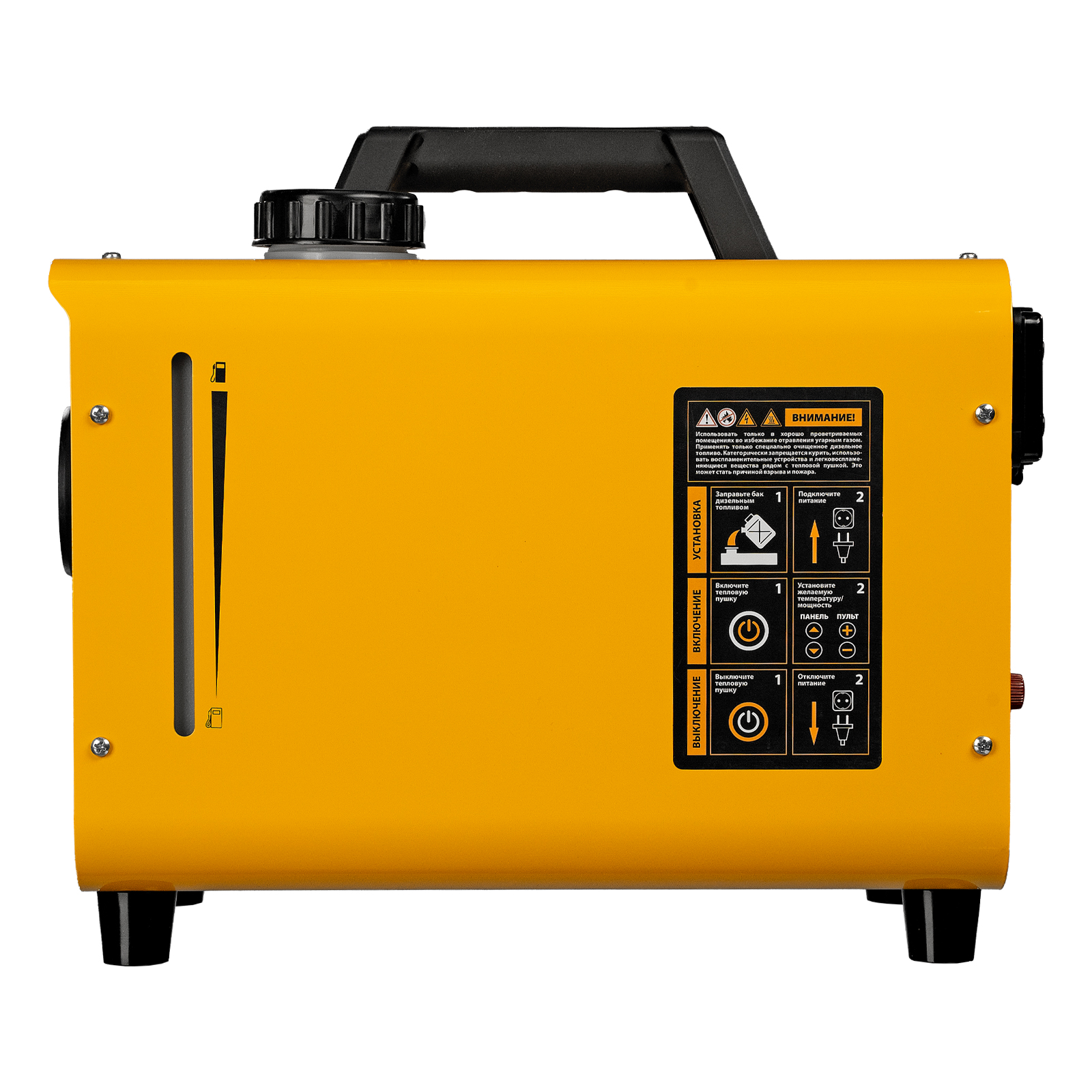 Дизельная тепловая портативная пушка Denzel Flame-5 96495 представляет собой автономный отопитель с максимальной мощностью 5 кВт, с цифровым термостатом. Работает по принципу непрямого нагрева, то есть выхлопные газы выводятся отдельно, не смешиваясь с потоком теплого воздуха. Предназначена для обогрева жилых, бытовых, подсобных и строительных помещений площадью до 50 м2. Портативную пушку размером 412 х 250 х 340 мм удобно перемещать и можно использовать в местах, удаленных от электричества, например, в поездке, походах, на рыбалке и для обогрева автомобиля.ПреимуществаКлимат-контроль — пушка поддерживает заданную температуру в автоматическом режиме.6 ступеней мощности — при необходимости задать мощность обогрева можно вручную.Быстрый старт — пушка оснащена трансформатором розжига, запуск осуществляется одним нажатием на кнопку.Цифровой термостат — можно задать желаемую температуру с точностью до 1 °C в диапазоне от 5 °C до 40 °C.Термозащита — в случае перегрева система безопасности прекращает подачу топлива для предотвращения поломки техники.Наличие таймера — можно задать отрезок времени, по истечении которого пушка включится или выключится.Длительная эксплуатация без перерывов — полностью заправленная пушка способна проработать на максимальной мощности больше 7 часов.Индикатор уровня топлива — пользователь вовремя сможет определить, когда следует заправить бак.Дистанционное управление — регулировать температуру нагрева, а также включать и выключать пушку можно на расстоянии при помощи пульта (входит в комплект поставки).Полная комплектация — к пушке прилагаются гофротруба и труба для отвода выхлопных газов, кабель питания от аккумулятора с клеммами 5 м, блок питания от сети 230 В (длина шнура 3 м), хомуты и глушитель.Гарантия 3 года — высокое качество дизельной пушки подтверждено производителем.