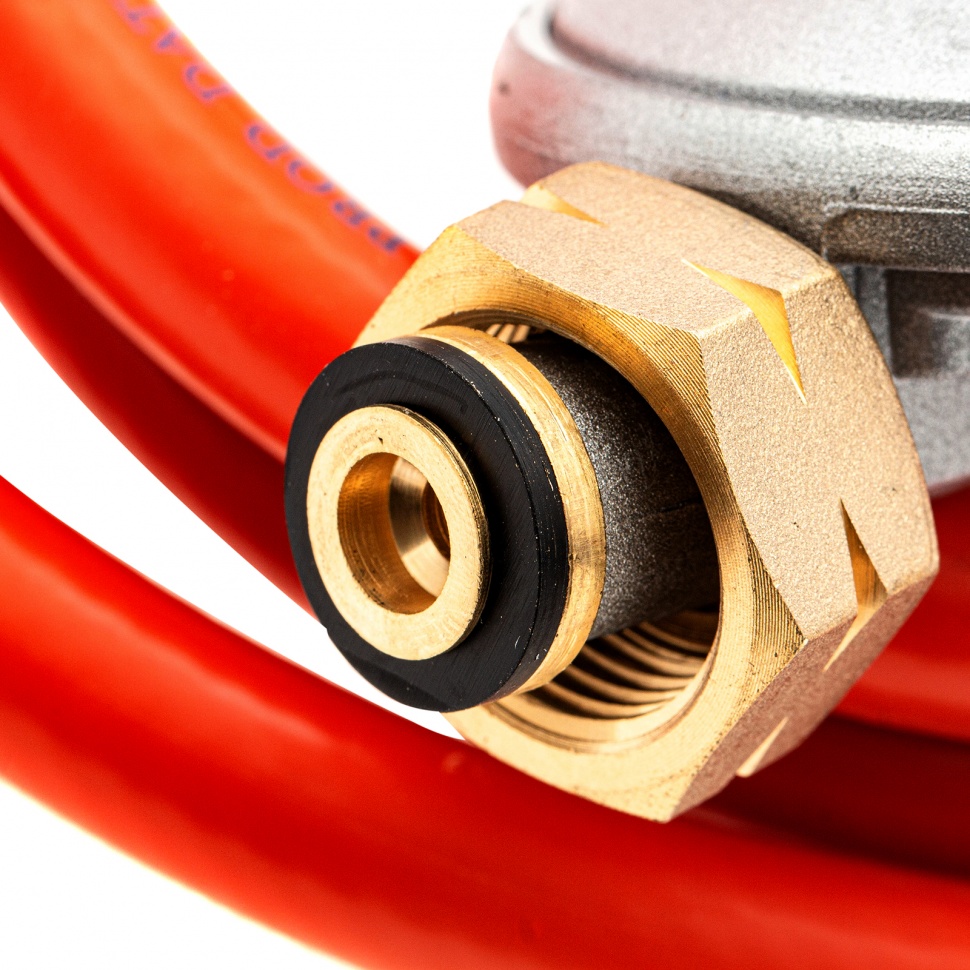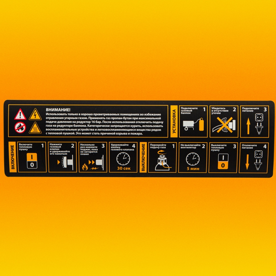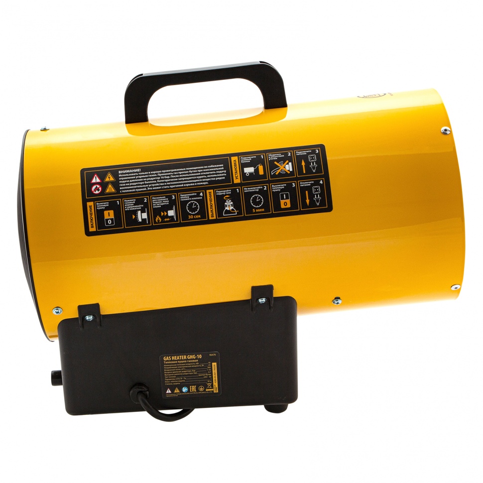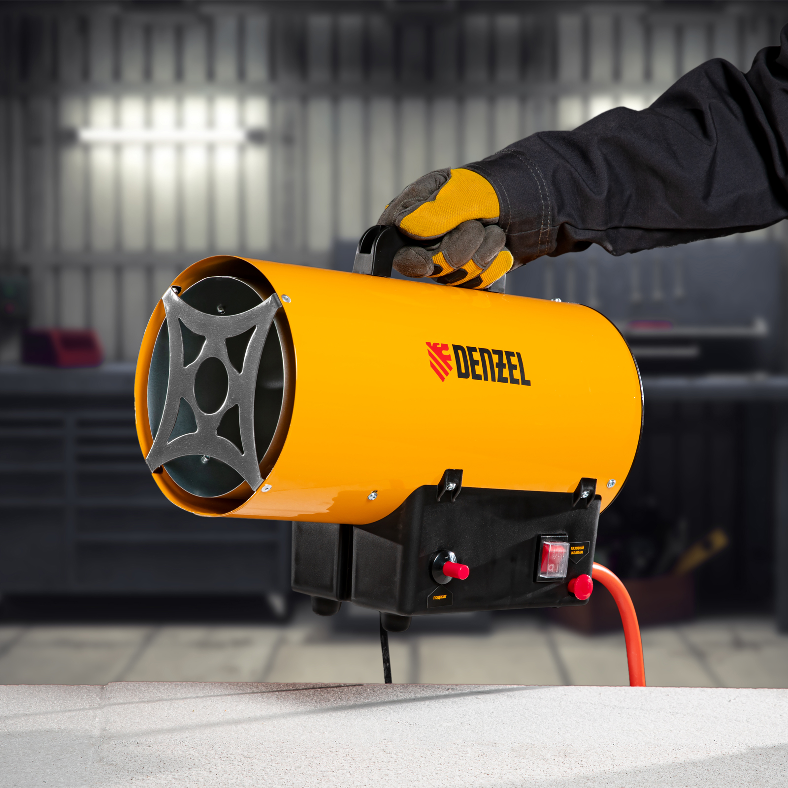 Газовая тепловая пушка Denzel GHG-10 96476 мощностью 10 кВт работает на смеси пропан-бутан и выдает тепловой поток со скоростью 300 куб. м/ч. Используется для обогрева складов, цехов, гаражей, теплиц и других нежилых помещений площадью до 100 кв. м. Будет полезна на строительных площадках и в производственных помещениях, а также для монтажа натяжных потолков.ПреимуществаПрочность и долговечность — передняя решетка изготовлена из нержавеющей стали, стальной корпус покрыт термостойкой краской для защиты от коррозии.Система безопасности — подача газа и электропитание будут отключены в случае перегрева или при отсутствии пламени.Быстрый старт — для запуска тепловой пушки предусмотрен пьезоподжиг.Экономичность — расход газа составляет 0,7 кг/ч, что позволяет реже менять баллон.Безопасность — выключатель питания закрыт влагозащитным кожухом, задняя решетка предотвращает попадание посторонних предметов и поломку оборудования.Устойчивость — благодаря широкой платформе пушка не опрокидывается во время работы.Готовность к работе — сетевая вилка, газовый шланг и редуктор входят в комплект поставки.Привлекательный внешний вид — выполненная в оригинальном дизайне пушка эффектно смотрится в помещении.Удобная транспортировка — пушка весит 3,8 кг, а на корпусе имеется эргономичная ручка.Гарантия 3 года — качество газовой тепловой пушки подтверждено производителем.