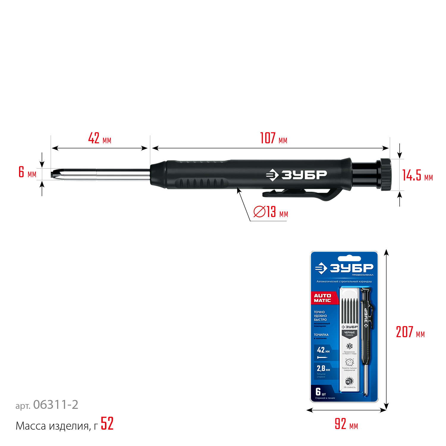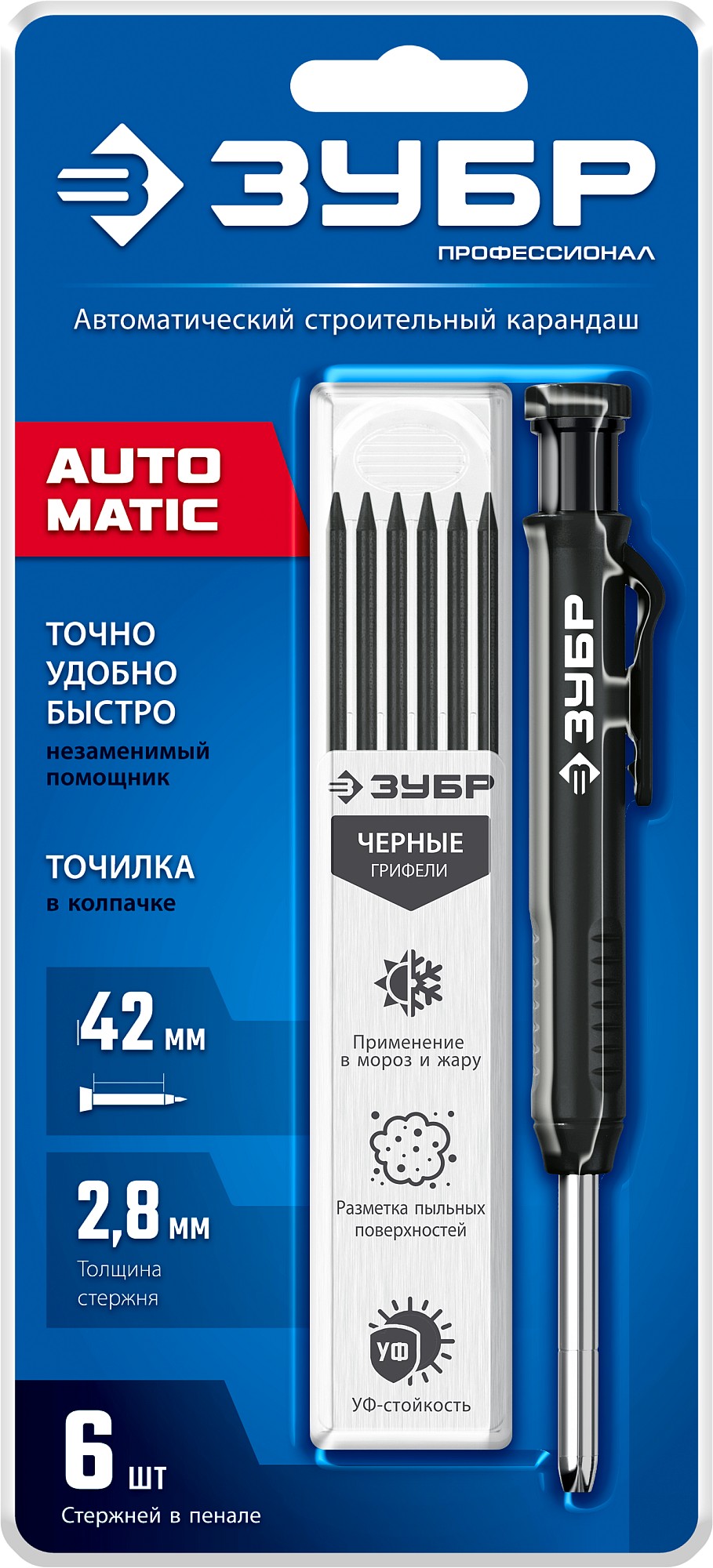 Автоматический строительный карандаш подходит для нанесения разметки на большинство материалов. Не выгорает на солнце, устойчив к температурным перепадам. Безопасен для человека и окружающей среды, т.к. не содержит токсических веществ.
