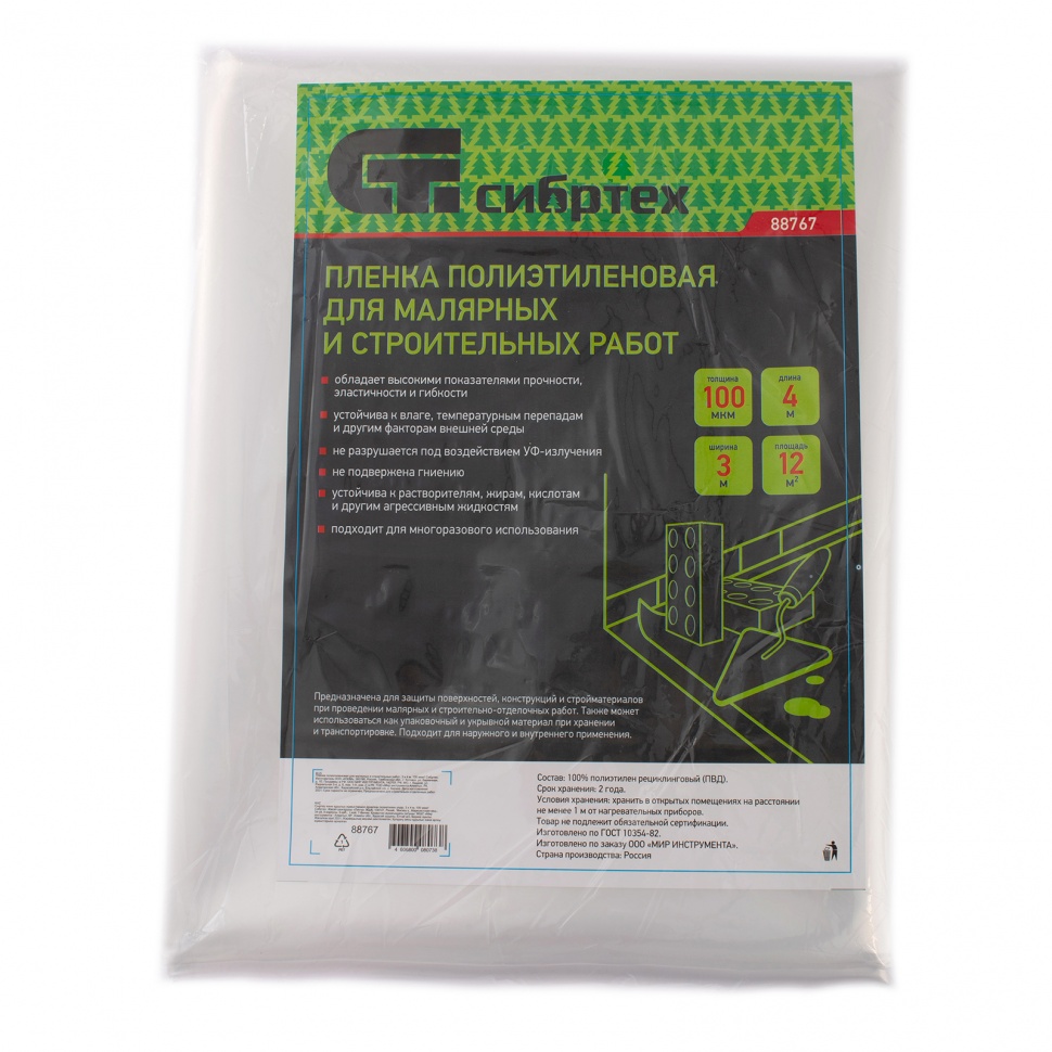 Полиэтиленовая пленка Сибртех 88767 размером 3 х 4 м и плотностью 100 мкм используется для проведения малярных и строительных работ. Применяется для укрывания поверхностей, оконных рам, дверей мебели и других предметов для защиты от строительного мусора и краски. Также будет полезна при транспортировке грузов.ПреимуществаПрочность — пленка из первичного полиэтилена устойчива к разрыву и механическим повреждениям, подходит для многоразового использования.Универсальность — пленка не боится перепадов температур, воздействия влаги, УФ-излучения и химических веществ, поэтому подходит для применения внутри и снаружи помещений.Экологичность — укрывной материал не содержит посторонних примесей, не имеет неприятного запаха.