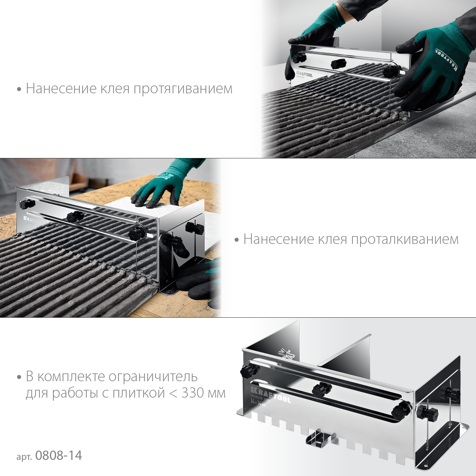 Предназначена для быстрой работы с большим объемом работ по укладке плитки шириной до 600мм. Сделана из стали AISI 430, благодаря которой гребенка обладает повышенными эксплуатационными характеристиками. Имеет величину зуба 14мм. Боковые регуляторы помогут закрепить гребенку на рабочей поверхности и настроить её по высоте под любую плитку. В комплекте имеется дополнительная секция, благодаря которой гребенку можно использовать даже с самыми узкими плитками. Легко моется, не боится влаги.