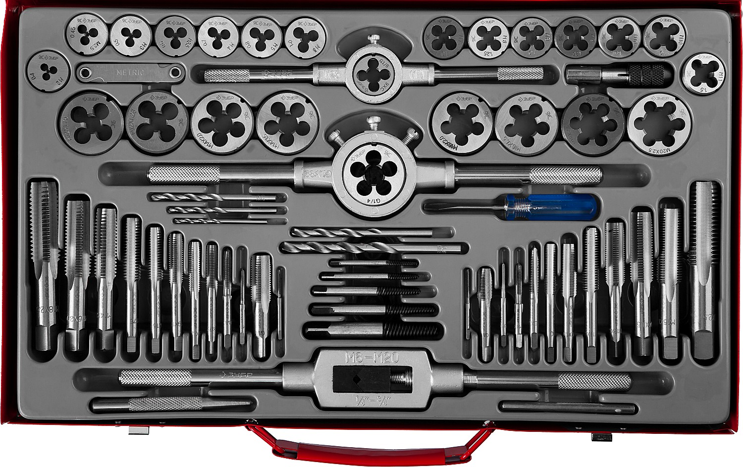 Набор предназначен для резьбонарезных работ в конструкциях и заготовках из сталей и цветных металлов. Метчики ручные однопроходные используются для нарезания внутренней метрической резьбы с нормальным и мелким шагом в глухих и сквозных отверстиях. Метчик трубный предназначен для нарезания внутренней трубной резьбы. Плашки предназначены для нарезания внешней метрической резьбы с нормальным и мелким шагом. Плашка трубная используется для нарезания трубной резьбы Метчикодержатель предназначен для надежного закрепления метчиков Плашкодержатель используется для закрепления плашек при проведении резьбонарезных работ Резьбомер предназначен для подбора необходимого шага метрической резьбы. Кернер используется для предварительного накернивания перед засверливанием. Экстрактор конический с обратной резьбой предназначен для извлечения обломанных болтов и шпилек