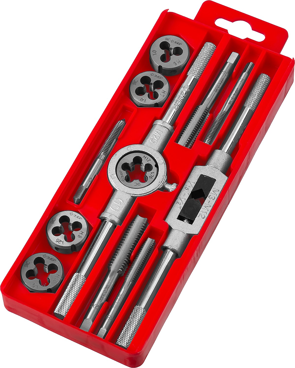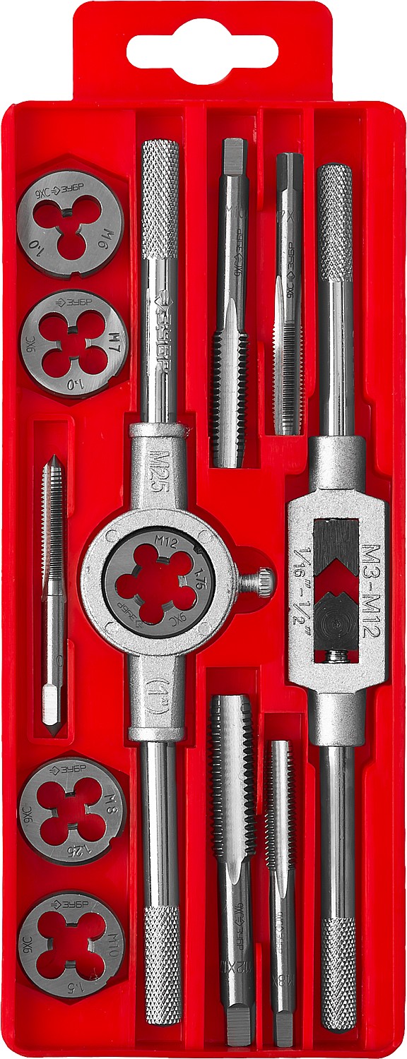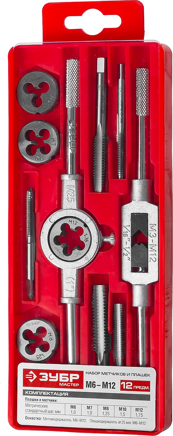Набор предназначен для резьбонарезных работ в конструкциях и заготовках из сталей и цветных металлов. Метчики ручные однопроходные используются для нарезания внутренней метрической резьбы с нормальным шагом в глухих и сквозных отверстиях. Плашки предназначены для нарезания внешней метрической резьбы с нормальным шагом. Метчикодержатель предназначен для надежного закрепления метчиков Плашкодержатель используется для закрепления плашек при проведении резьбонарезных работ