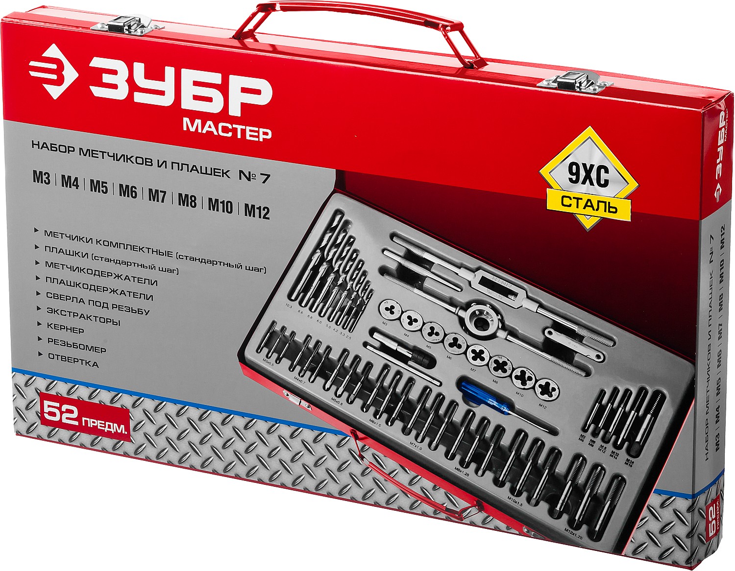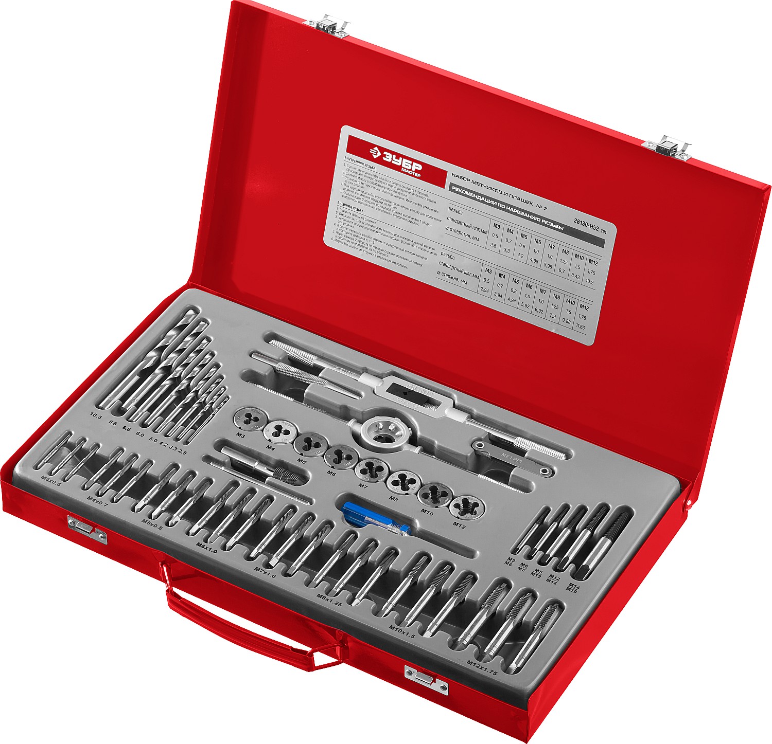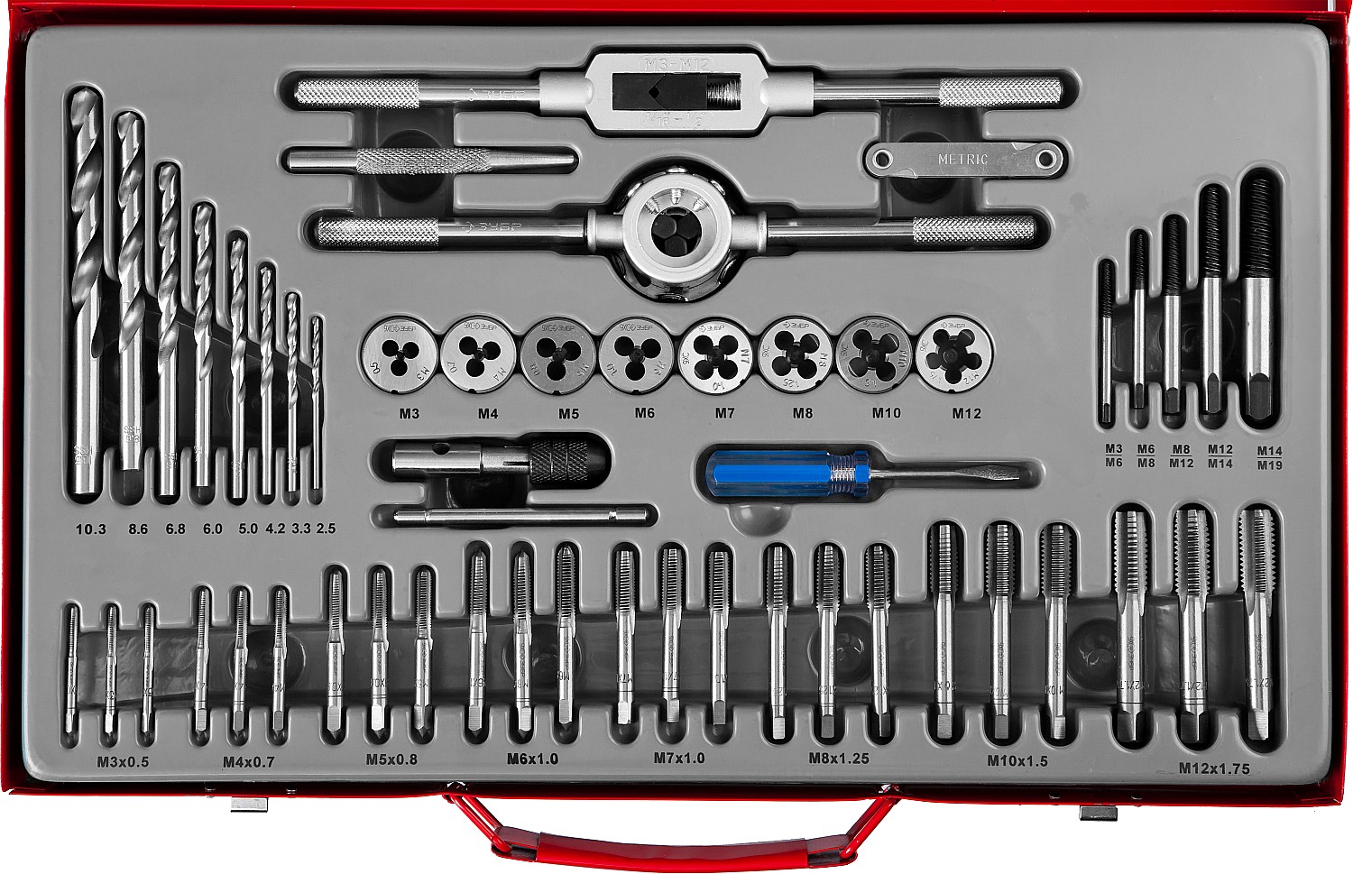 Набор предназначен для резьбонарезных работ в конструкциях и заготовках из сталей и цветных металлов. Метчики ручные однопроходные используются для нарезания внутренней метрической резьбы с нормальным и мелким шагом в глухих и сквозных отверстиях. Метчик трубный предназначен для нарезания внутренней трубной резьбы. Плашки предназначены для нарезания внешней метрической резьбы с нормальным и мелким шагом. Плашка трубная используется для нарезания трубной резьбы Метчикодержатель предназначен для надежного закрепления метчиков Плашкодержатель используется для закрепления плашек при проведении резьбонарезных работ Резьбомер предназначен для подбора необходимого шага метрической резьбы. Кернер используется для предварительного накернивания перед засверливанием. Экстрактор конический с обратной резьбой предназначен для извлечения обломанных болтов и шпилек