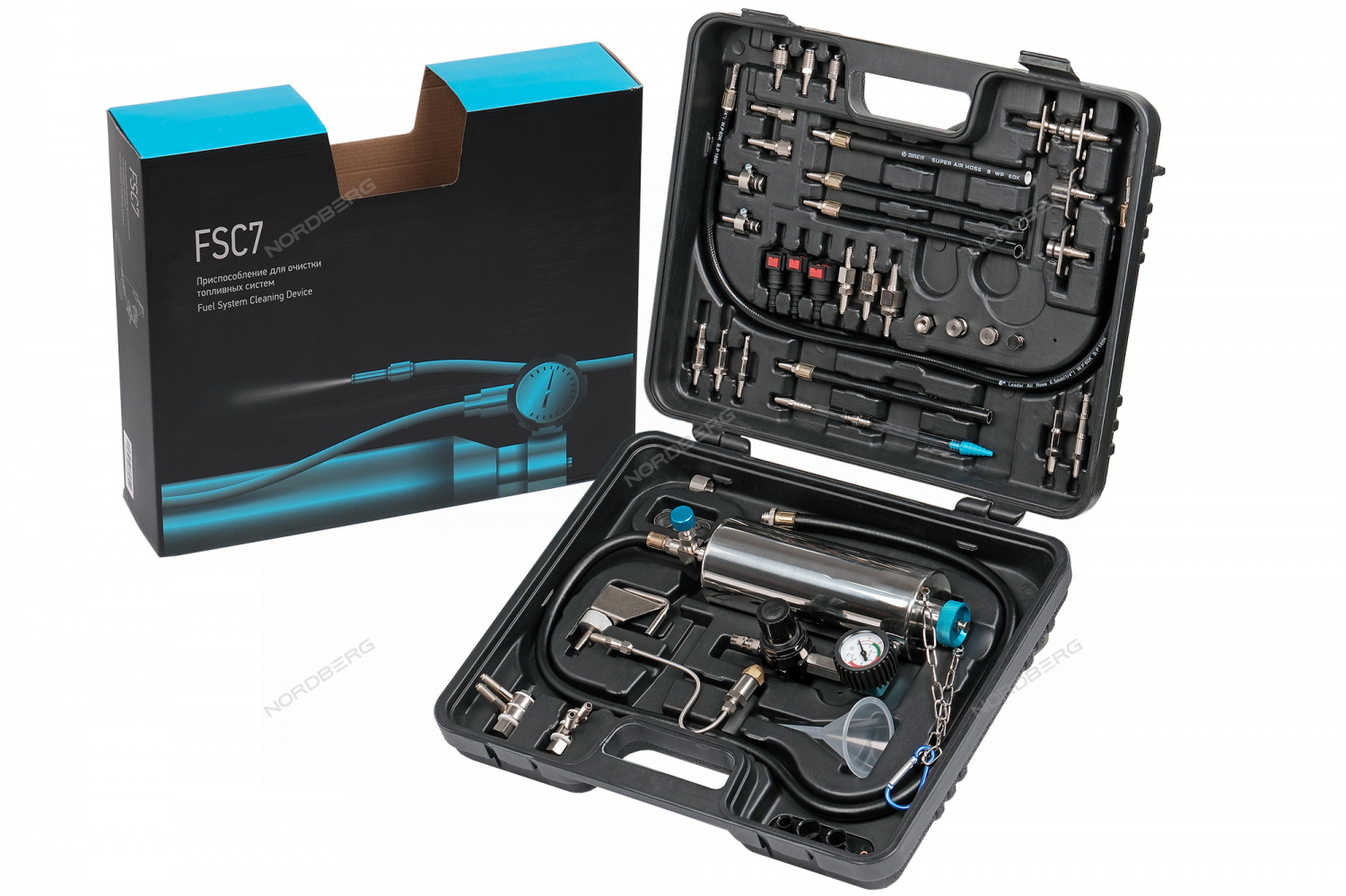 Приспособление для очистки топливных систем в кейсе NORDBERG FSC7 используется для химической очистки топливных систем автомобиля без снятия форсунок, подключаясь к топливной рампе системы впрыска двигателя. Рекомендуется к использованию как в автосервисах, так и для личных нужд автолюбителей.
