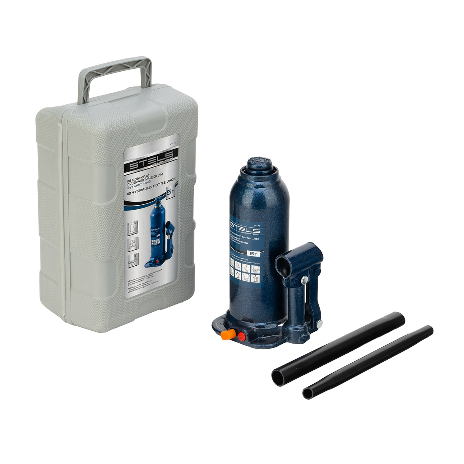 Гидравлический бутылочный домкрат Stels 51175 в пластиковом кейсе предназначен для поднятия грузов весом до 5 т на высоту 207-404 мм. Он не занимает много места и легко помещается в багажник, поэтому его можно брать с собой в дорогу или хранить в гараже. Используется для самостоятельного ремонта авто, также подходит для профессионального применения на станциях технического обслуживания.ПреимуществаЗащита от перегрузки и поломки — встроенный клапан безопасности не допускает подъема груза тяжелее 5000 кг.Надежная и долговечная конструкция — корпус из коррозионностойкой стали приварен к станине.Удобное хранение и транспортировка — домкрат поставляется в пластиковом кейсе.
