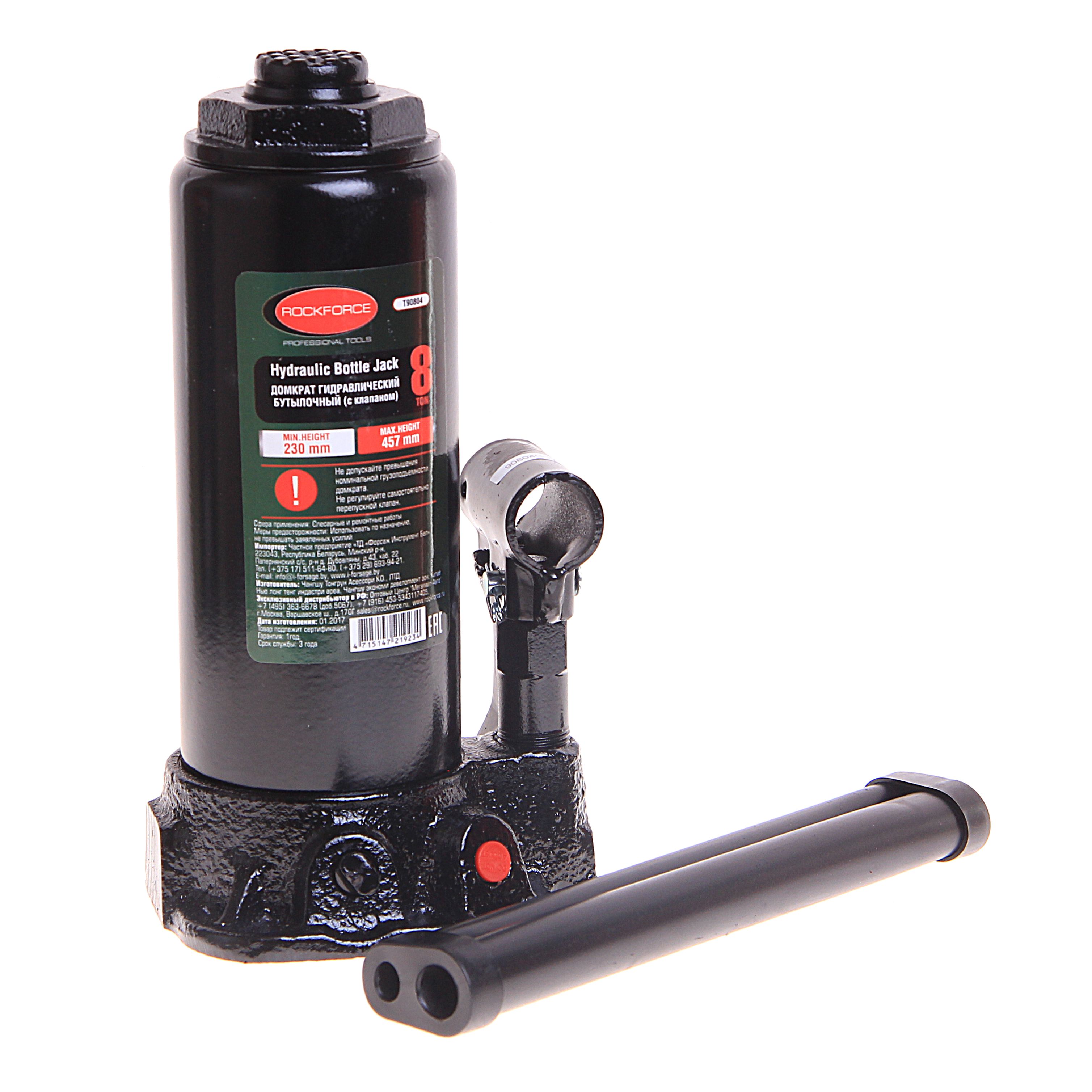 Домкрат гидравлический RockForce бутылочный с клапаном 8т Отлично подойдет для работ в сервисе, или же в собственном гараже. Домкрат изготовлен из прочного материала, устойчив к механическому воздействию, а так же к коррозии и ржавчине. У Домкрата высота подъема 190-360мм. Домкрат проходит контроль качества на заводе изготовителя, и повторный контроль перед поступлением в продажу.