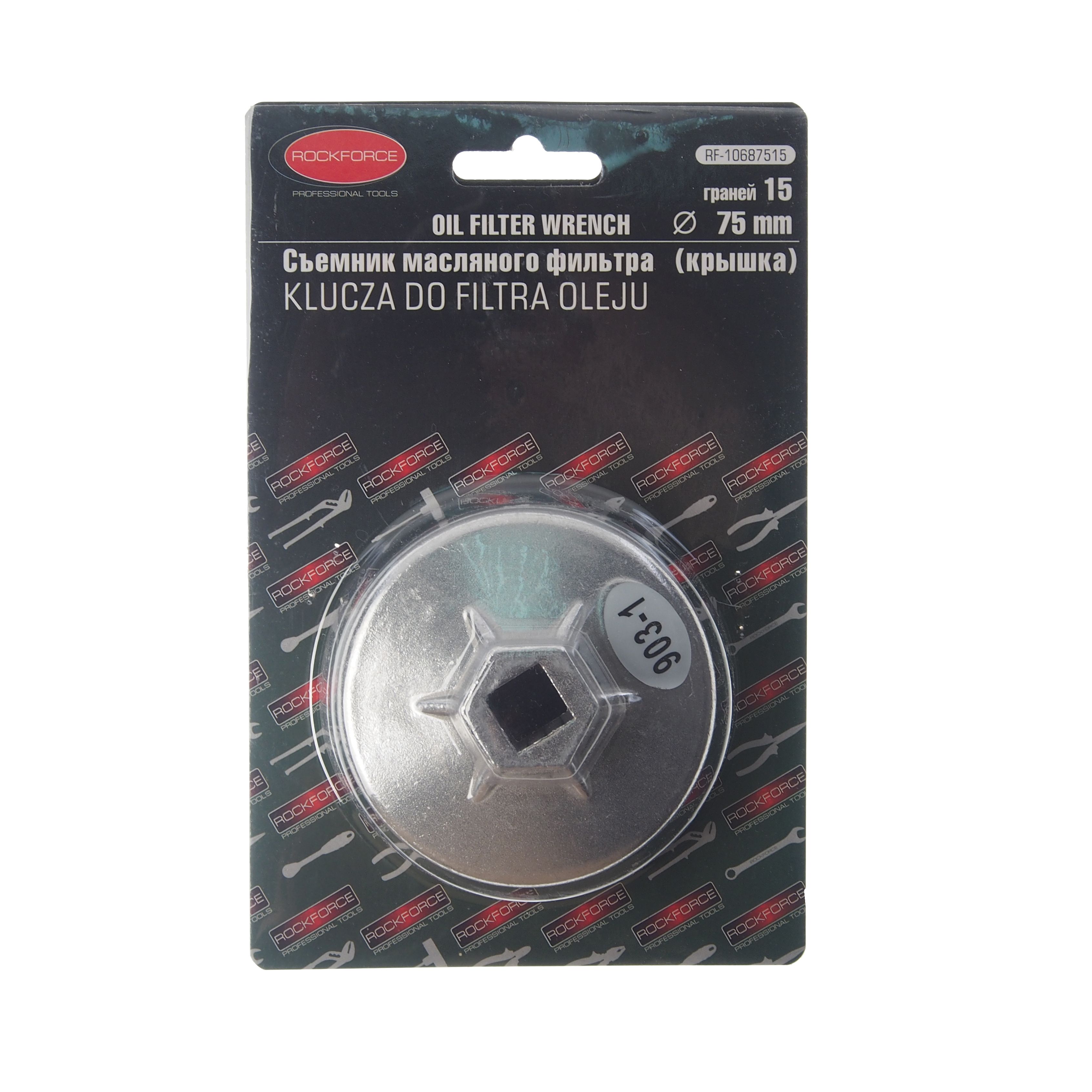 Съемник RockForce масляного фильтра «крышка» 75мм х 15гр, Для разборки отдельных сложных узлов и агрегатов автомобиля зачастую кроме набора ручного инструмента, требуются специальные приспособления. Так, например, для демонтажа подшипников, шестеренок, дисков, шкивов, колес с валов и осей применяются автомобильные съемники различной конфигурации.