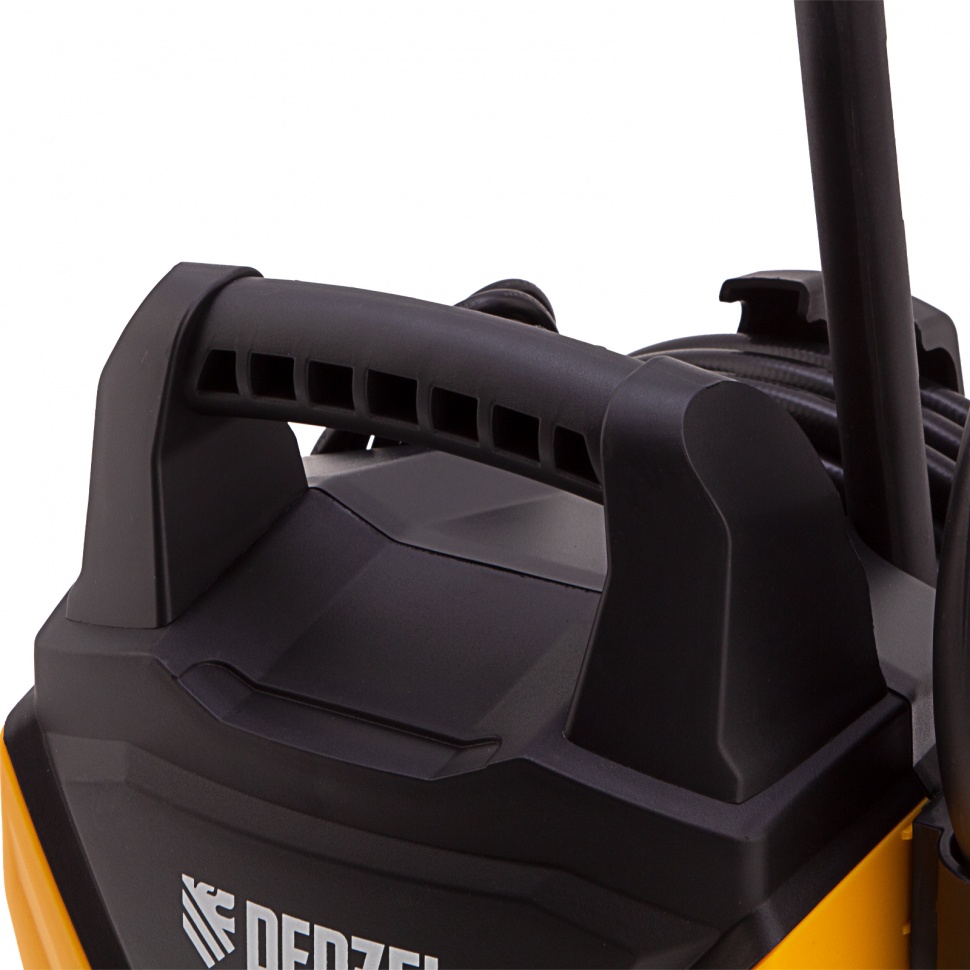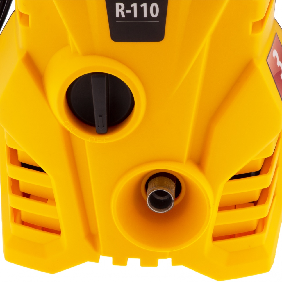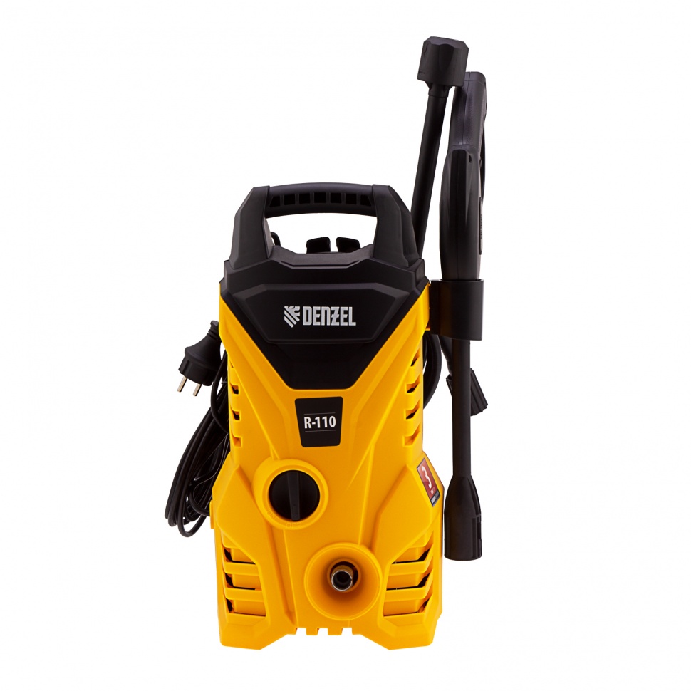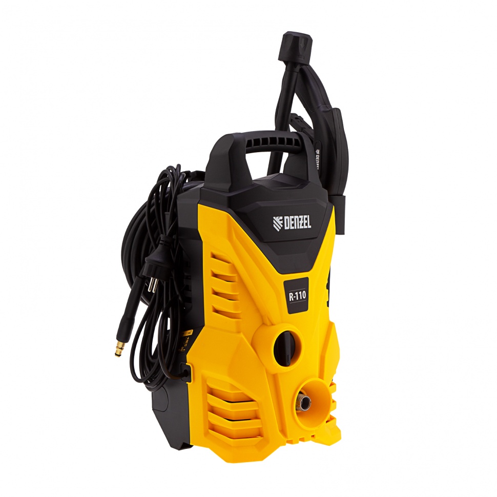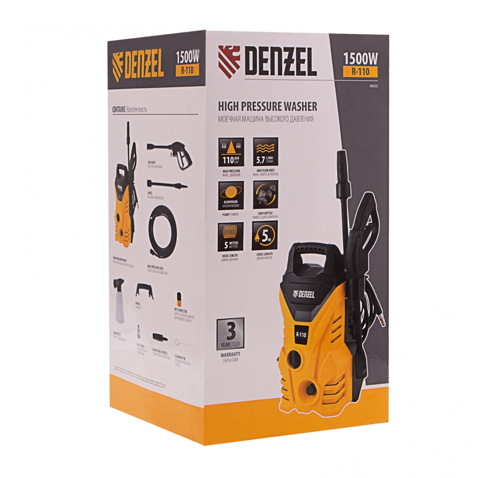 Переносная моечная машина высокого давления Denzel R-110 58232 производительностью 5,7 л/мин, мощностью 1500 Вт, с максимальным давлением 110 бар, используется для мытья автомобилей, садового инвентаря, велосипедов, дорожек и заборов. Мощный мотор и помпа высокой производительности позволяют быстро справляться даже с серьезными загрязнениями. Если нет доступа к водопроводу, мойка может осуществлять забор воды из резервуара в режиме самовсасывания, теряя при этом всего 5% давления.ПреимуществаНадежность и стабильное давление — алюминиевая помпа со стальными плунжерами отличается высокой точностью подгонки деталей.Быстрая подготовка к работе — благодаря быстросъемному коннектору пистолет присоединяется одним движением, а входящий в комплект HPC-коннектор позволяет легко подключить шланг к патрубку мойки.Прочная конструкция — штуцеры из металла устойчивы к повреждению при рывках шланга.Безопасность — опция блокировки рычага пистолета предотвращает случайный пуск подачи воды.Термозащита — в случае перегрева мотор отключается автоматически, что предотвращает его поломку.Полная электробезопасность — токопроводящие элементы имеют двойную изоляцию, мойке присвоен класс защиты II.Чистая вода — специальный фильтр предотвращает засоры и увеличивает срок службы помпы.Эффективная работа — входящий в комплект пеногенератор позволяет использовать моющие средства для очистки поверхностей.Регулируемое сопло — можно настроить интенсивность и форму струи для удобной работы в труднодоступных местах.Мобильность — длина шланга и сетевого кабеля составляет 5 м, что позволяет свободно перемещаться по рабочей зоне.Удобная транспортировка — мойка весит 5,6 кг, а на корпусе предусмотрена ручка.Гарантия 3 года — надежность моечной машины подтверждена производителем.