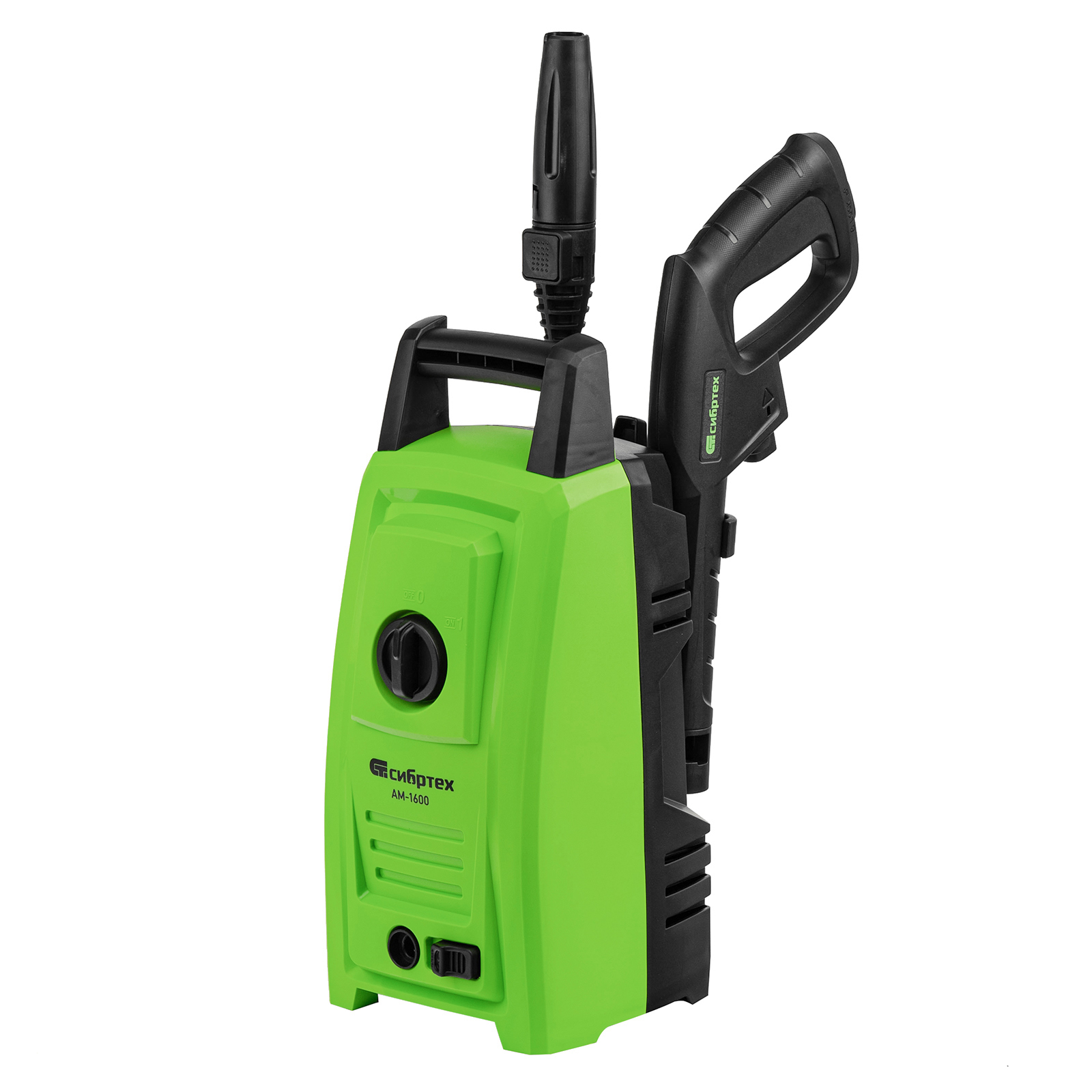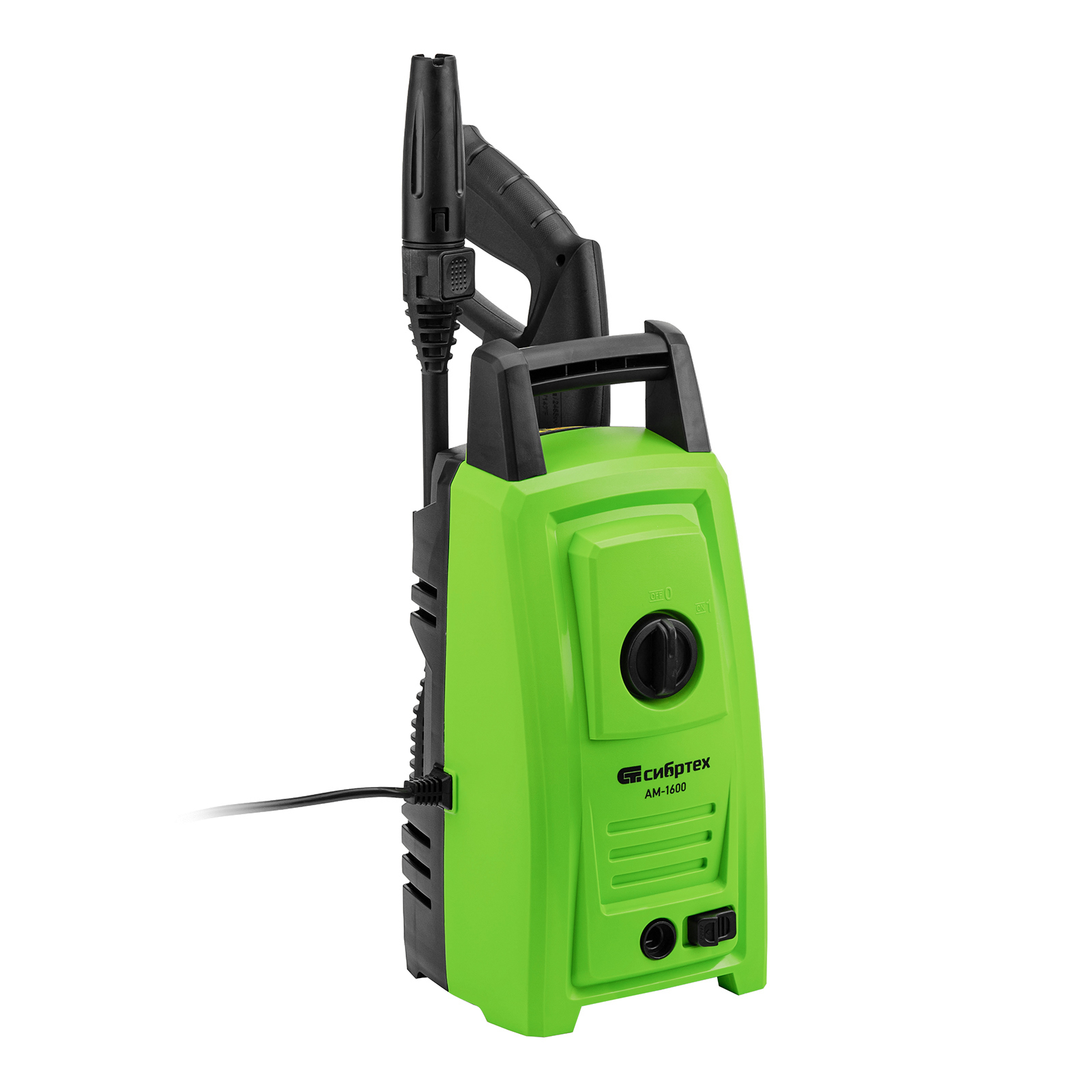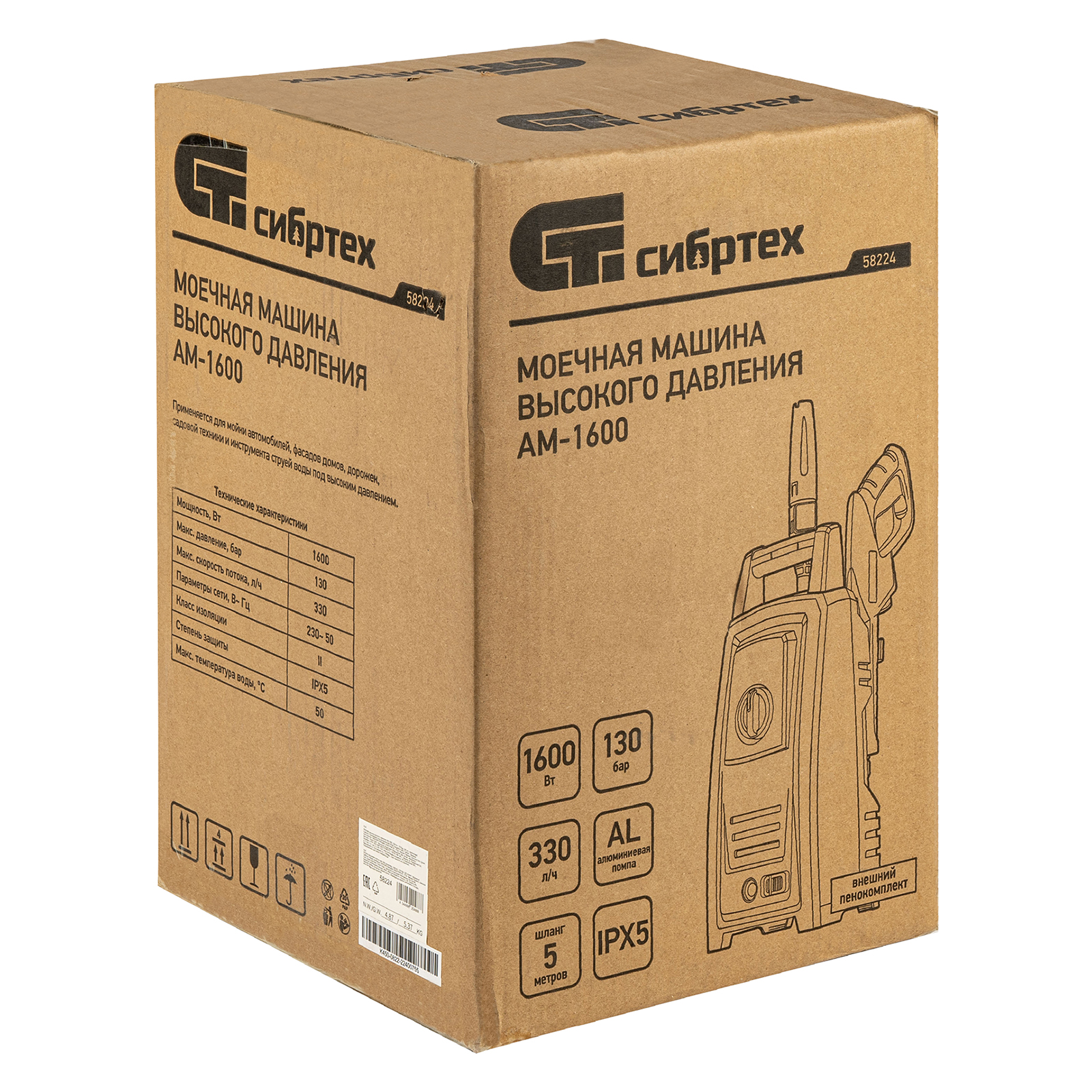 Переносная моечная машина высокого давления Сибртех AM-1600 58224 мощностью 1600 Вт и производительностью 330 л/ч подает струю воды под давлением 130 бар. Позволяет быстро очистить садовые дорожки, забор, стены строений, садовый инвентарь, уличную мебель, кузов автомобиля. Машина подключается к водопроводу, а также способна работать в режиме самовсасывания — в этом случае в качестве источника воды можно использовать любую емкость. Устройство будет полезно владельцам дачных участков.ПреимуществаВысокий ресурс — алюминиевая помпа выдерживает интенсивное использование.Экологичность — во время работы машины отсутствуют вредные выхлопы и неприятный запах.Термозащита — в случае перегрева двигатель отключается для предотвращения поломки.Электробезопасность — токопроводящие элементы имеют двойную изоляцию.Удобная регулировка струи — вращая корпус сопла, можно установить оптимальный вид распыления.Эффективное очищение — в комплект поставки входит внешний пеногенератор, позволяющий использовать моющие средства.Удобная работа в труднодоступных местах — на пистолет можно установить насадку-удлинитель.Безопасность — блокировка рычага пистолета предотвращает случайный запуск.Защита от засоров — входной штуцер имеет встроенный фильтр, задерживающий посторонние частицы.Легкая подготовка к работе — быстросъемный адаптер позволяет подключить входной шланг одним движением.Свободное передвижение по рабочей зоне — длина сетевого кабеля и шланга составляет 5 м, что позволяет реже перемещать мойку во время работы.Простое обслуживание — в комплект поставки входит игла для прочистки сопла.Продуманное хранение и транспортировка — на корпусе имеется удобная ручка, для кабеля и шланга предусмотрены специальные кронштейны.