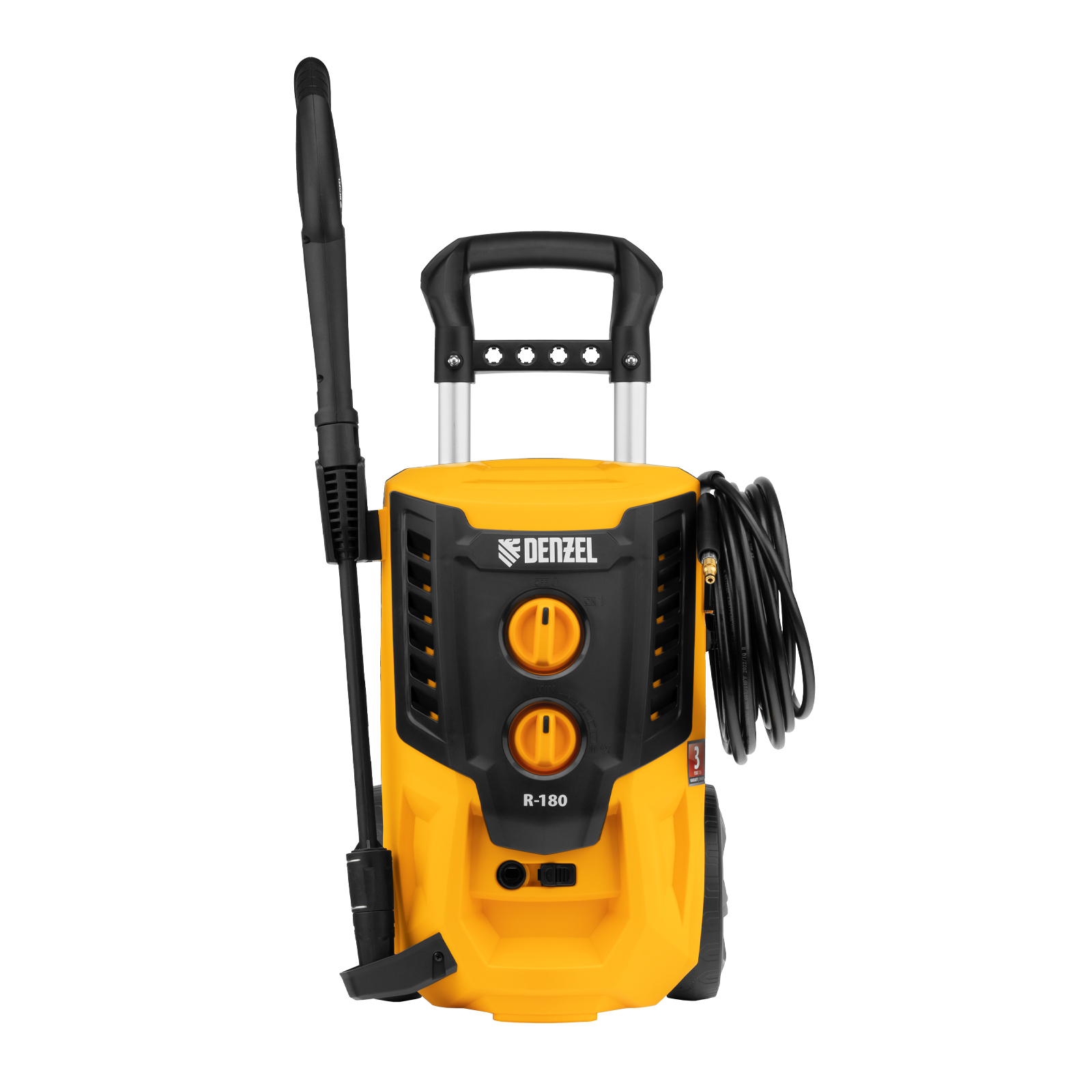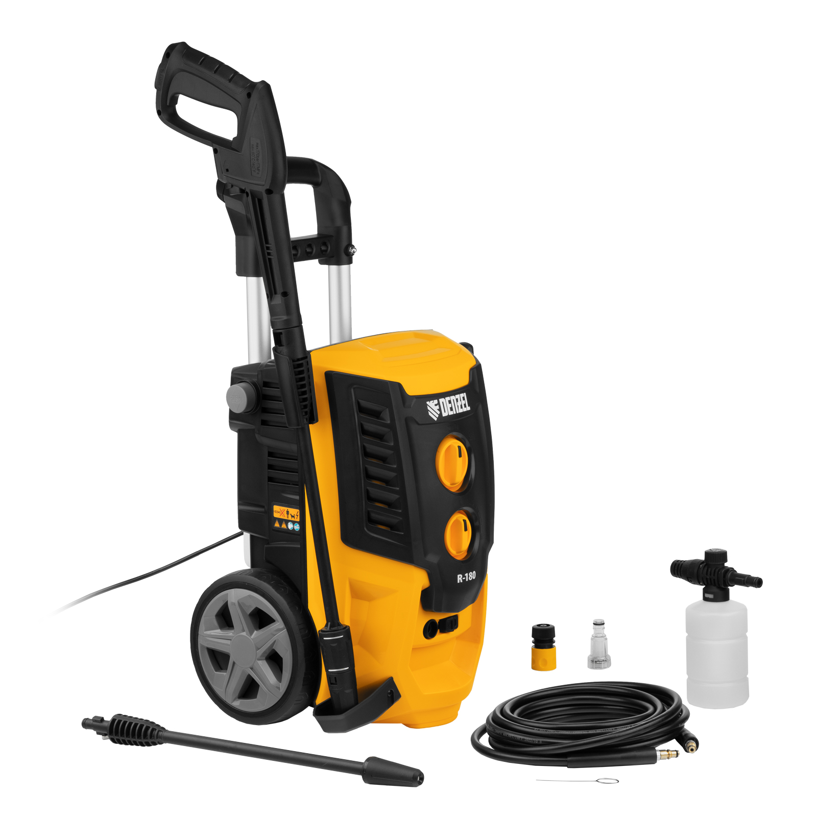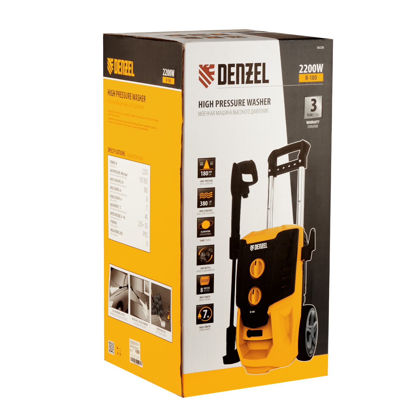 Колесная моечная машина высокого давления Denzel R-180 58238 мощностью 2200 Вт и производительностью 380 л/ч подает струю воды под давлением 180 бар и служит для очищения поверхностей. Позволяет быстро привести в порядок садовые дорожки, удалить пыль и грязь с фасада здания, автомобиля, велосипеда или мотоцикла, отмыть садовый инвентарь. Моечная машина подключается к водопроводу, а при его отсутствии может забирать воду из любого резервуара, работая в режиме самовсасывания. Устройство пригодится для поддержания порядка на загородном участке.ПреимуществаНадежность — двигатель с медной обмоткой выдерживает интенсивную эксплуатацию при высоких нагрузках.Стабильная работа — алюминиевая помпа обеспечивает постоянное давление даже при длительном использовании.Экологичность — мойка работает без вредных выхлопов, появление неприятных запахов исключено.Термозащита — в случае перегрева двигатель автоматически отключается для предотвращения поломки.Защита от случайного включения — конструкцией предусмотрена блокировка рычага пистолета.Безопасность пользователя — токопроводящие элементы надежно изолированы, машине присвоен класс защиты II.Чистая вода — встроенный фильтр задерживает посторонние примеси, продлевая срок службы мойки.Использование моющего средства — машина имеет встроенный бачок, также можно подключить внешний пеногенератор, входящий в комплект поставки.Регулировка количества пены встроенного пенокомплекта — можно подобрать оптимальный режим в зависимости от степени загрязнения поверхности.Максимальная эффективность — моечная машина комплектуется грязевой фрезой, позволяющей быстро справиться даже с застарелыми загрязнениями.Легкая подготовка к работе — благодаря быстросъемному адаптеру входной шланг подключается одним движением.Увеличенная рабочая зона — шланг длиной 8 м и 7-метровый кабель позволяют свободно перемещаться по участку.Простой уход — игла для прочистки сопла входит в комплект поставки.Комфортная транспортировка — машина оснащена колесами и ручкой для удобного перемещения.Удобное хранение — конструкцией предусмотрены держатель пистолета и кронштейн для сетевого кабеля.Гарантия 3 года — высокое качество моечной машины подтверждено производителем.