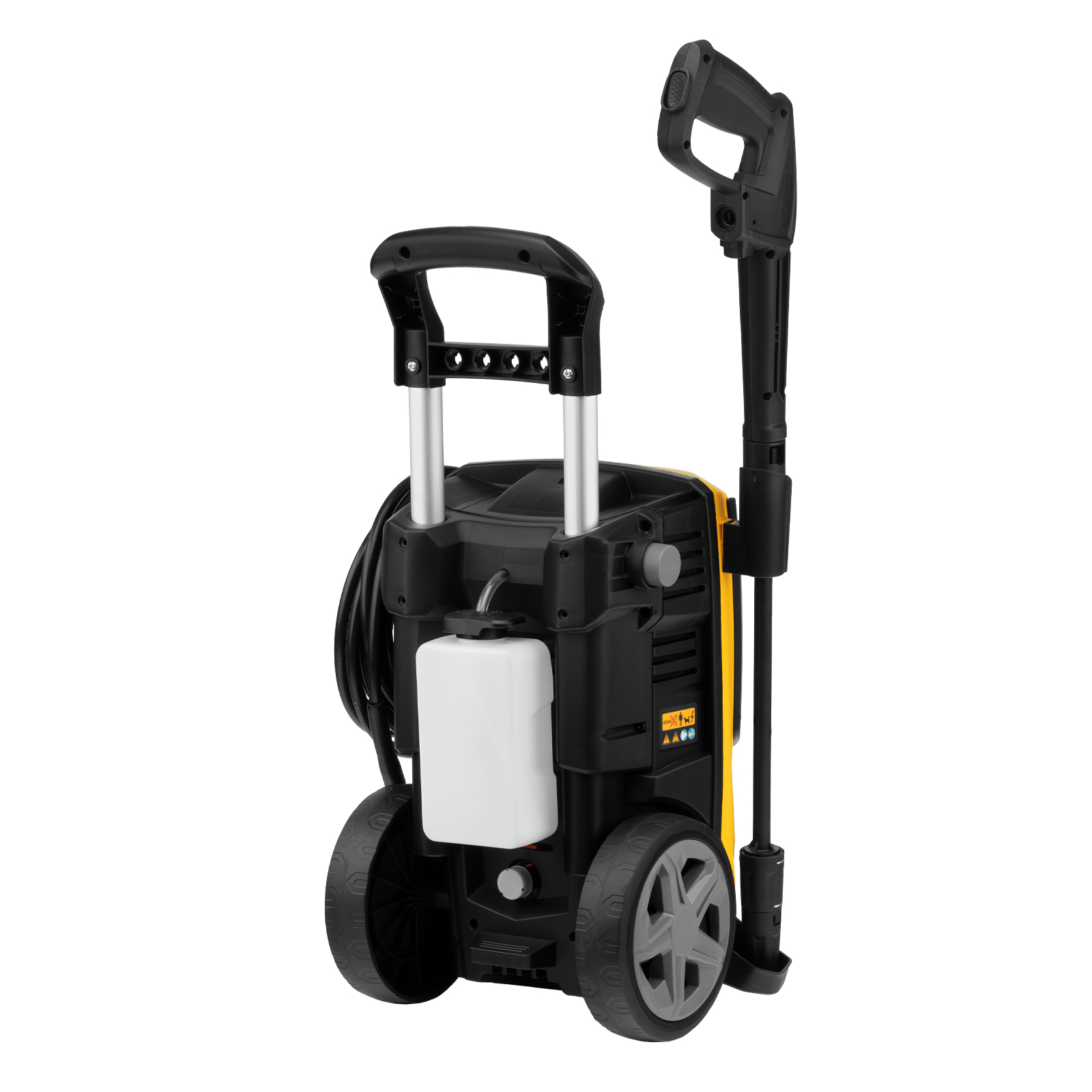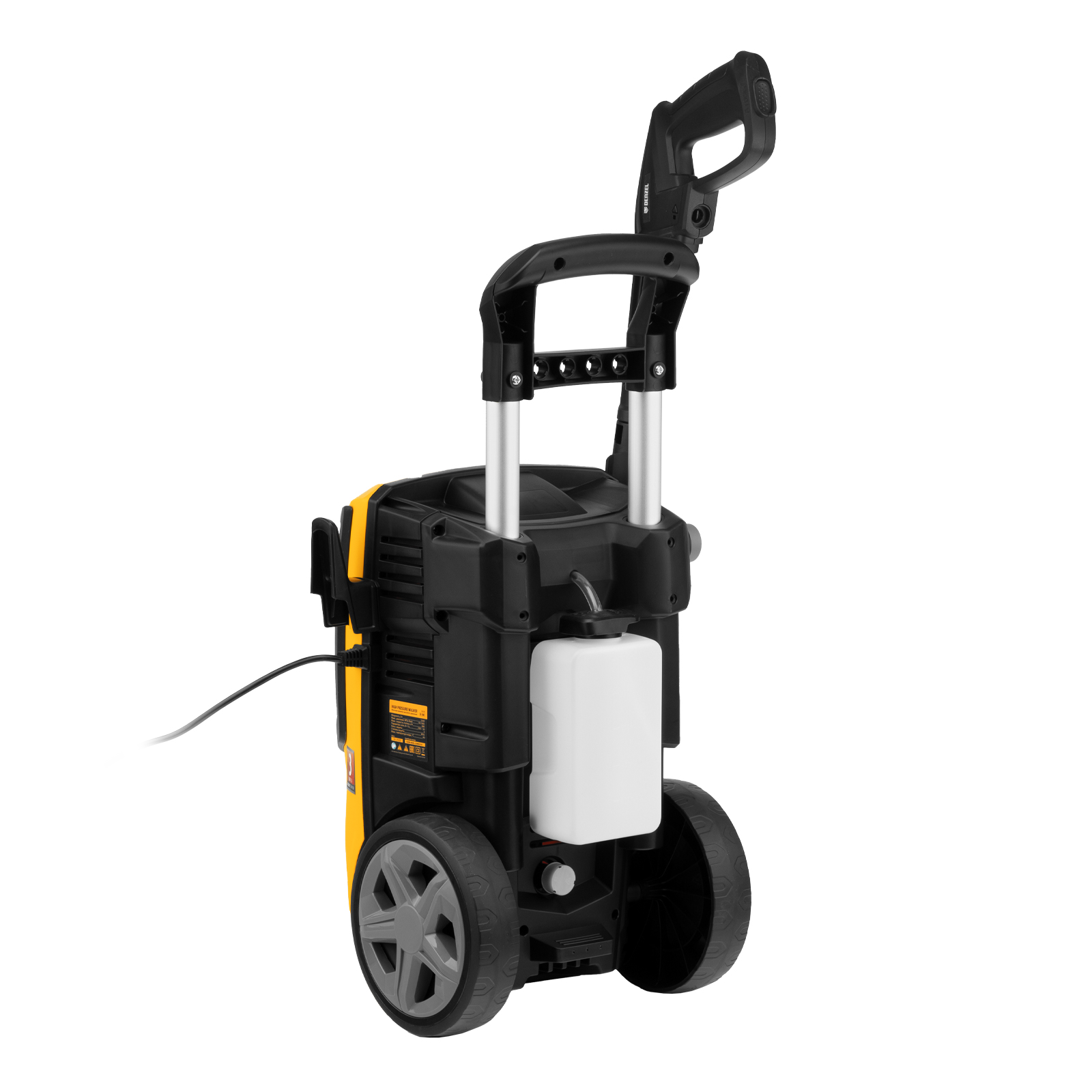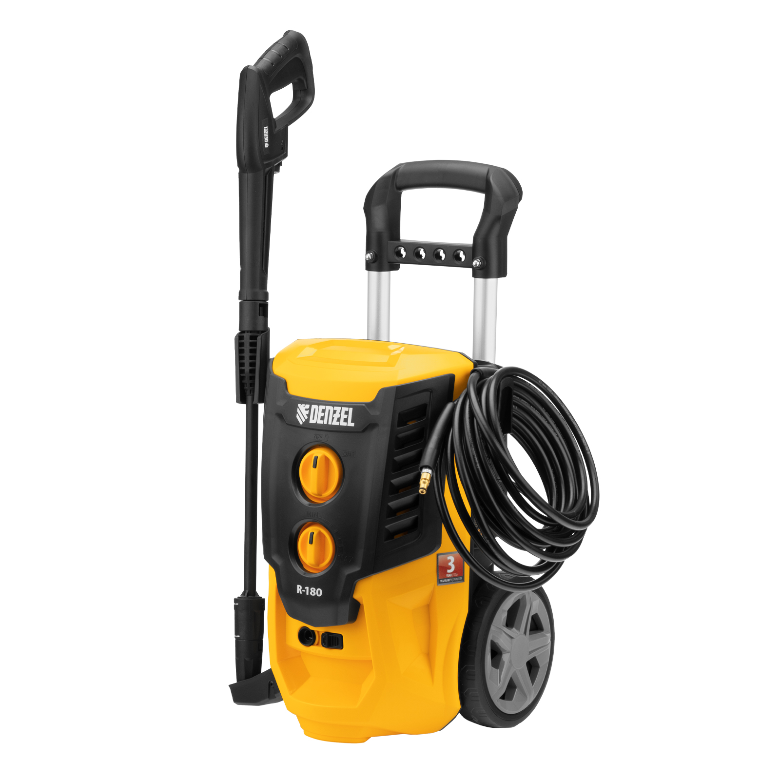 Колесная моечная машина высокого давления Denzel R-180 58238 мощностью 2200 Вт и производительностью 380 л/ч подает струю воды под давлением 180 бар и служит для очищения поверхностей. Позволяет быстро привести в порядок садовые дорожки, удалить пыль и грязь с фасада здания, автомобиля, велосипеда или мотоцикла, отмыть садовый инвентарь. Моечная машина подключается к водопроводу, а при его отсутствии может забирать воду из любого резервуара, работая в режиме самовсасывания. Устройство пригодится для поддержания порядка на загородном участке.ПреимуществаНадежность — двигатель с медной обмоткой выдерживает интенсивную эксплуатацию при высоких нагрузках.Стабильная работа — алюминиевая помпа обеспечивает постоянное давление даже при длительном использовании.Экологичность — мойка работает без вредных выхлопов, появление неприятных запахов исключено.Термозащита — в случае перегрева двигатель автоматически отключается для предотвращения поломки.Защита от случайного включения — конструкцией предусмотрена блокировка рычага пистолета.Безопасность пользователя — токопроводящие элементы надежно изолированы, машине присвоен класс защиты II.Чистая вода — встроенный фильтр задерживает посторонние примеси, продлевая срок службы мойки.Использование моющего средства — машина имеет встроенный бачок, также можно подключить внешний пеногенератор, входящий в комплект поставки.Регулировка количества пены встроенного пенокомплекта — можно подобрать оптимальный режим в зависимости от степени загрязнения поверхности.Максимальная эффективность — моечная машина комплектуется грязевой фрезой, позволяющей быстро справиться даже с застарелыми загрязнениями.Легкая подготовка к работе — благодаря быстросъемному адаптеру входной шланг подключается одним движением.Увеличенная рабочая зона — шланг длиной 8 м и 7-метровый кабель позволяют свободно перемещаться по участку.Простой уход — игла для прочистки сопла входит в комплект поставки.Комфортная транспортировка — машина оснащена колесами и ручкой для удобного перемещения.Удобное хранение — конструкцией предусмотрены держатель пистолета и кронштейн для сетевого кабеля.Гарантия 3 года — высокое качество моечной машины подтверждено производителем.