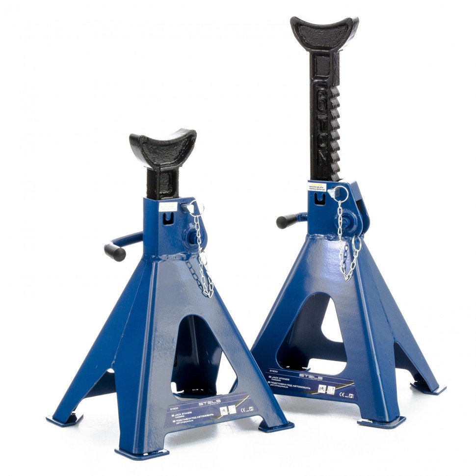 Регулируемые подставки под автомобиль Stels 51633 грузоподъемностью 6 т, с высотой подъема 415-605 мм, 2 шт. в комплекте, используются в качестве дополнительной поддержки во время ремонта автотранспорта. Подставки удерживают автомобиль на необходимой высоте при помощи регулируемых штоков с зубчатым механизмом фиксации. Каждая стойка снабжена страховочным штифтом, что исключает риск случайного опускания штока. Подставки будут полезны для профессионального и самостоятельного авторемонта.ПреимуществаНадежность — сварной корпус каждой подставки изготовлен из стали, шток — из чугуна.Безопасное использование — специальные площадки на опорах обеспечивают устойчивость подставок и целостность поверхности, на которую они установлены.Продуманная конструкция — страховочные штифты подвешены на цепочки, поэтому они не потеряются.Вес 10 кг — комплект подставок можно брать в поездки.