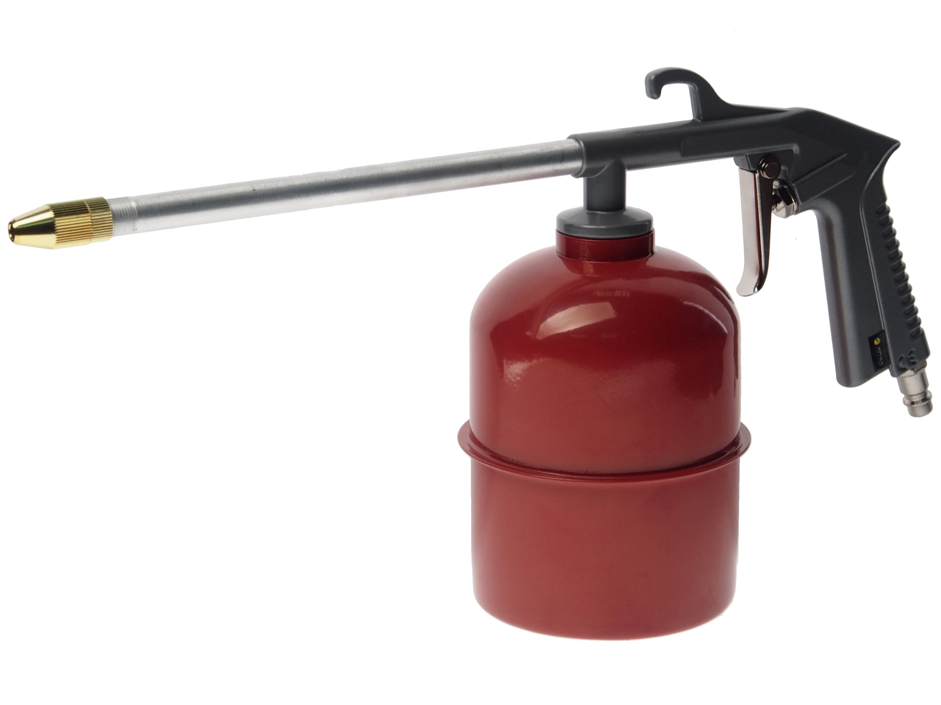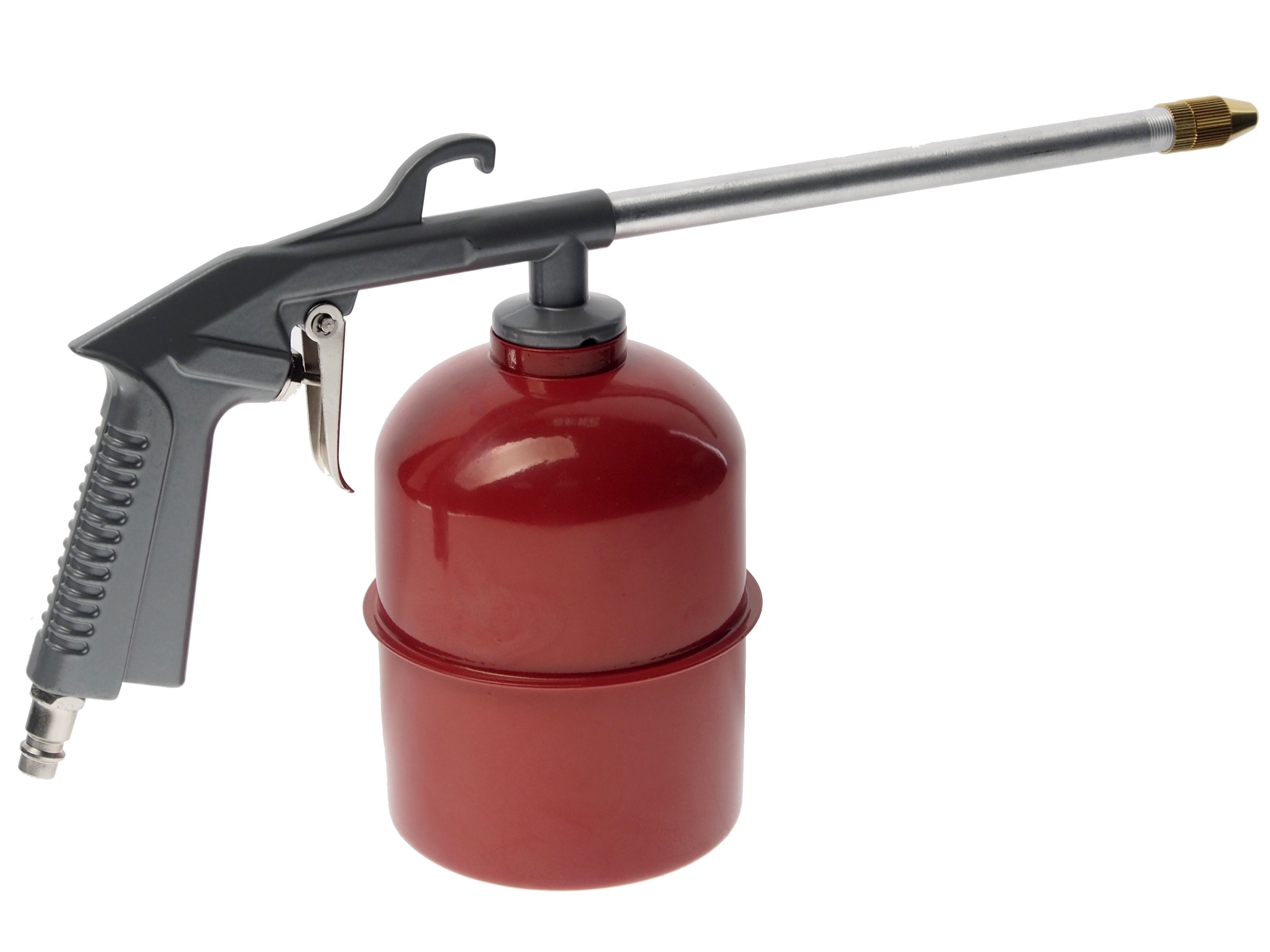Пневматический пистолет для мойки двигателя оснащён нижним алюминиевым бачком объёмом 900 мл.