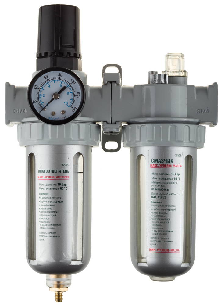 Профессиональный инструмент для работ в автосервисах, шиномонтажах и СТО. Применяется для осушения воздуха и смазки пневмоинструмента, а также контроля за давлением в пневмосистемах