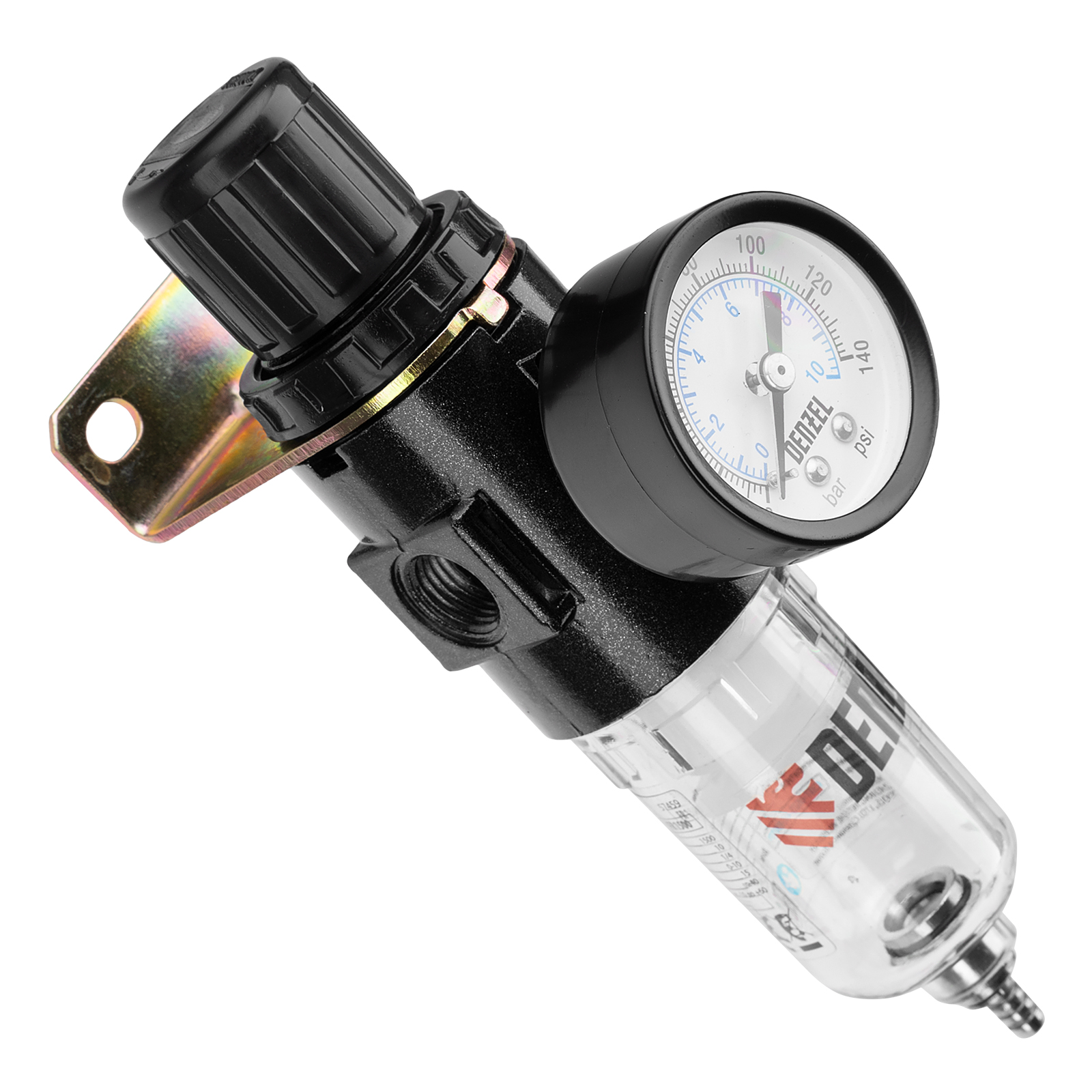 Фильтр-регулятор Denzel FR1500 57459 с присоединительным размером 1/4" и рабочим давлением 10 бар имеет пропускную способность 1500 л/мин и предназначен для подготовки сжатого воздуха, поступающего от компрессора: осушения и очищения от пыли и других твердых частиц размером от 40 мкм. Также позволяет устанавливать и поддерживать давление, необходимое для эффективной работы пневмоинструмента. Может эксплуатироваться при температуре от -10 °C до +60 °C. Фильтр-регулятор предназначен для бытового применения, также будет полезен в мастерской и гараже.Преимущества Точный контроль давления — в комплект поставки входит механический манометр. Высокий ресурс — фильтрующий блок из полиэстера устойчив к износу и способен задерживать значительное количество загрязняющих частиц. Удобное отслеживание степени загрязнения — блок осушения и фильтрации имеет прозрачные стенки. Простое удаление конденсата — в нижней части корпуса имеется дренажный клапан. Компактность и малый вес 207 г — блок подготовки воздуха удобен для хранения и монтажа. Гарантия 3 года — высокое качество инструмента подтверждено производителем.