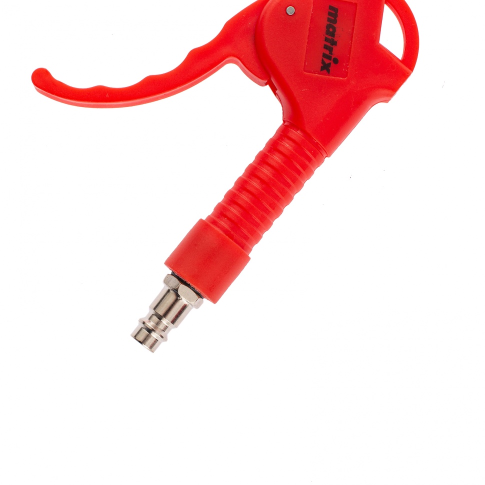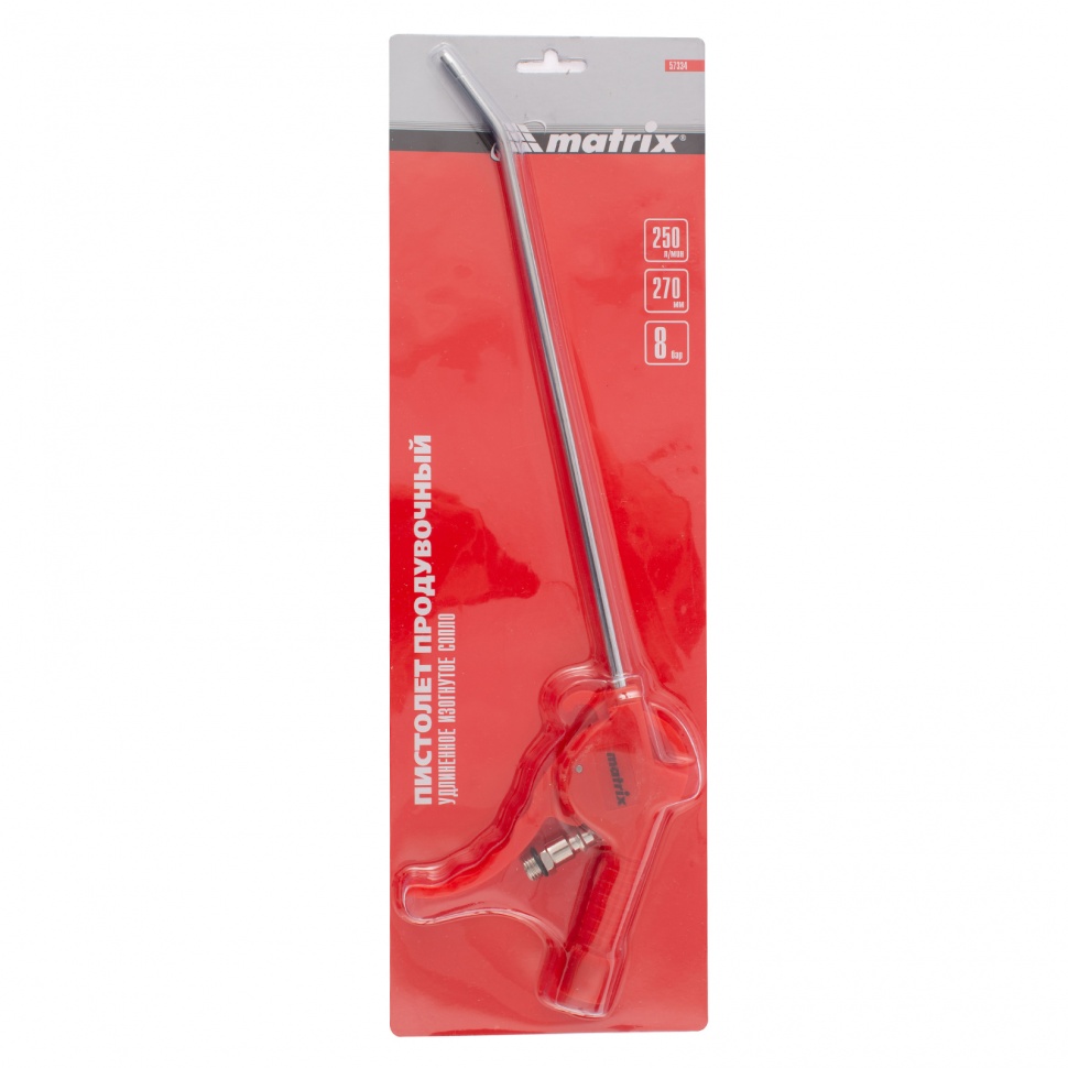 Пистолет продувочный Matrix 57334 с удлиненным изогнутым соплом длиной 270 мм подходит для применения в быту, в автосервисах, в небольших мастерских и на строительных объектах. С помощью потока сжатого до 8 бар воздуха эффективно очищает отверстия, шланги, пазы деталей и поверхности с производительностью до 270 л/час. Продувочный пистолет отличается высоким уровнем пожарной безопасности, поэтому может использоваться во влажных помещениях.ПреимуществаНадежность и малый вес инструмента 190 г — корпус из прочного пластика не утяжеляет инструмент.Высокая эффективность — изогнутое сопло облегчает работу в труднодоступных местах, позволяя прочистить очень узкие отверстия.Комфортная работа — удобная рукоятка имеет рельефное покрытие, а спусковой крючок повторяет форму пальцев.
