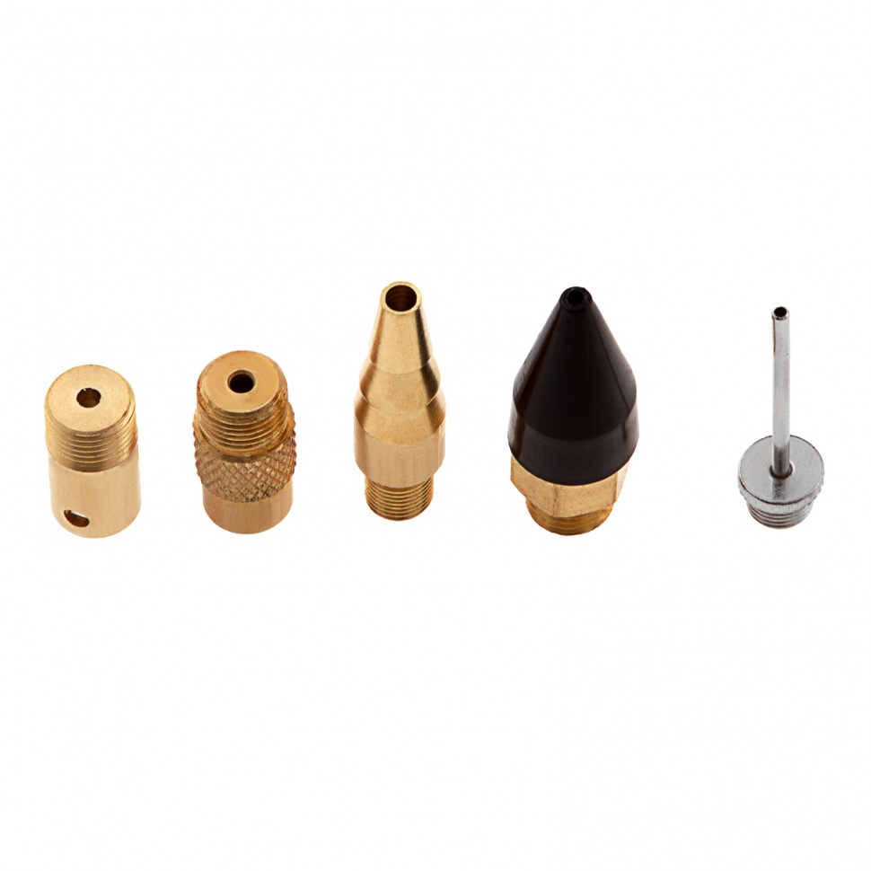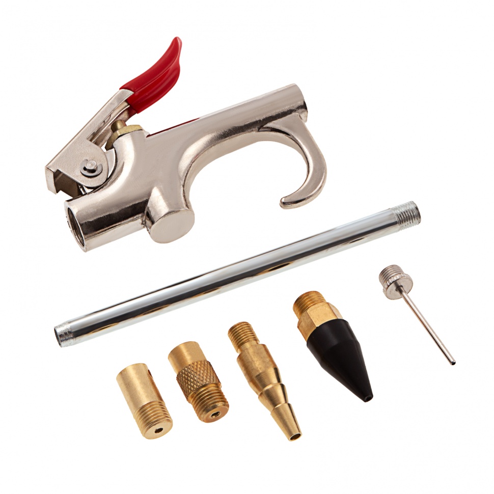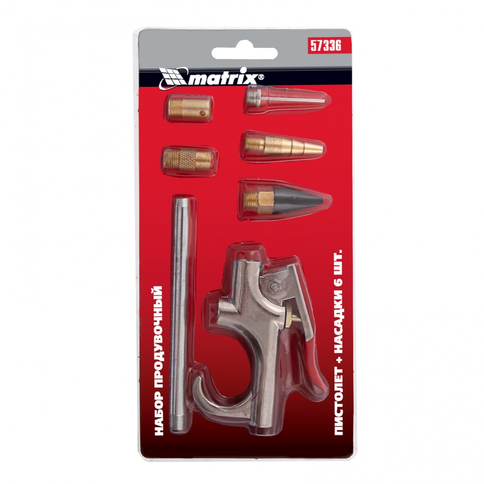 Продувочный пистолет Matrix 57336 с комплектом из 6 сопел и переходников предназначен для продувки сжатым воздухом отверстий, пазов, шлангов и поверхностей. Он пригодится в быту, на стройках, в автосервисах и частных мастерских. Пистолет работает под давлением до 6 бар и производительностью до 400 л/мин.Продувочный пистолет отличается высокой пожарной безопасностью, поэтому его можно использовать даже во влажных помещениях.Преимущества:Стандартный переходник обеспечивает работу на максимальном давлении 6 бар.Переходник с боковым отверстием позволяет уменьшить выходной поток для осторожной продувки хрупких деталей.Длинное сопло с большим отверстием формирует широкую воздушную струю и помогает продуть различные поверхности, в том числе с большой площадью.Тонкое сопло с двумя отверстиями по центру и сбоку поможет продуть узкие проходы, пазы, тонкие детали, не повредив их.Конусообразная насадка легко присоединяется к пистолету напрямую без адаптера, а резиновое сопло обеспечивает герметичное соединение с отверстием или шлангом и его максимальное очищение.Насадка с наружной резьбой «елочка» позволяет плотно закрепить шланг различного диаметра и не только продуть, но и подкачать шину, мяч и другие изделия из резины.Металлический корпус предохраняет пистолет от разрушений и продлевает его срок службы.Клапан, отвечающий за включение и отключение подачи воздуха, имеет высокий ресурс и будет работать корректно долгое время.Компактные размеры 22 х 11 х 1,8 см см и вес всего 150 грамм обеспечивают удобную эксплуатацию и не приводят к перенапряжению руки мастера.
