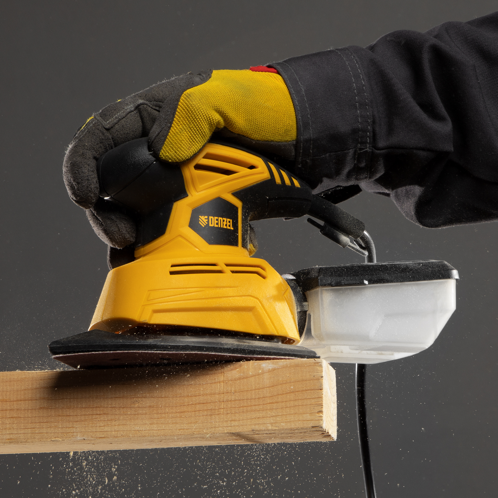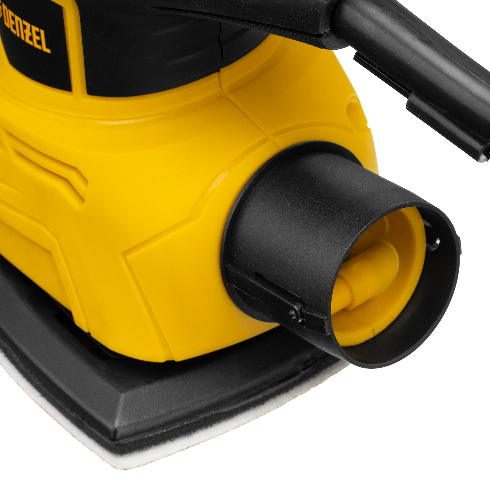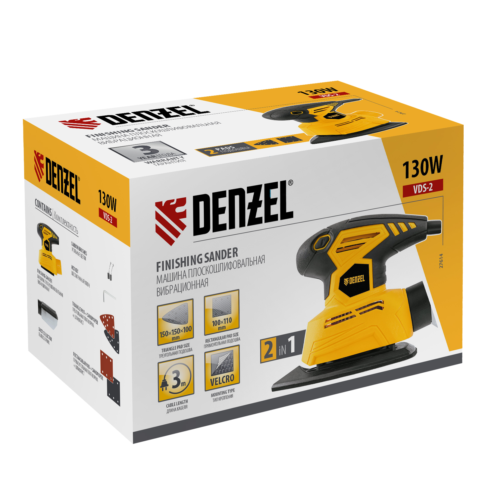 Плоскошлифовальная вибрационная машина 2 в 1 Denzel VDS-2 27614 мощностью 130 Вт и частотой вибраций 14000 об/мин используется для сухого шлифования плоских поверхностей и деталей из древесины, пластмассы, металла. Имеет возможность установки прямоугольной или треугольной подошвы для работы в труднодоступных местах и углах, что позволяет эффективно решать поставленные задачи.ПреимуществаВысокая производительность — величина хода платформы составляет 2,5 мм, размер рабочей поверхности — 100 х 110 мм и 151 х 150 х 100 мм, поэтому машина успешно справляется с обработкой большой площади.Легкая подготовка к работе — система VELCRO позволяет быстро крепить абразивный материал.Эффективная работа и чистота на рабочем месте — машина оборудована системой пылеудаления.Работа в непрерывном режиме — конструкцией предусмотрен фиксатор кнопки пуска.Безопасность пользователя — токопроводящие элементы имеют усиленную двойную изоляцию.Простое обслуживание — пластиковый пылесборник легко снимать и чистить.Длина сетевого кабеля 3 м — можно свободно перемещаться по рабочей зоне.Готовность к работе — в комплект входит 2 набора шлифовальной бумаги для прямоугольной и треугольной подошв, а также запасные угольные щётки.Комфортная работа — машина весит всего 1,2 кг, обрезиненная рукоятка поглощает вибрации и не выскальзывает из рук.Гарантия 3 года — надежность инструмента подтверждена производителем.