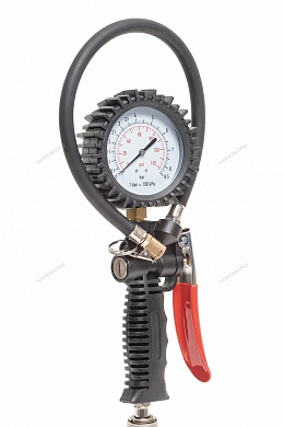 Пистолет для накачки шин подключается к источнику сжатого воздуха через резиновый шланг. Работает в режиме накачивания и сброса лишнего давления.