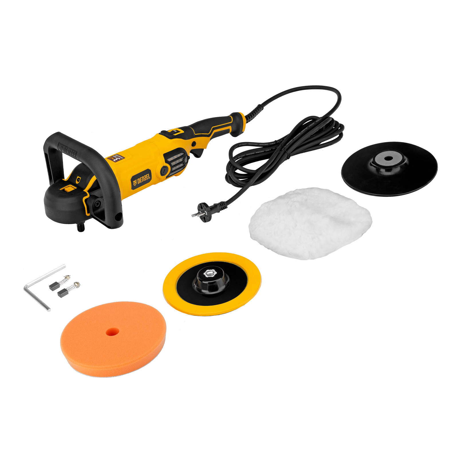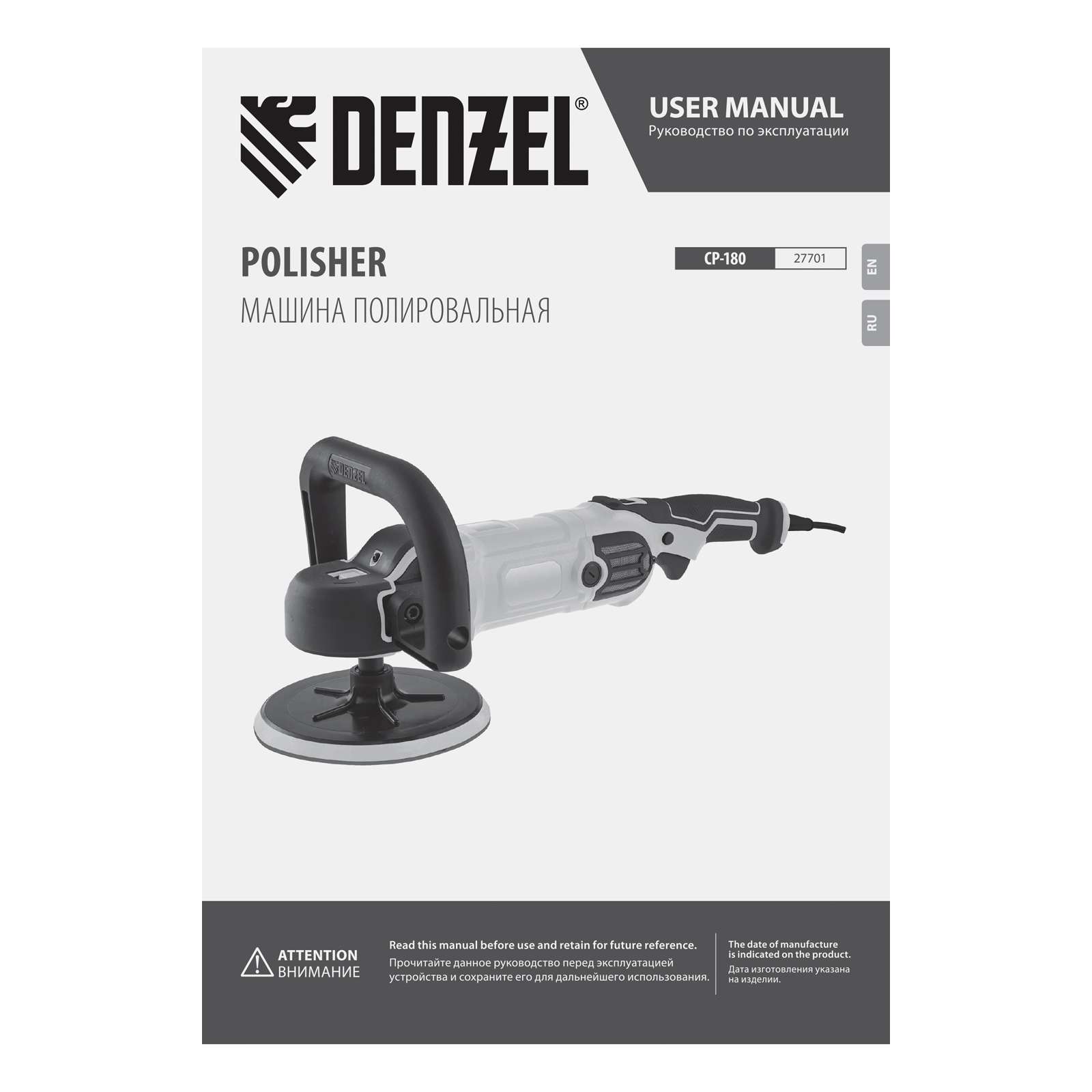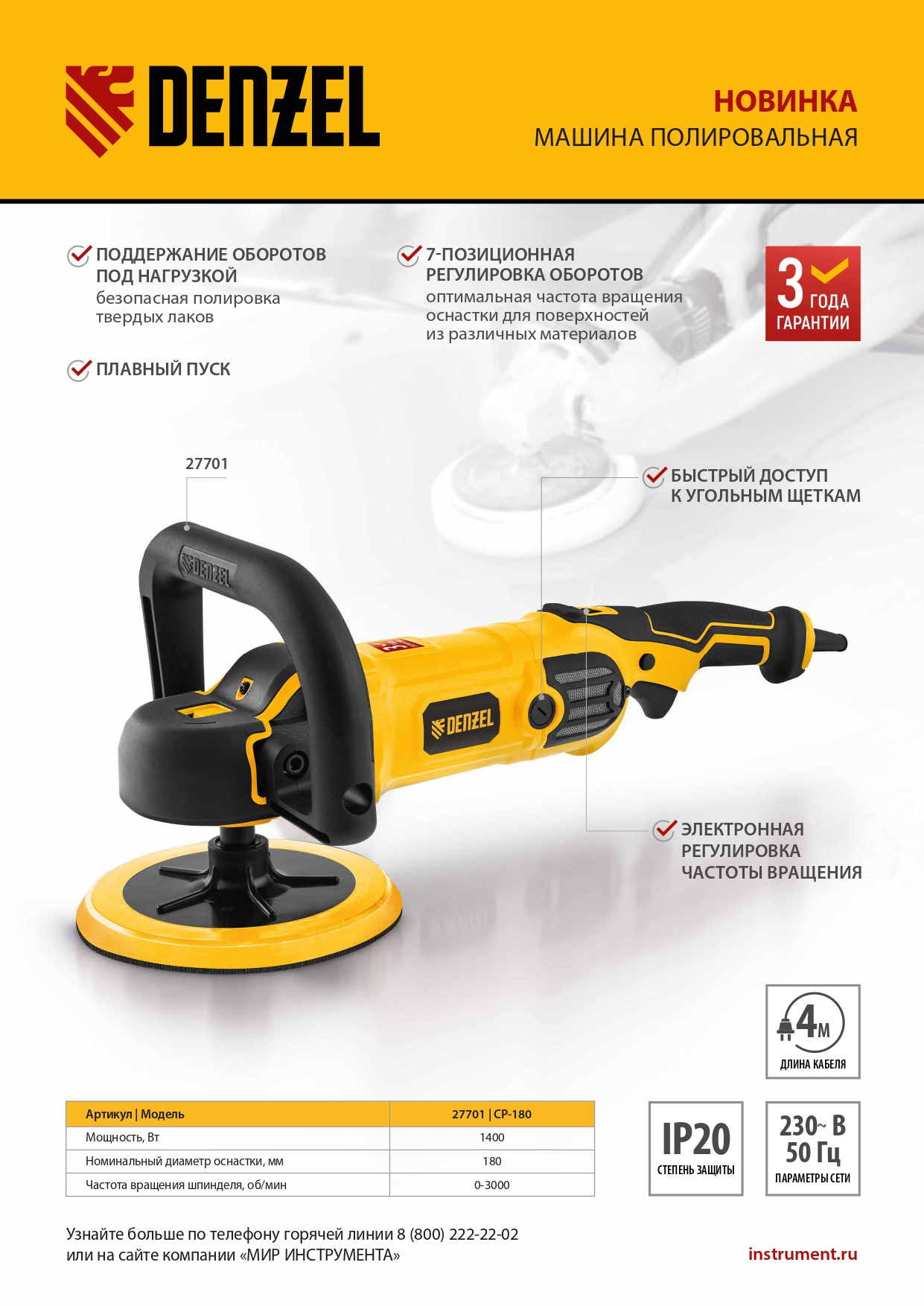 Полировальная машина Denzel CP-180 27701 мощностью 1400 Вт обеспечивает частоту вращения шпинделя 0-3000 об/мин и совместима с оснасткой диаметром 180 мм. Используется для снятия старого лакокрасочного покрытия, подготовки поверхности к покраске и финишной полировки лакированных, деревянных и других поверхностей, придает им гладкость и блеск. Благодаря 7-позиционной регулировке оборотов можно выбрать оптимальный режим для обработки поверхностей из различных материалов. Машина пригодится в мастерской и на СТО.ПреимуществаПлавный пуск — инструмент включается без рывка и не создает резкой нагрузки на электросеть.Комфортная работа — фиксация кнопки пуска избавляет от необходимости постоянно удерживать ее.Точность и эффективность — электронная регулировка частоты вращения в диапазоне 0-3000 об/мин позволяет точно подобрать нужный режим работы, ориентируясь на тип обрабатываемой поверхности. Высокое качество выполняемых работ — функция поддержания оборотов под нагрузкой обеспечивает безопасную полировку твердых лаков.Свободное перемещение по рабочей зоне — длина сетевого кабеля составляет 4 м, что особенно удобно при полировке кузова автомобиля.Готовность к использованию — в комплект поставки входят 2 полировальные насадки.Простое обслуживание — производитель предусмотрел быстрый доступ к угольным щеткам.Гарантия 3 года — надежность инструмента подтверждена производителем.